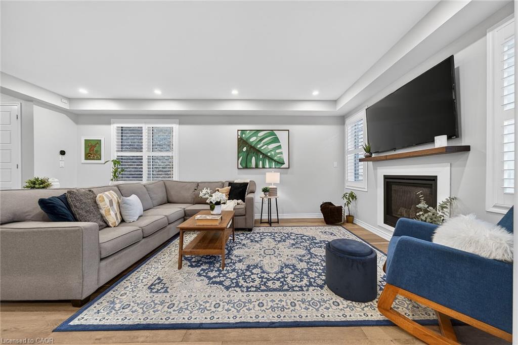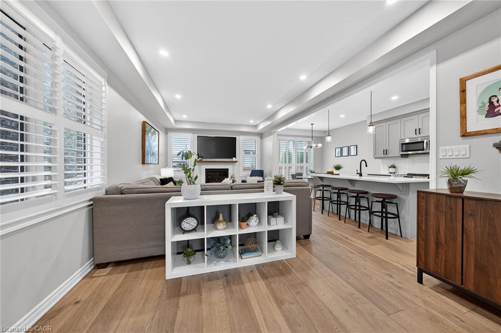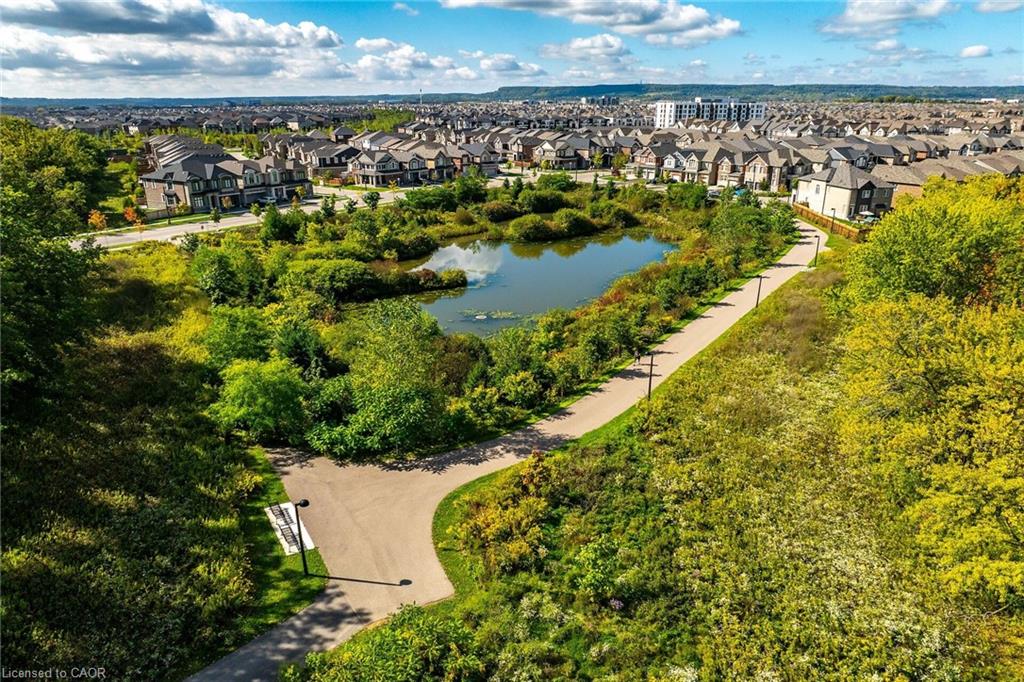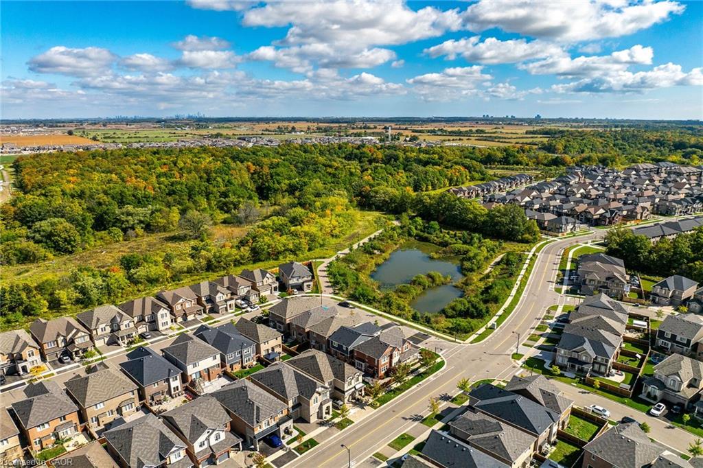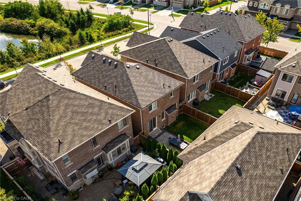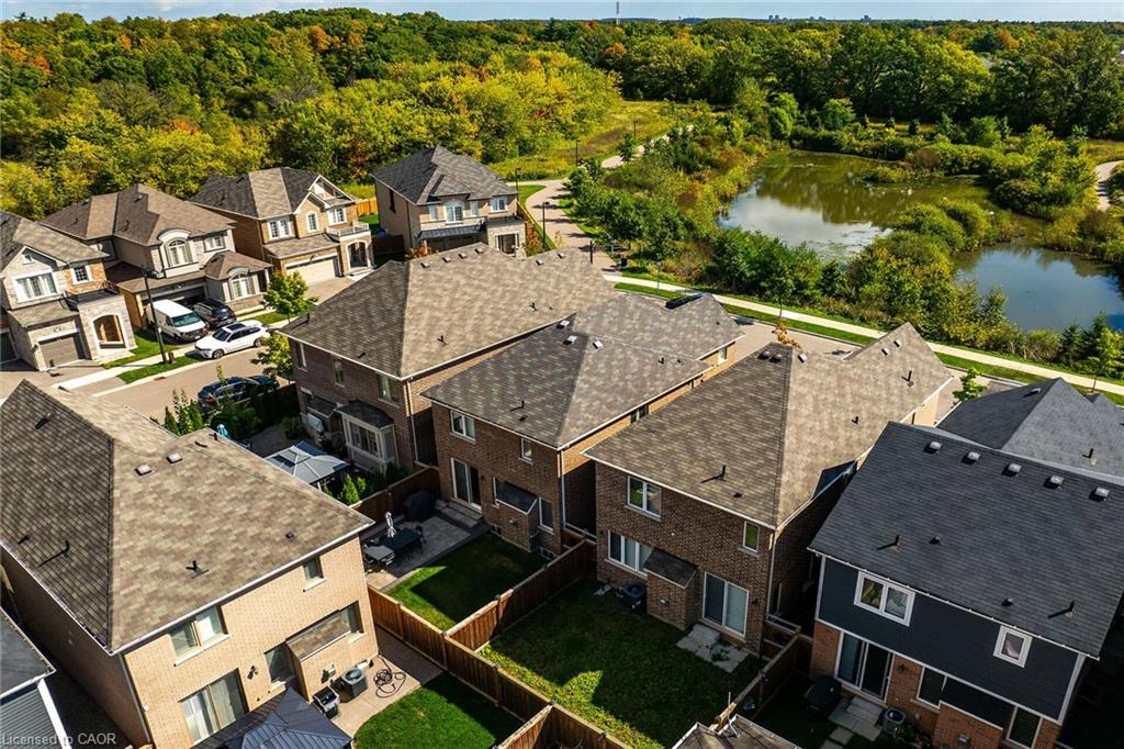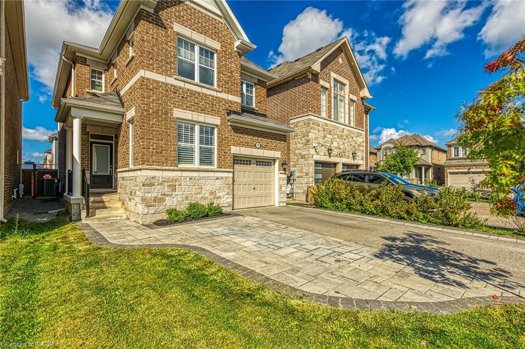 Charming detached home in a highly desirable Milton neighbourhood overlooking the pond and steps to 16 Mile Creek and scenic walking trails. This 4+1 bedroom, 3 bathroom home offers a spacious open-concept layout with wide plank hardwood floors, a modern kitchen with breakfast bar, dining area, and bright living room with cozy fireplace. Upstairs features four generously sized bedrooms, including a primary suite with large walk-in closet and spacious ensuite. The unspoiled basement with large windows offers excellent potential for additional living space. Enjoy professionally completed patio hardscaping (2022) in the front and backyard-providing parking for two additional cars and a great outdoor setting for relaxing or entertaining.