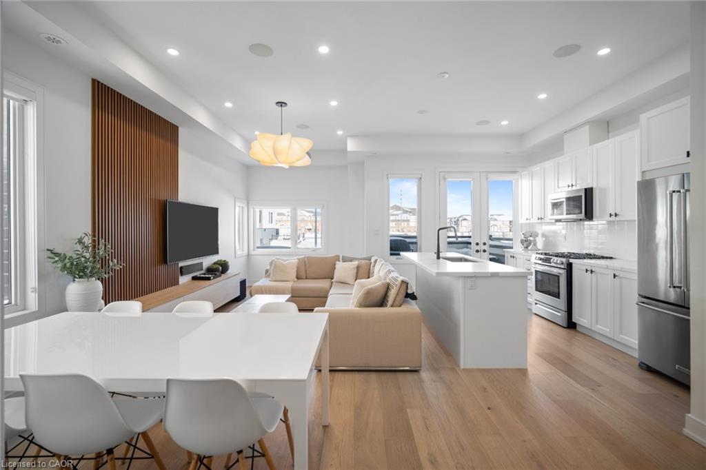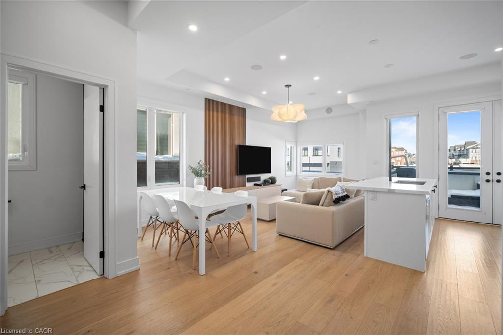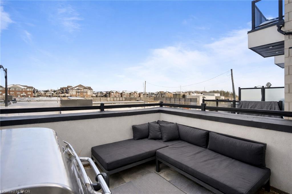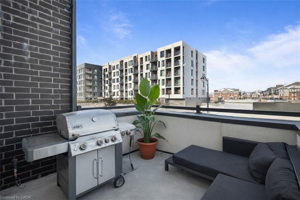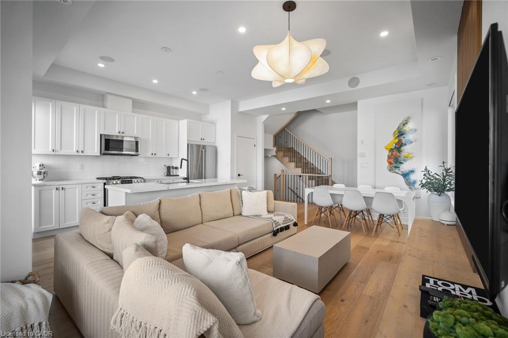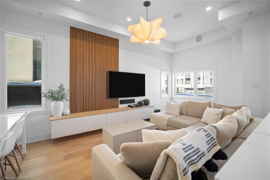 Freehold end-unit townhouse that feels like a 5 star resort as soon as you walk in! This sun-drenched home features wide-plank hardwood flooring throughout and an open-concept layout designed for both comfort and style. Soaring 10-ft ceilings on the main level enhance the sense of space, while thoughtful details include custom built-in closets in every bedroom, main floor built in speakers and designer lighting throughout. This home offers three spacious bedrooms and three well-appointed bathrooms. Enjoy seamless indoor-outdoor living with a large private balcony, complete with a gas line for summer BBQs and entertaining. A truly move-in-ready residence that blends simplicity, function, and beauty in one exceptional package.