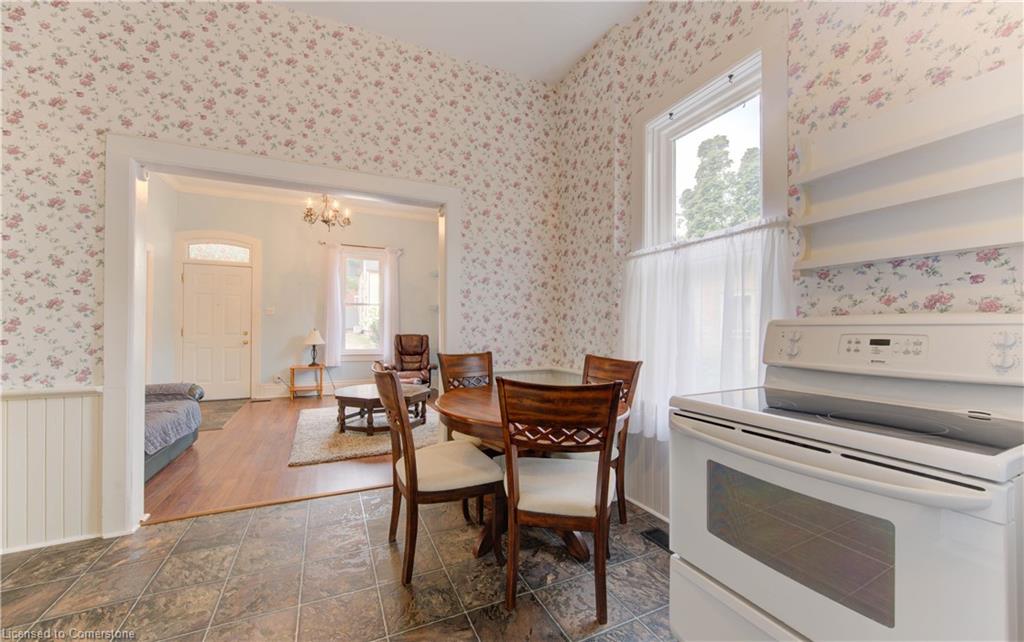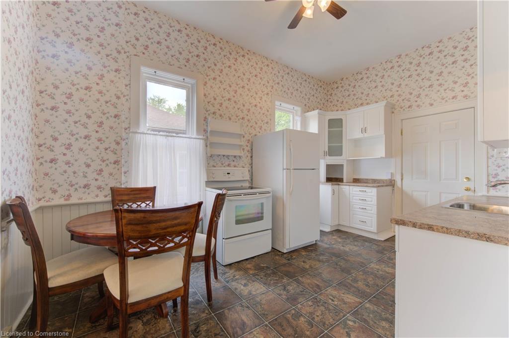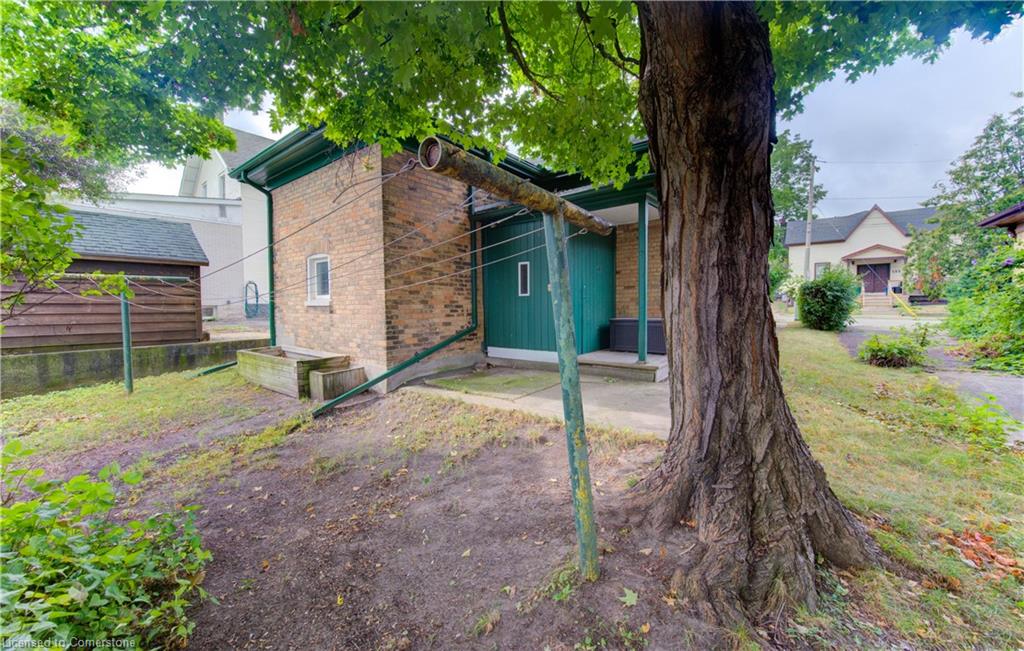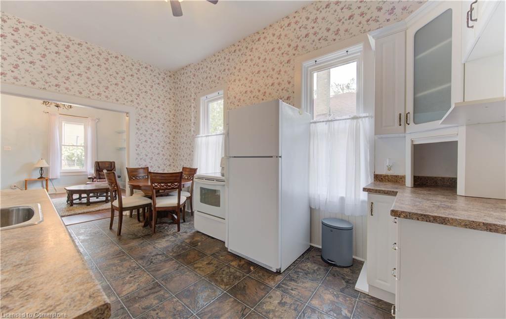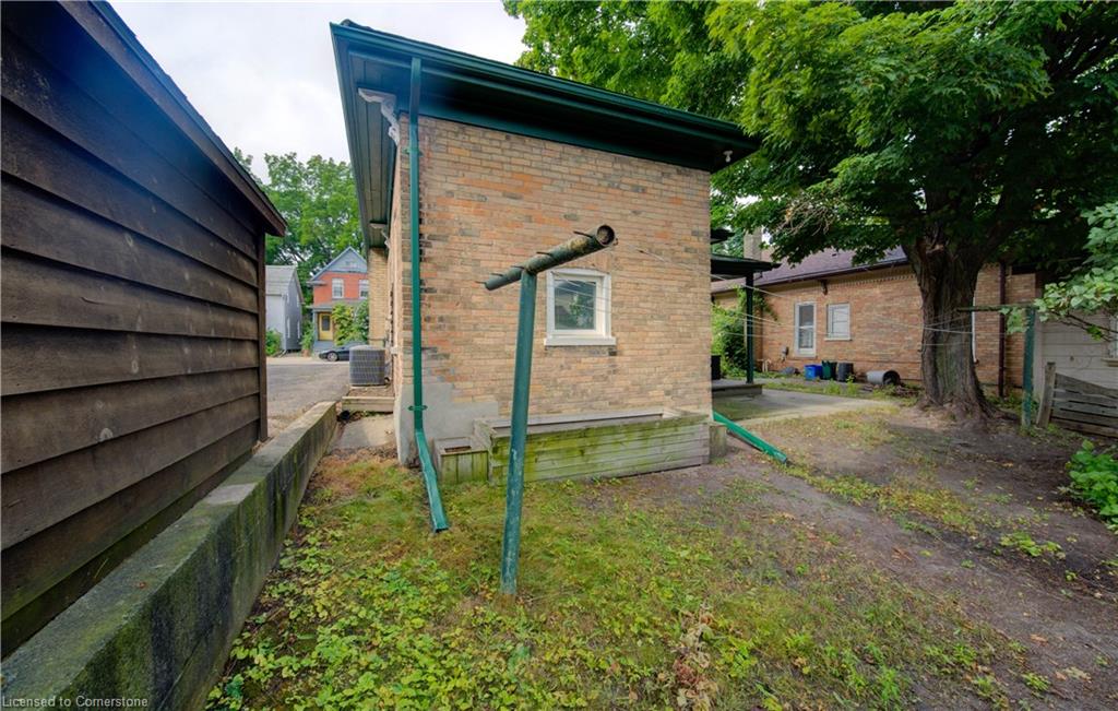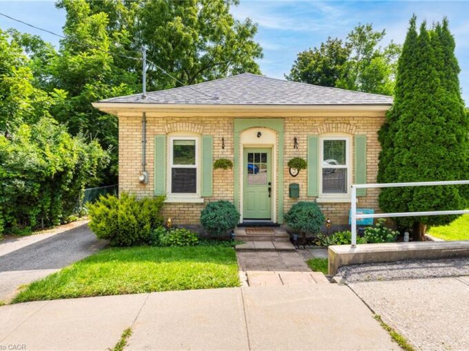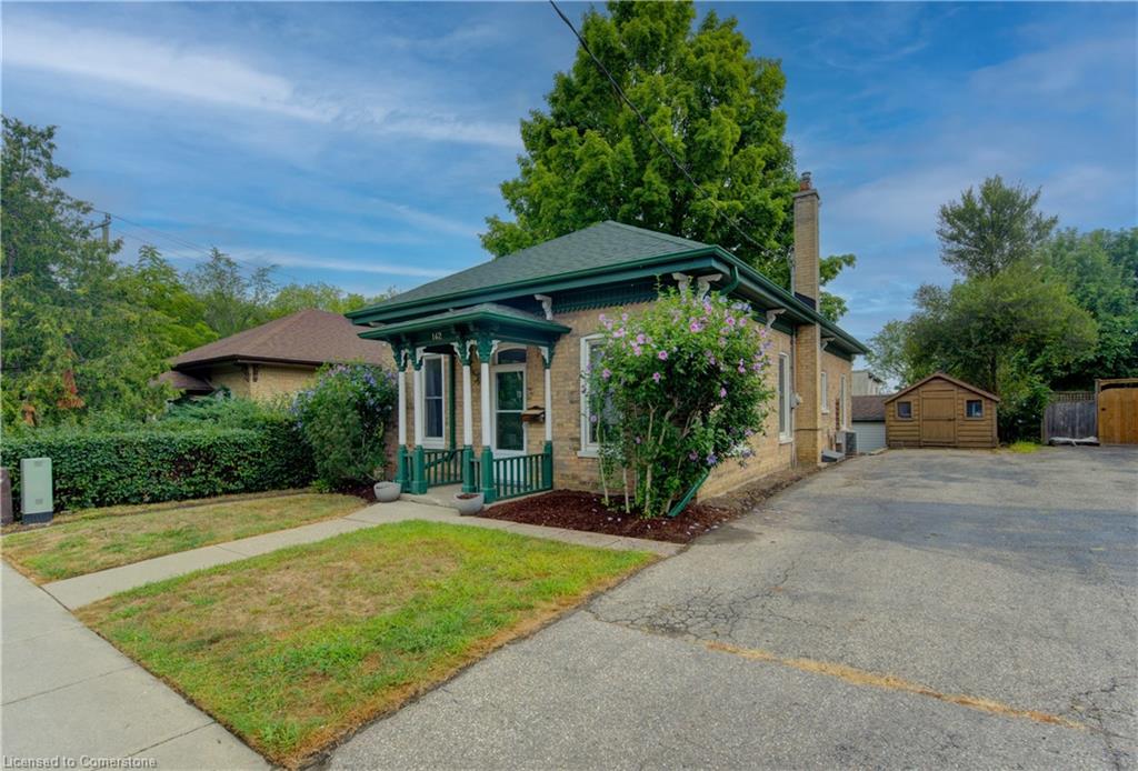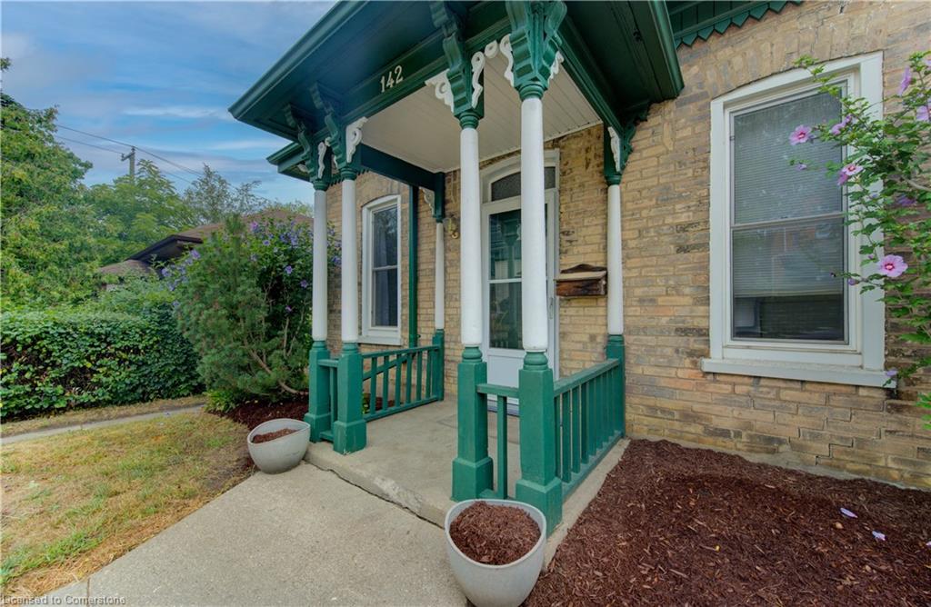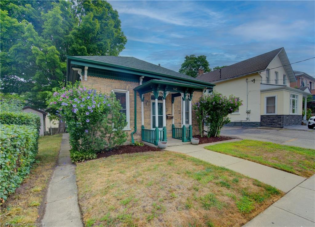 Welcome to 142 Church Street – Where Charm Meets Possibility! Own this single detached home for less than a condo! Own this piece of history in one of Kitchener’s oldest homes, built in 1855 and lovingly maintained and updated. Nestled in a mature Kitchener neighborhood, this solid brick bungalow blends timeless Regency-style architecture and the central front door, flanked by large windows, welcomes you into a single-storey residence that reflects the grace of its era. A charming veranda with trellis-like supports adds curb appeal and a perfect spot to enjoy quiet mornings or evening sunsets. Inside, soaring 10 and a half foot ceilings create an airy, open feel, while the living room sets the tone for cozy evenings and casual gatherings. Natural light pours through updated vinyl windows, including distinctive Gothic-style panes that add character. The eat-in kitchen offers white cabinetry. Whether you are sipping morning coffee or preparing a family meal, this space is both functional and welcoming. Two bedrooms provide flexibility for families and guests. Office may also be used as third bedroom. A four-piece bath is conveniently located, and the basement includes newer laundry appliances and an owned water heater. The home features a Carrier furnace, central air, and a 125 AMP electrical panel ready for EV upgrades. Roof is approximately 10 years old. Outside, enjoy a low-maintenance yard with a charming patio and a handy shed with little upkeep required, making this an ideal retreat for those who value simplicity and peace. Whether you’re starting out, settling down, or investing wisely, 142 Church Street is an easy place to call home.
