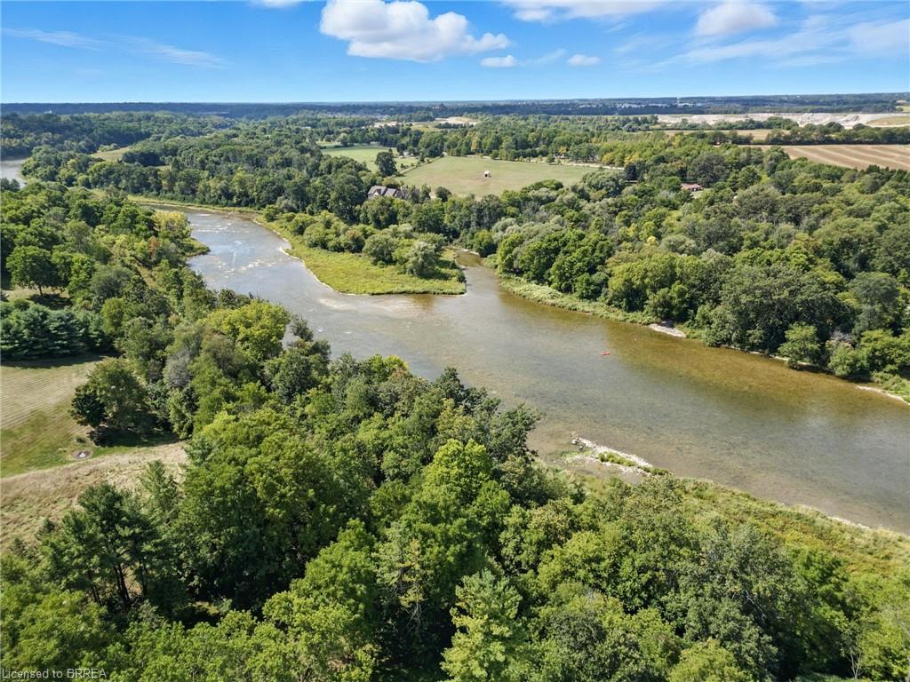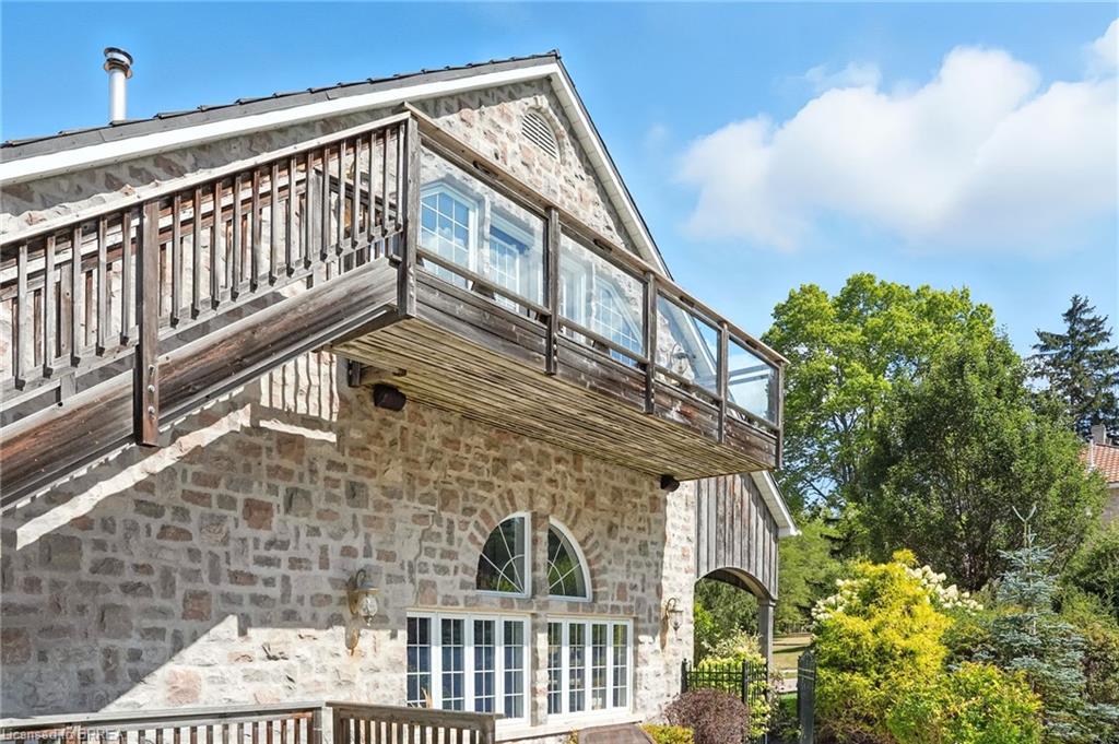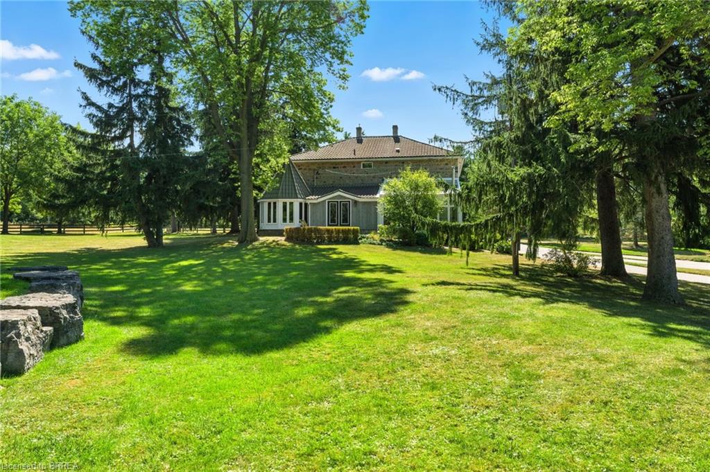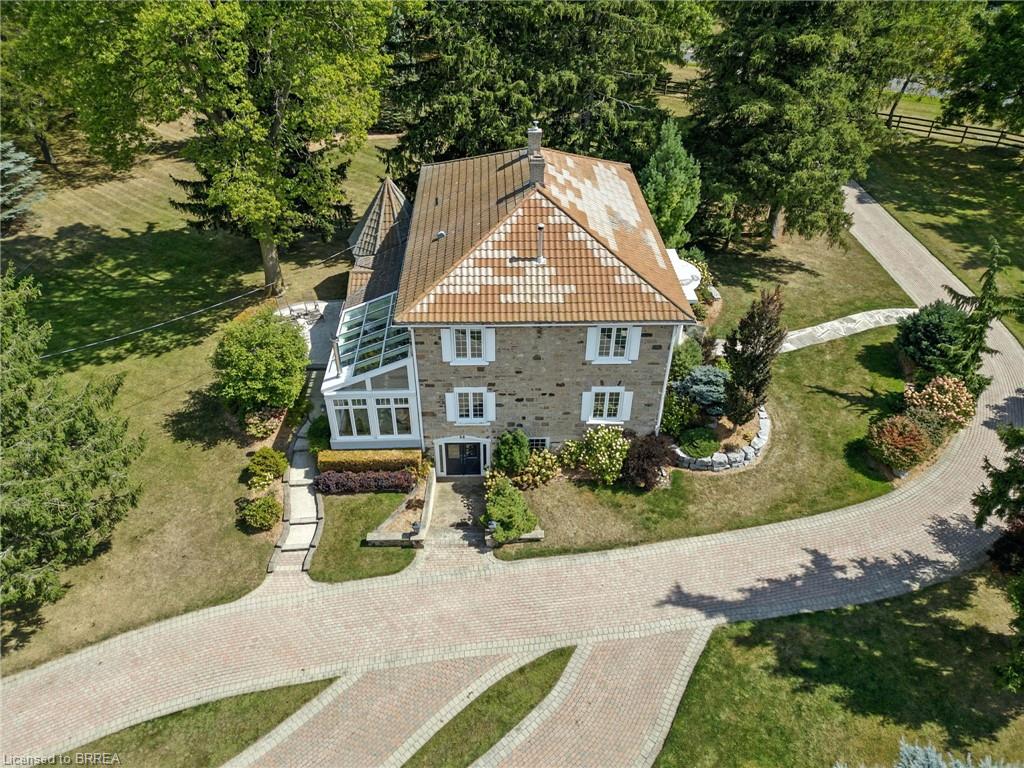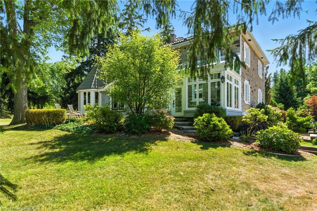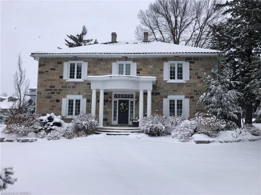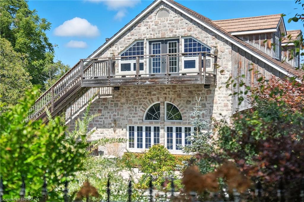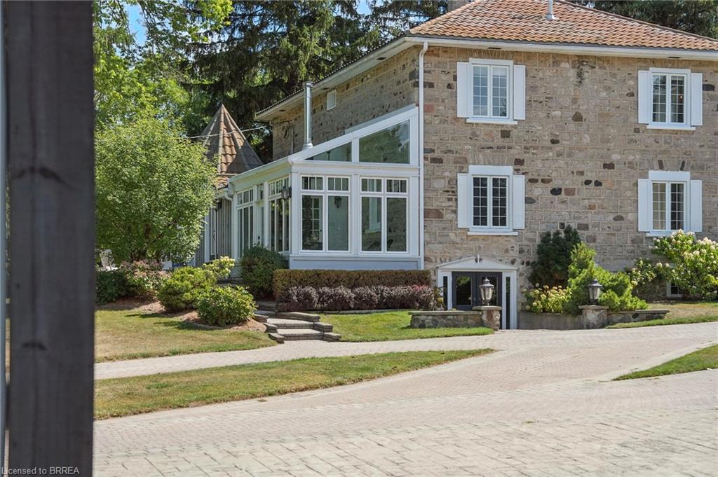 Here is your opportunity to own a piece of history on the Grand River in Paris, Ontario. This 2-story, Landmark, georgian style, original stone home is One of a Kind! Sitting on over 3 acres in a picture perfect setting. An abundance of trees creates natural privacy. This stately home features large windows deeply set within thick stone walls, open stone feature walls, large baseboards and original archways that highlight past workmanship. This home has had many renovations including upgraded attic insulation, newer furnace and water heater as well as updates and/or complete renovations to most rooms. Including two ensuites, the house has total 5 bathrooms. The home includes a finished basement with both inside and outside entries and has potential in-law capability. Bedrooms are large and two have ensuites. The open kitchen/living area has large island, reclaimed hardwood floors, propane wood stove and separate pantry. The added sunroom has its own heat and air conditioning as well as a wood burning stove. The home has total of 4 fireplaces. On hot days, enjoy a dip in the large inground swimming pool which is located off the custom built garage with upper living space. The garage easily fits 4 or more cars, has heat and a/c and features a large upper living space with 2 pc bath. This building could easily be converted to separate residence. Beyond this, a lane leads to the walking trail and river, with access to the water for fishing or canoeing. Poolhouse has its own 2 pc bath as well, and another storage shed also on the property. Abutting property, 7.6 acres with two large buildings, same owner, is also available if purchased in combination.
