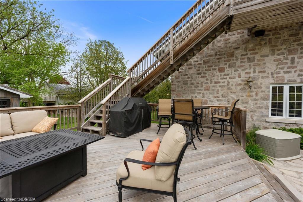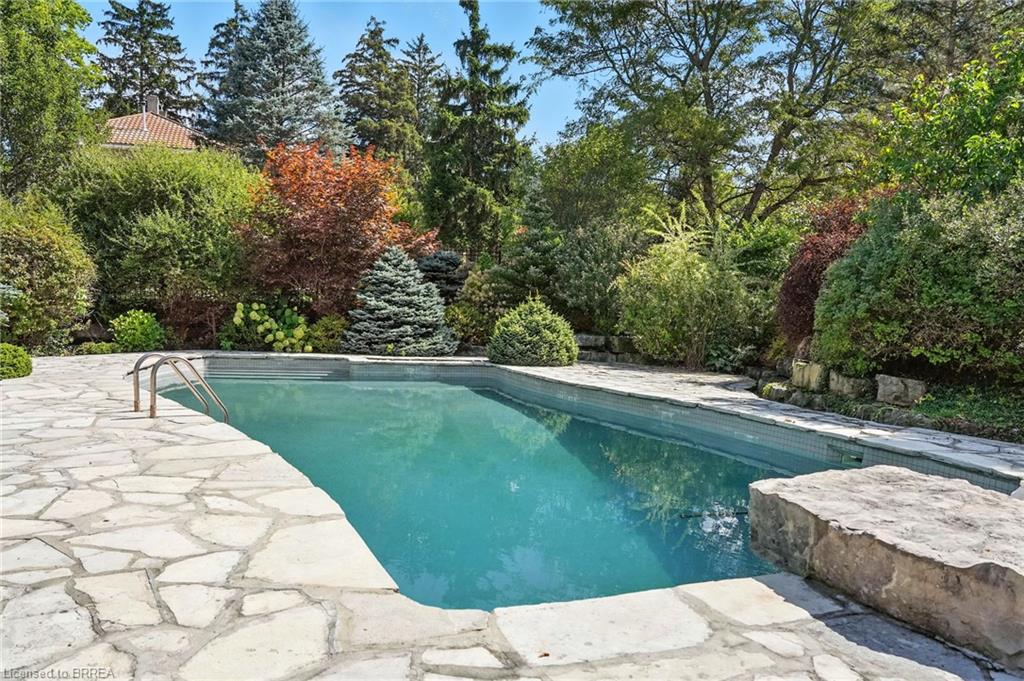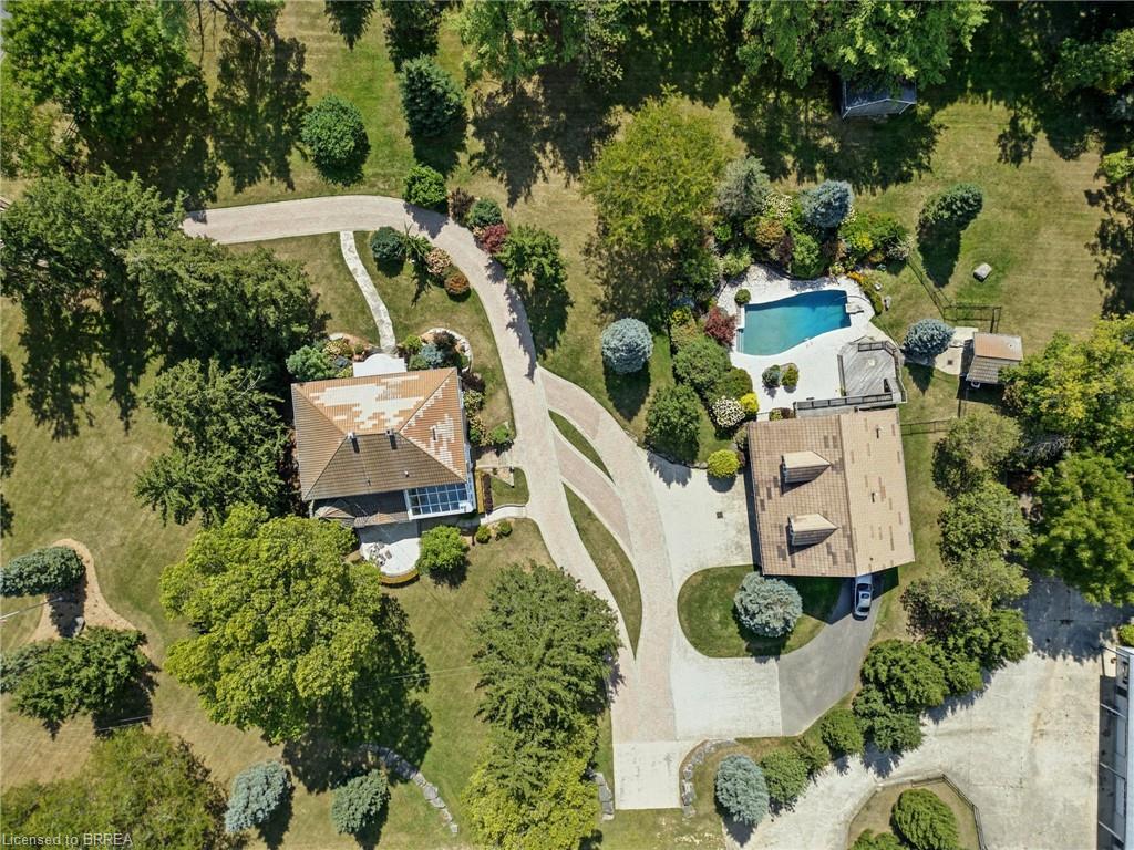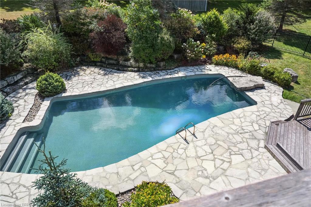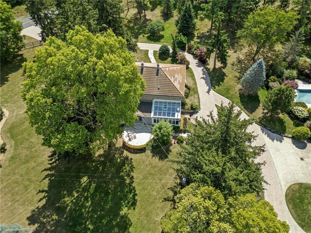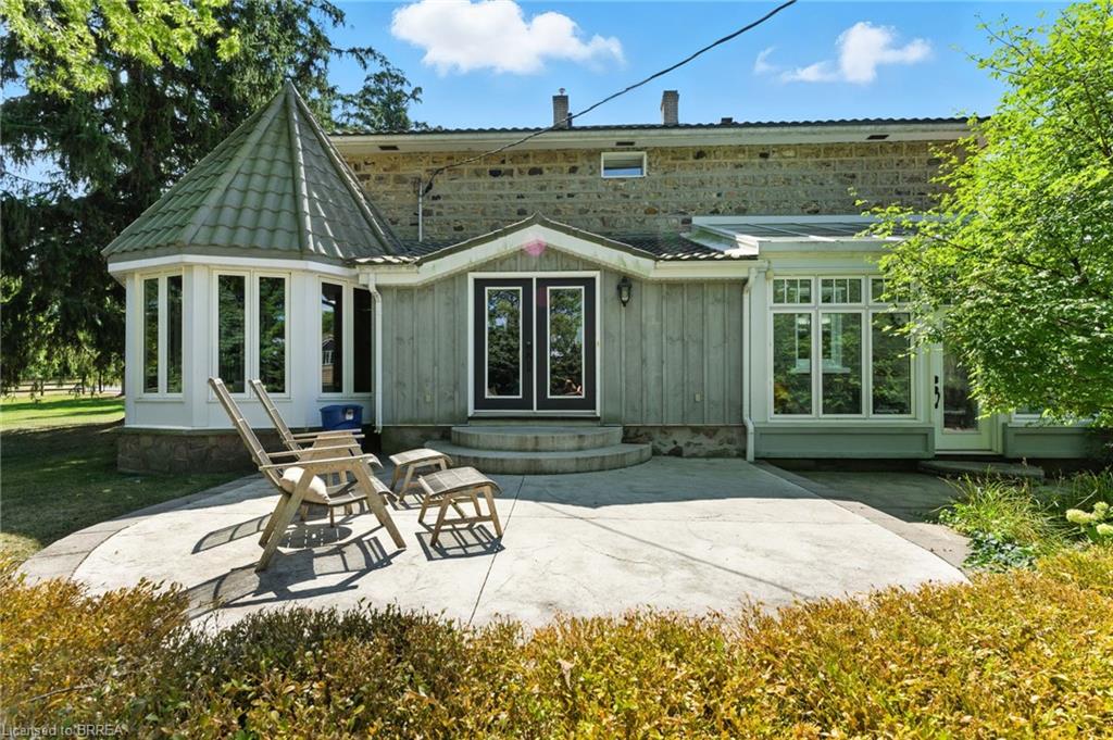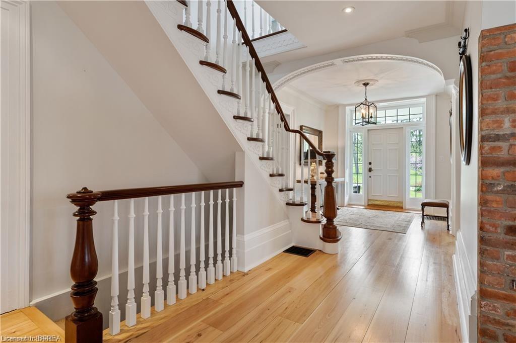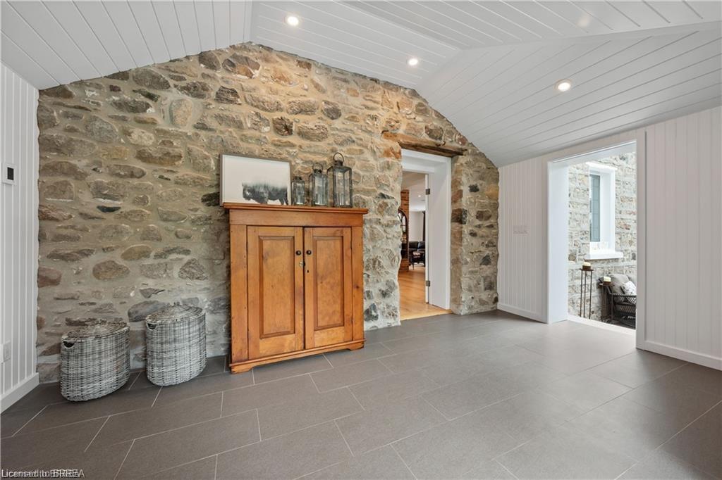 Here is your opportunity to own a piece of history on the Grand River in Paris, Ontario. This 2-story, Landmark, georgian style, original stone home is One of a Kind! Sitting on over 3 acres in a picture perfect setting. An abundance of trees creates natural privacy. This stately home features large windows deeply set within thick stone walls, open stone feature walls, large baseboards and original archways that highlight past workmanship. This home has had many renovations including upgraded attic insulation, newer furnace and water heater as well as updates and/or complete renovations to most rooms. Including two ensuites, the house has total 5 bathrooms. The home includes a finished basement with both inside and outside entries and has potential in-law capability. Bedrooms are large and two have ensuites. The open kitchen/living area has large island, reclaimed hardwood floors, propane wood stove and separate pantry. The added sunroom has its own heat and air conditioning as well as a wood burning stove. The home has total of 4 fireplaces. On hot days, enjoy a dip in the large inground swimming pool which is located off the custom built garage with upper living space. The garage easily fits 4 or more cars, has heat and a/c and features a large upper living space with 2 pc bath. This building could easily be converted to separate residence. Beyond this, a lane leads to the walking trail and river, with access to the water for fishing or canoeing. Poolhouse has its own 2 pc bath as well, and another storage shed also on the property. Abutting property, 7.6 acres with two large buildings, same owner, is also available if purchased in combination.