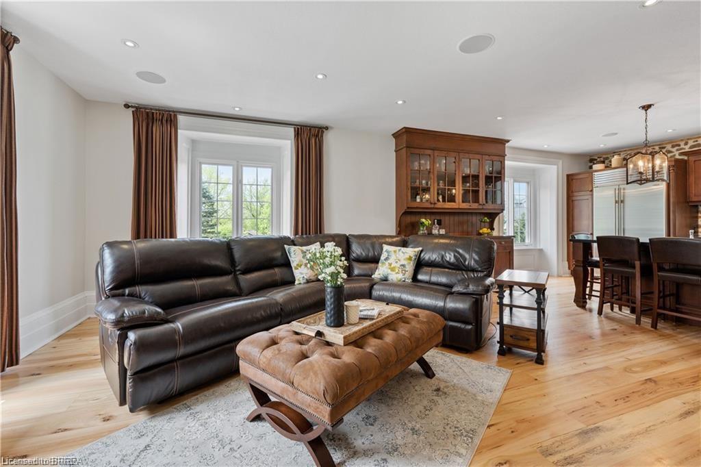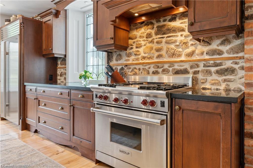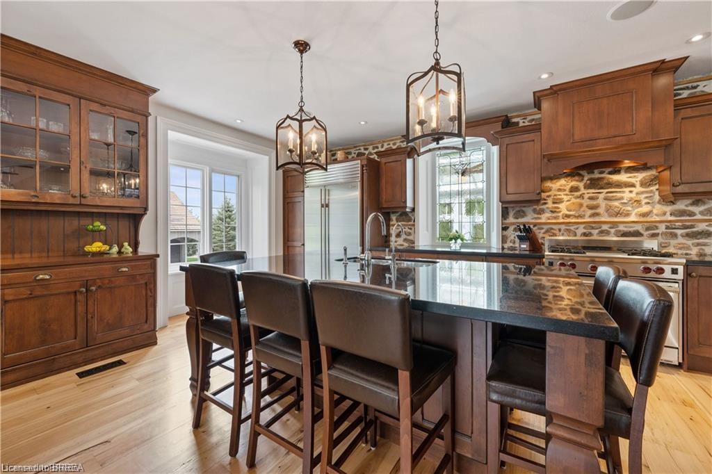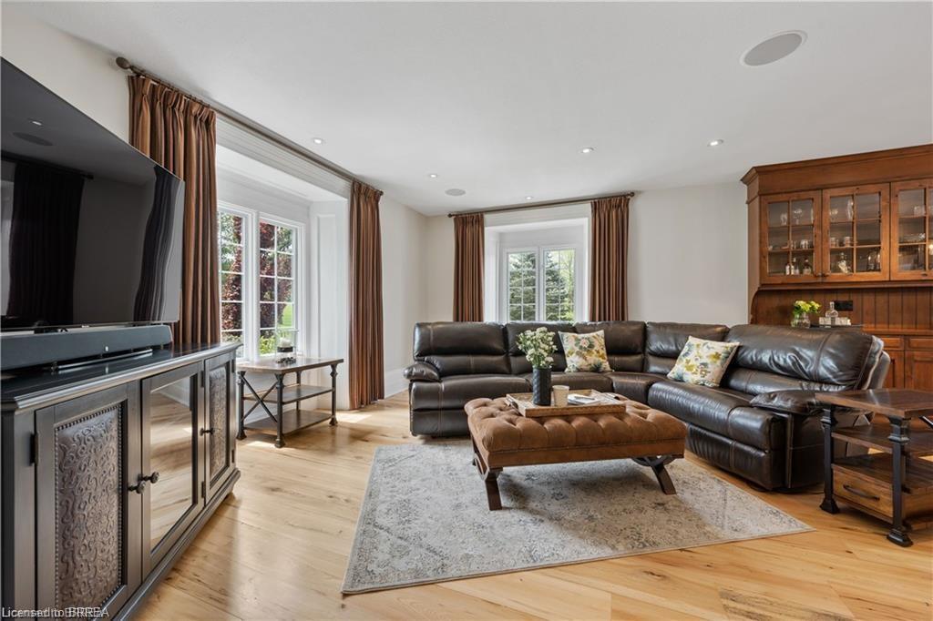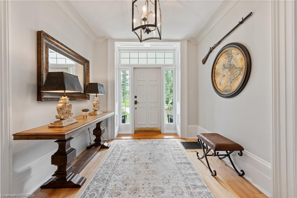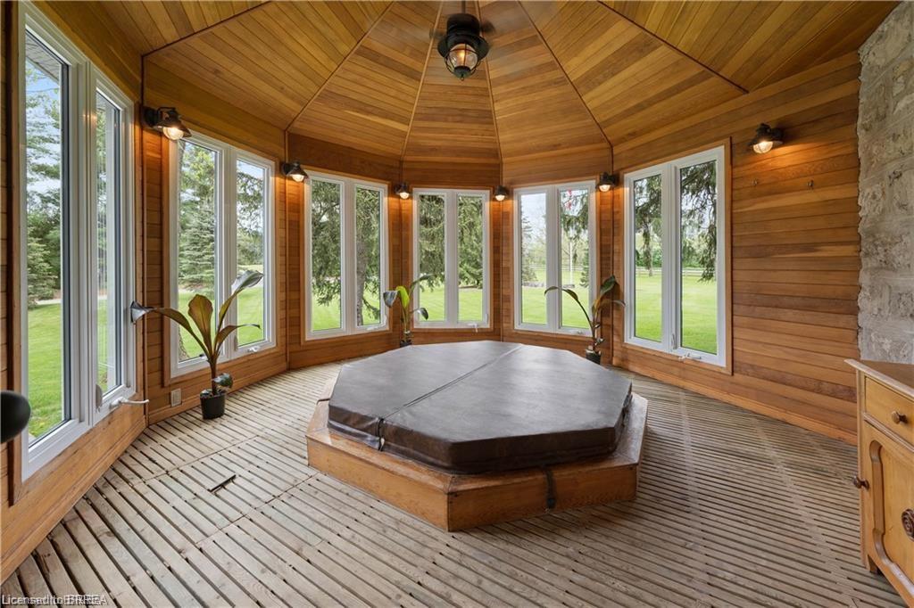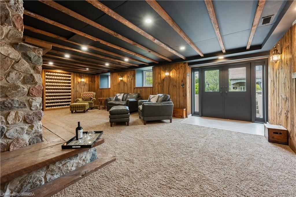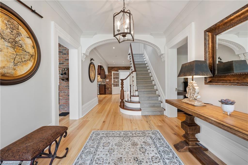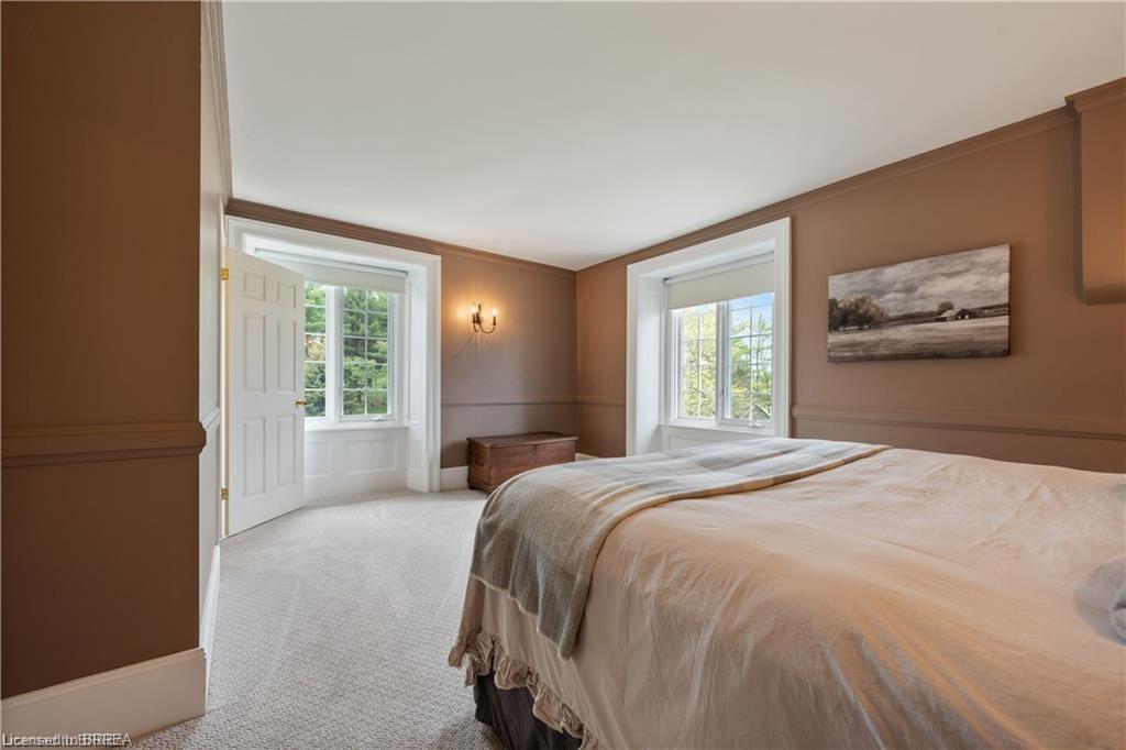 Here is your opportunity to own a piece of history on the Grand River in Paris, Ontario. This 2-story, Landmark, georgian style, original stone home is One of a Kind! Sitting on over 3 acres in a picture perfect setting. An abundance of trees creates natural privacy. This stately home features large windows deeply set within thick stone walls, open stone feature walls, large baseboards and original archways that highlight past workmanship. This home has had many renovations including upgraded attic insulation, newer furnace and water heater as well as updates and/or complete renovations to most rooms. Including two ensuites, the house has total 5 bathrooms. The home includes a finished basement with both inside and outside entries and has potential in-law capability. Bedrooms are large and two have ensuites. The open kitchen/living area has large island, reclaimed hardwood floors, propane wood stove and separate pantry. The added sunroom has its own heat and air conditioning as well as a wood burning stove. The home has total of 4 fireplaces. On hot days, enjoy a dip in the large inground swimming pool which is located off the custom built garage with upper living space. The garage easily fits 4 or more cars, has heat and a/c and features a large upper living space with 2 pc bath. This building could easily be converted to separate residence. Beyond this, a lane leads to the walking trail and river, with access to the water for fishing or canoeing. Poolhouse has its own 2 pc bath as well, and another storage shed also on the property. Abutting property, 7.6 acres with two large buildings, same owner, is also available if purchased in combination.