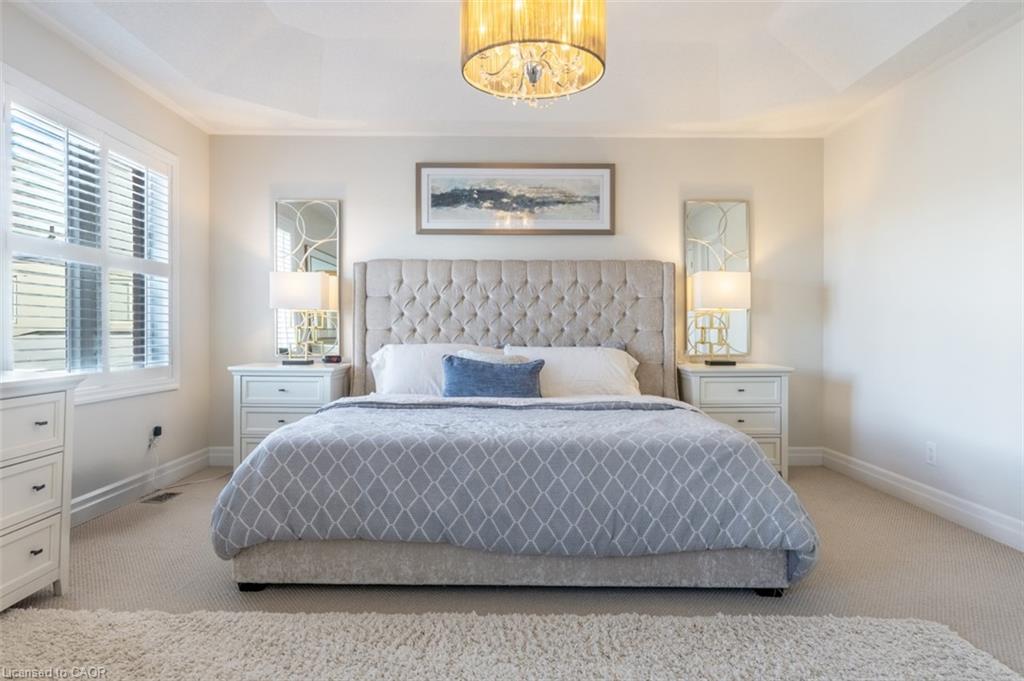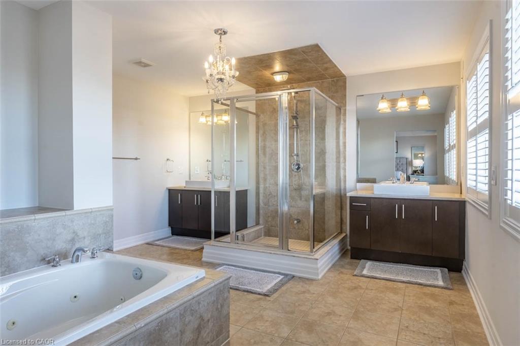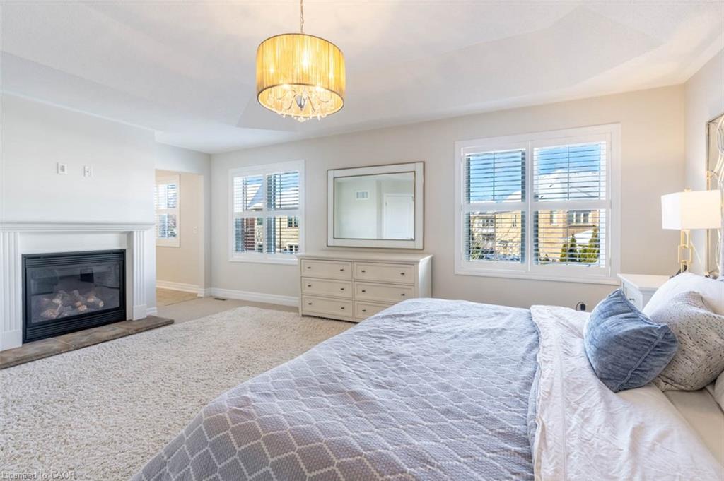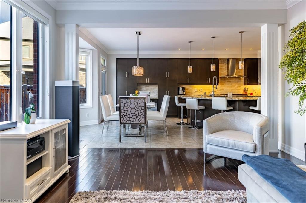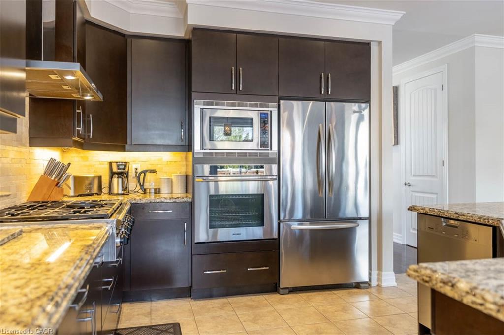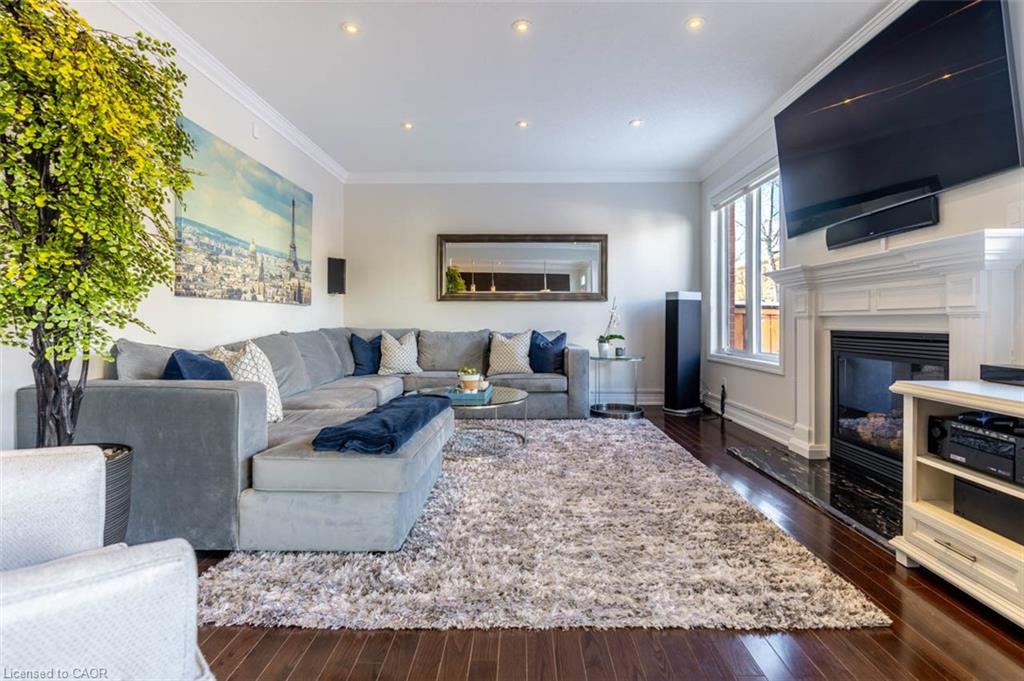 Step into this executive Heathwood home in Milton’s sought-after Scott neighbourhood, offering almost 3,300 square feet of thoughtful design, timeless finishes, and family-friendly space. The main floor welcomes you with a sunken foyer, nine-foot ceilings, rich oak flooring, coffered and crown-detailed formal rooms, a private office, and a warm family room centred around a gas fireplace. The kitchen is the heart of the home, featuring granite counters, an island with a breakfast bar, a stone backsplash, built-in pantries, and premium Dacor appliances. Upstairs, four spacious bedrooms each enjoy direct access to a bathroom, including a generous primary retreat with a tray ceiling, gas fireplace, custom walk-in closet, and a relaxing ensuite with two vanities, a jetted tub, and a glass shower. The finished basement expands your living space with a rec room, built-in media wall, bar-height seating, a full bathroom, and plenty of storage, with potential for a future side entrance thanks to the wide side yard. Outside, enjoy a portico entry, stone walkway, a private backyard with a stone patio, and a double-wide driveway with no sidewalk. Located on a quiet street at the base of the escarpment, close to trails, top-rated schools, downtown Milton, and with quick access to the upcoming Tremaine/401 interchange, this is an opportunity to move into a prestigious neighbourhood designed for family living and everyday comfort.