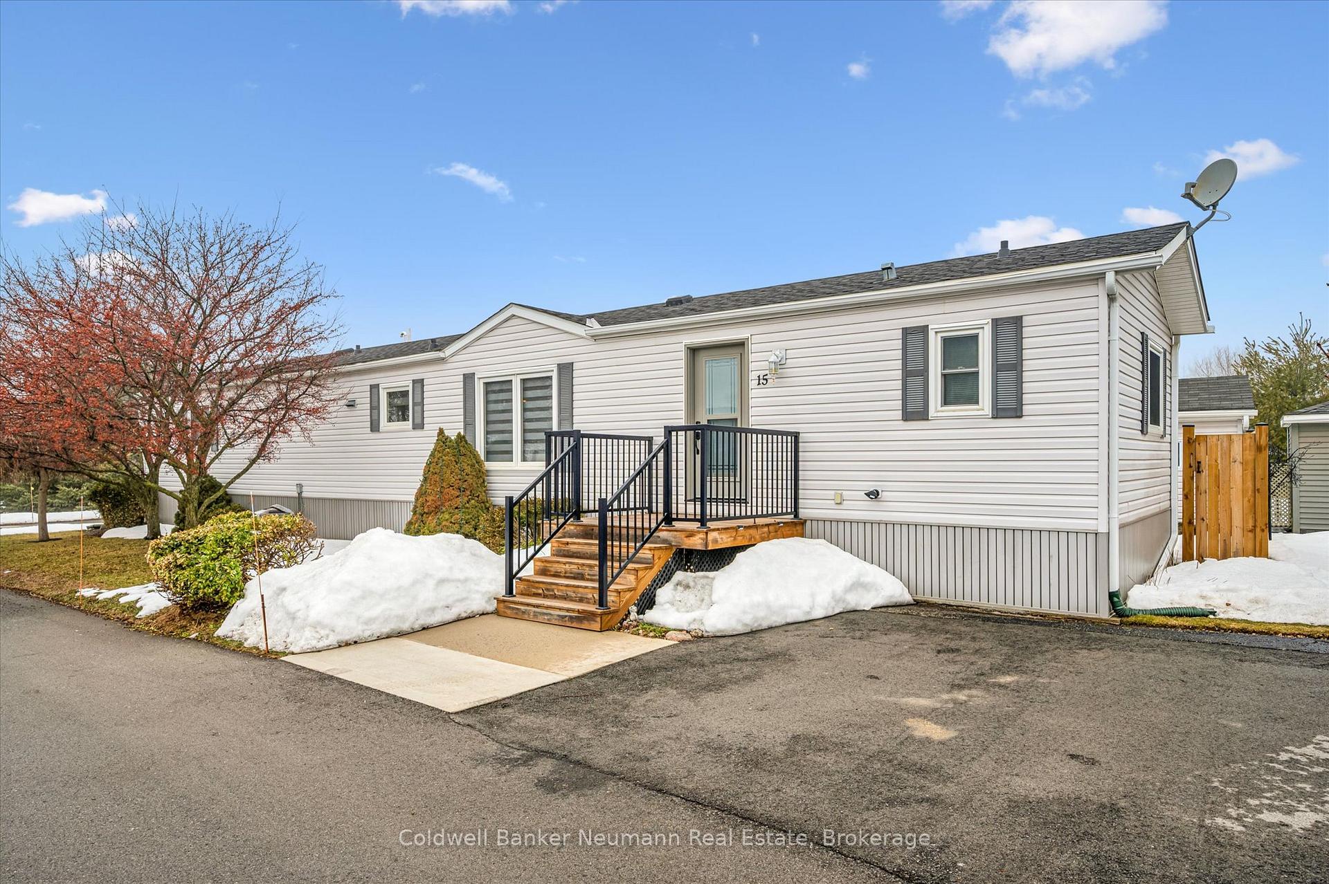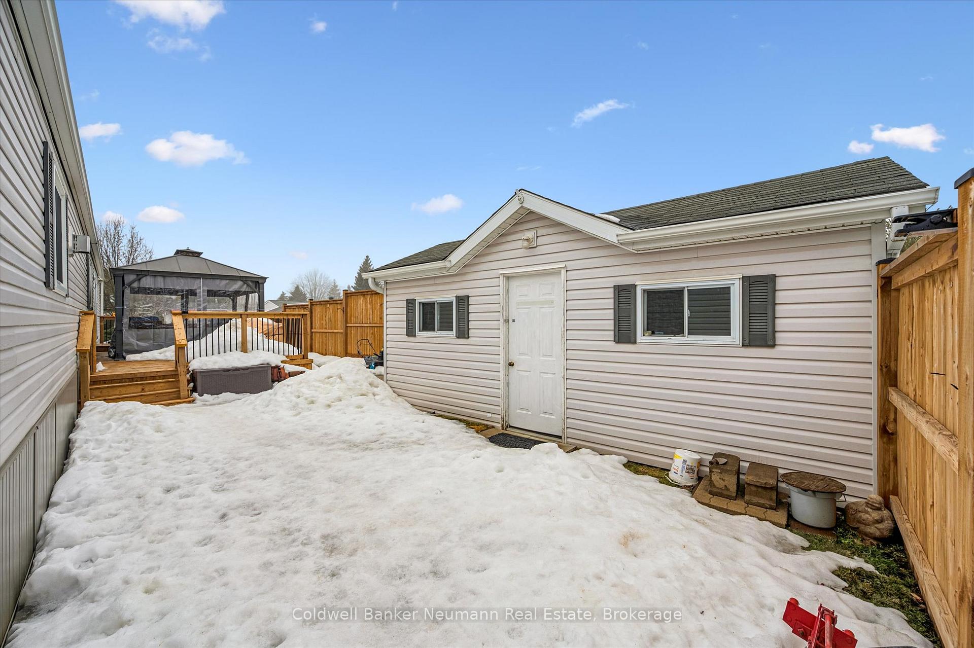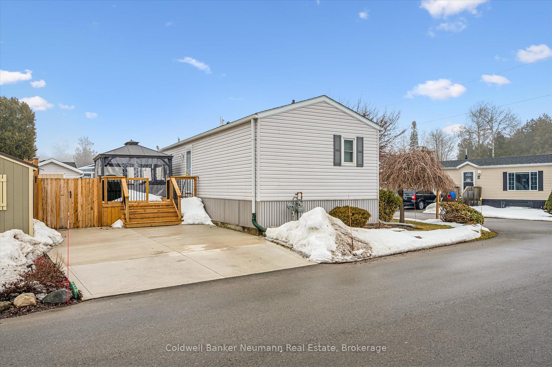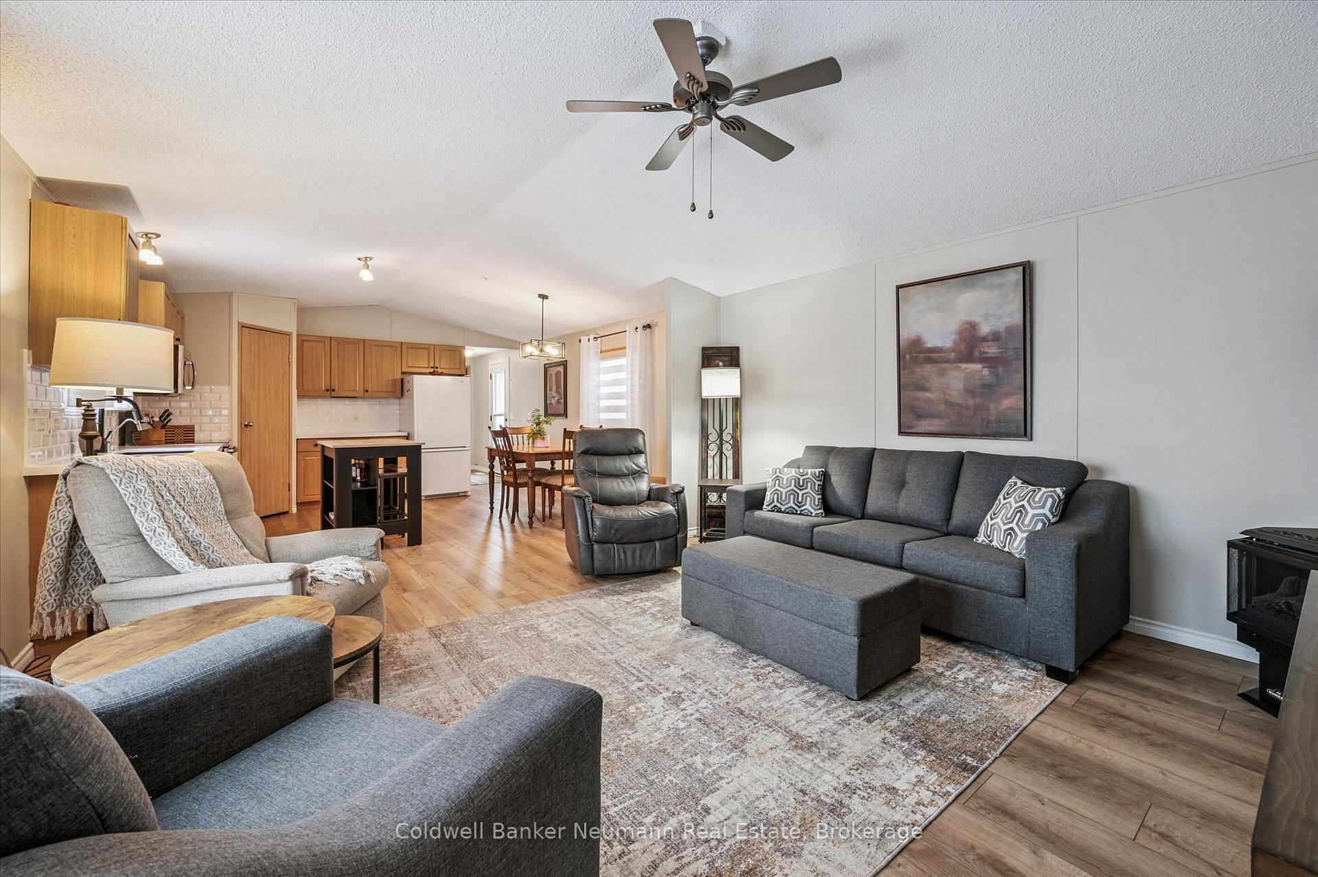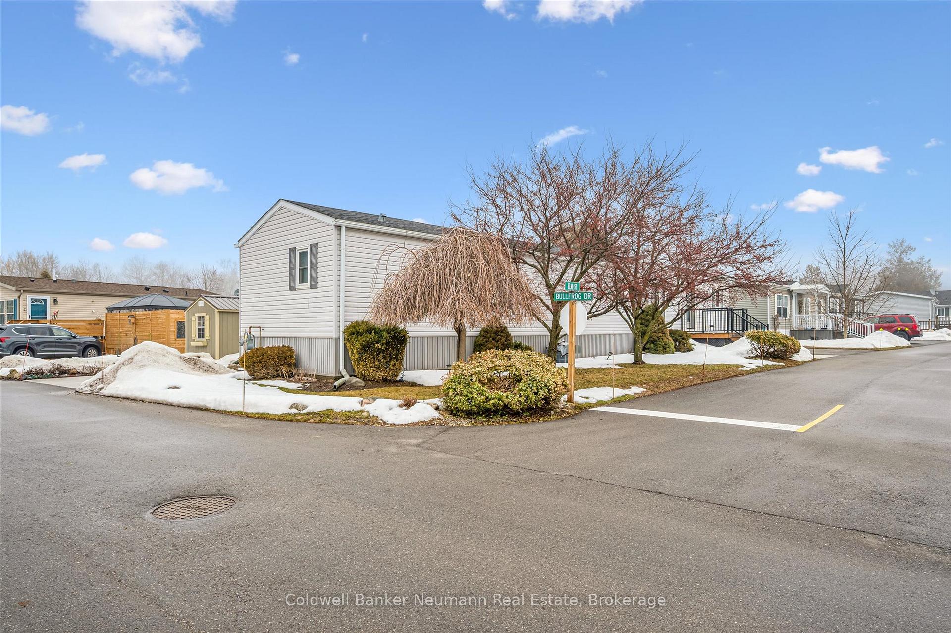 Welcome to this charming home in the sought after Mini Lakes community, ideally located on a desirable corner lot and just minutes from Highway 401, making commuting easy.This well maintained home offers 3 bedrooms and numerous updates have been completed in recent years, including new skirting/apron around the house (2020), all new windows (2021), and new LVP flooring throughout (2021). Additional upgrades include a new freestanding gas fireplace (2022), new roof shingles (2023), a new concrete driveway and walkway (2024), a new fenced backyard (2024), and a beautifully updated kitchen with quartz countertop, undermount sink, faucet, and tile backsplash (2024). The home also features new front and back doors (2025) and a new deck (2025). An insulated shed/workshop with hydro provides great space for hobbies, storage, or projects.Step outside to enjoy the outdoor patio with gazebo, extending your living space during the warmer months and creating a great space for relaxing or entertaining. The property also offers parking for up to 3 vehicles.Mini Lakes residents enjoy a vibrant lifestyle with excellent amenities including spring fed lakes and canals, a heated outdoor pool, community gardens, and scenic walking trails. Residents can also take part in activities such as fishing, swimming, bocce, darts, and card nights, making it easy to stay active and connect with neighbours.Enjoy peaceful community living with convenient access to Highway 401 and nearby amenities.