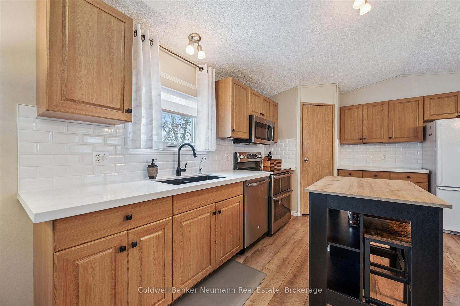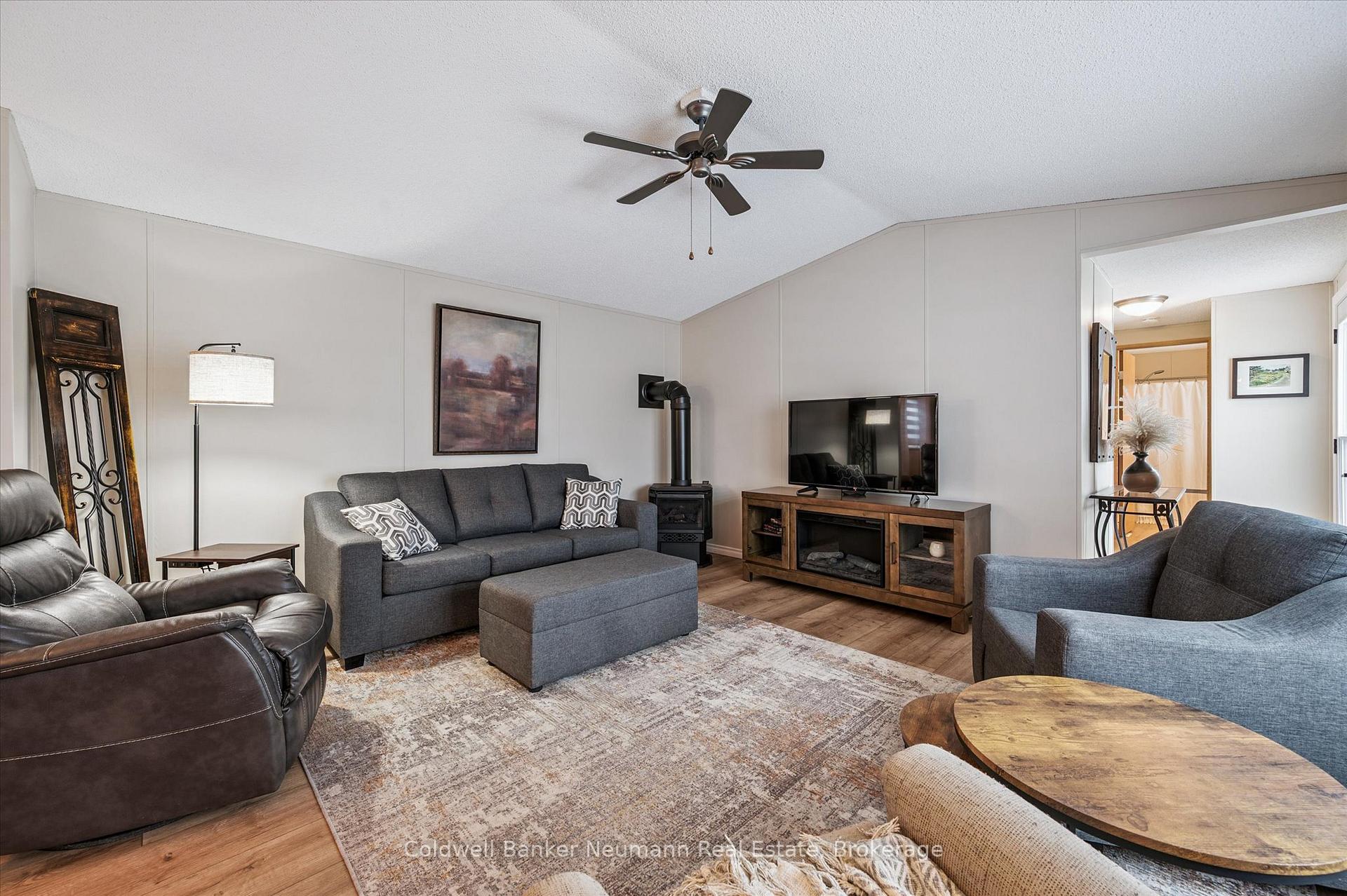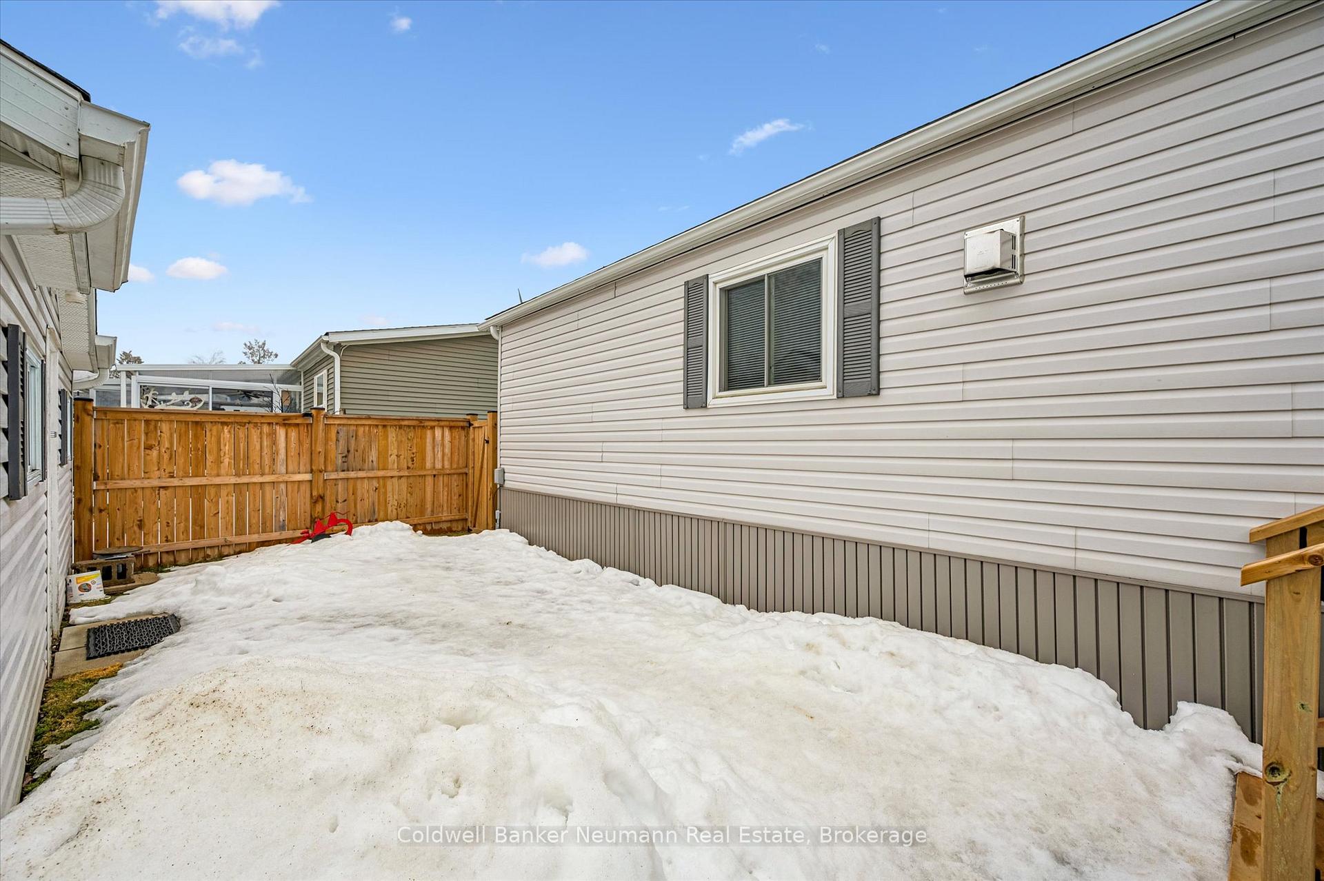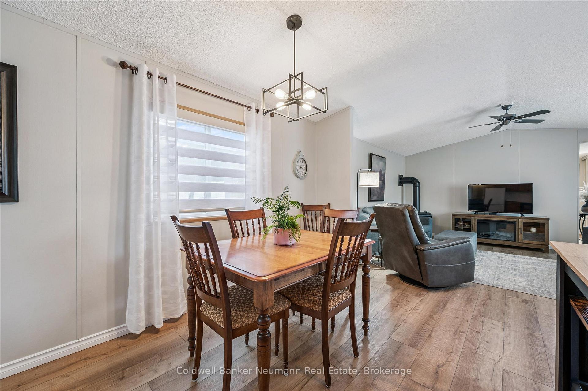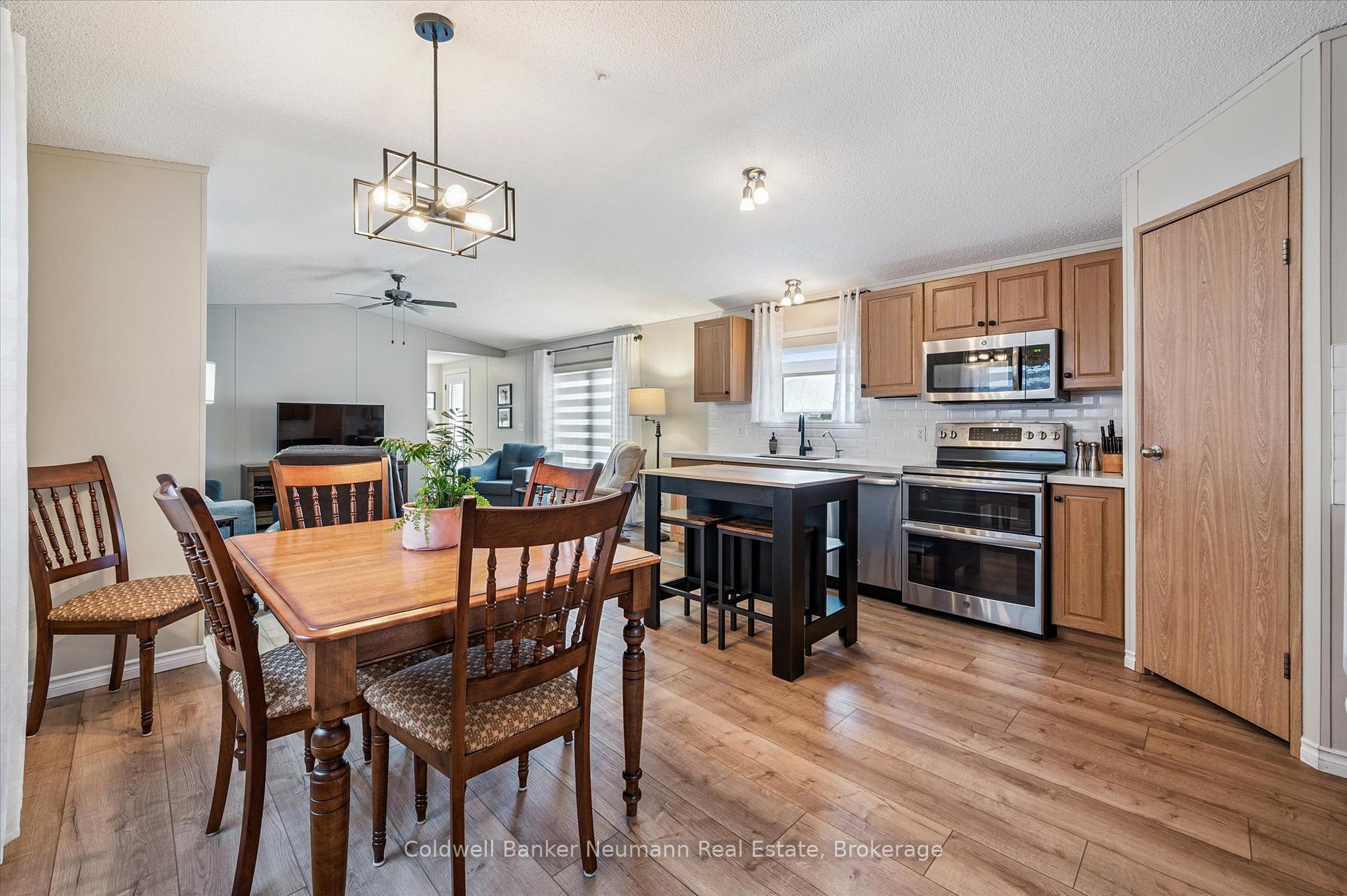 Welcome to this charming home in the sought after Mini Lakes community, ideally located on a desirable corner lot and just minutes from Highway 401, making commuting easy.This well maintained home offers 3 bedrooms and numerous updates have been completed in recent years, including new skirting/apron around the house (2020), all new windows (2021), and new LVP flooring throughout (2021). Additional upgrades include a new freestanding gas fireplace (2022), new roof shingles (2023), a new concrete driveway and walkway (2024), a new fenced backyard (2024), and a beautifully updated kitchen with quartz countertop, undermount sink, faucet, and tile backsplash (2024). The home also features new front and back doors (2025) and a new deck (2025). An insulated shed/workshop with hydro provides great space for hobbies, storage, or projects.Step outside to enjoy the outdoor patio with gazebo, extending your living space during the warmer months and creating a great space for relaxing or entertaining. The property also offers parking for up to 3 vehicles.Mini Lakes residents enjoy a vibrant lifestyle with excellent amenities including spring fed lakes and canals, a heated outdoor pool, community gardens, and scenic walking trails. Residents can also take part in activities such as fishing, swimming, bocce, darts, and card nights, making it easy to stay active and connect with neighbours.Enjoy peaceful community living with convenient access to Highway 401 and nearby amenities.