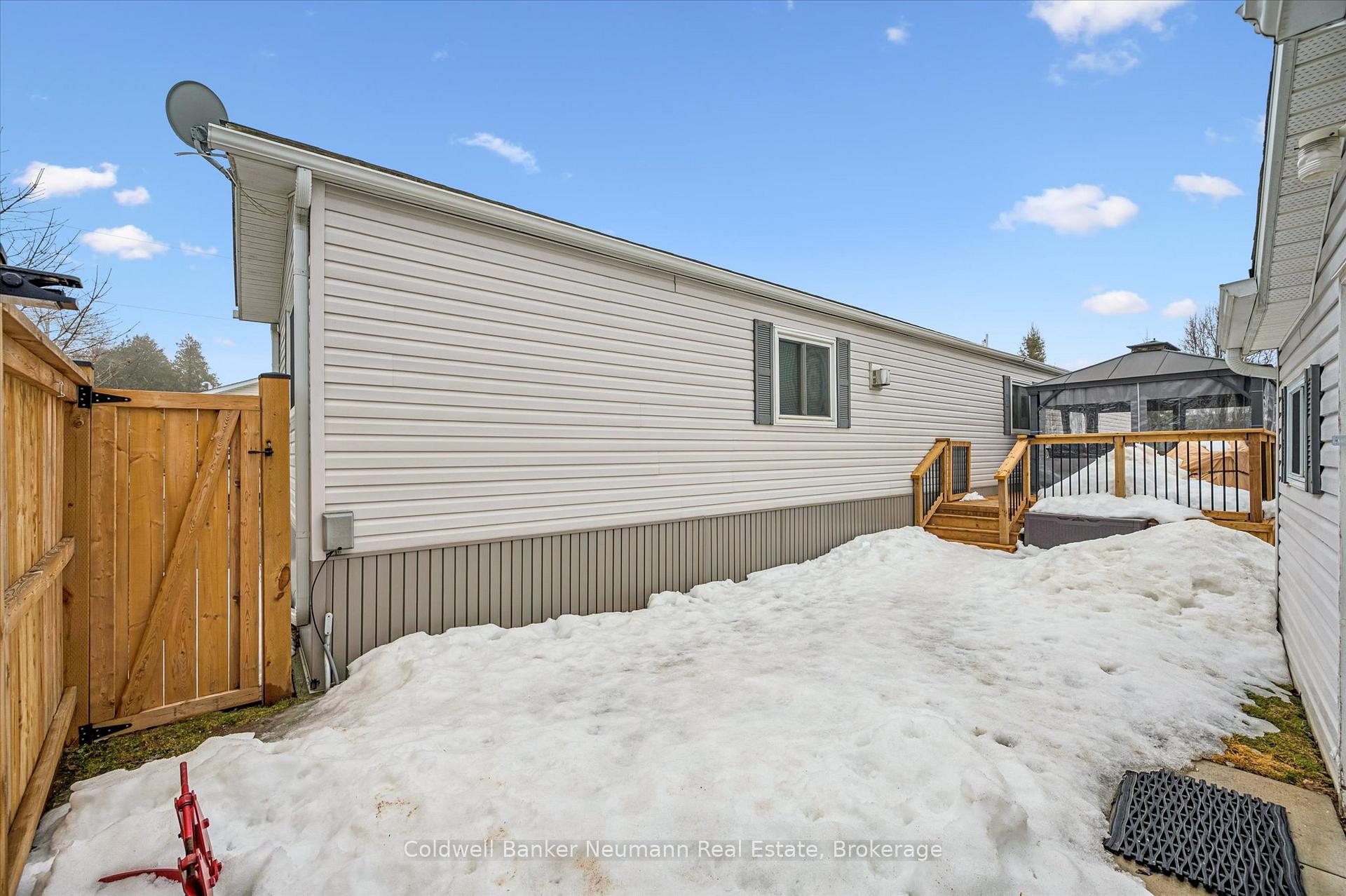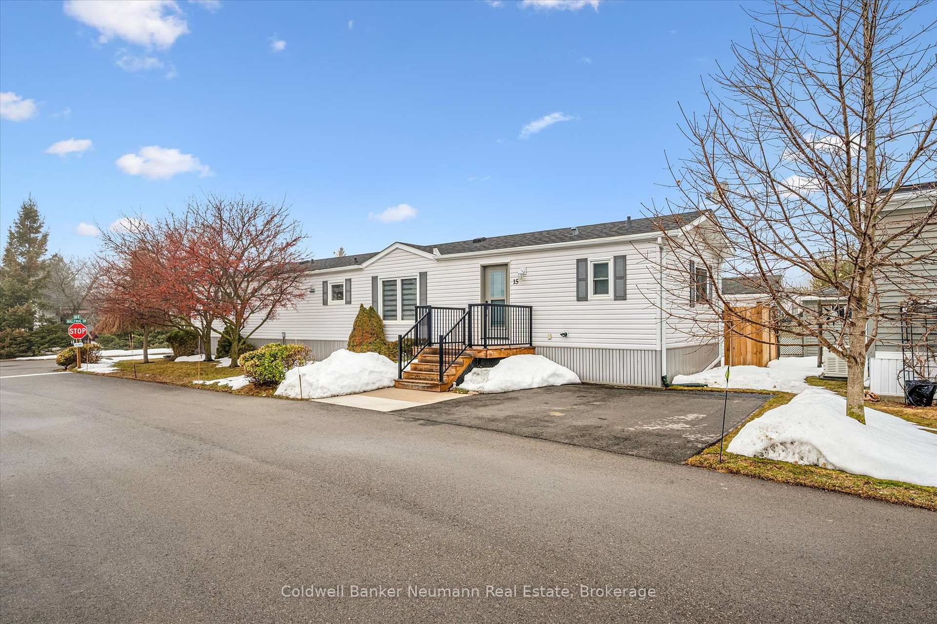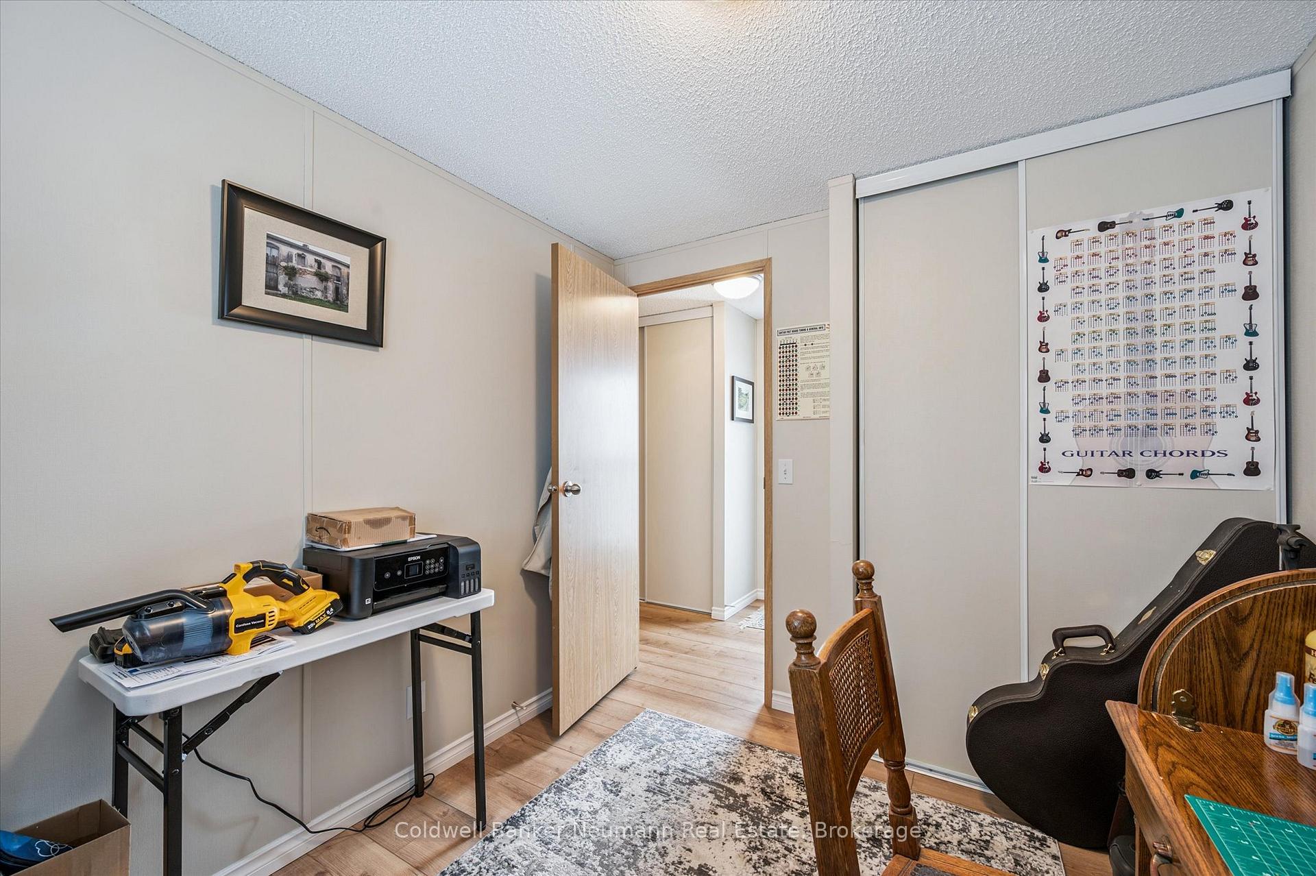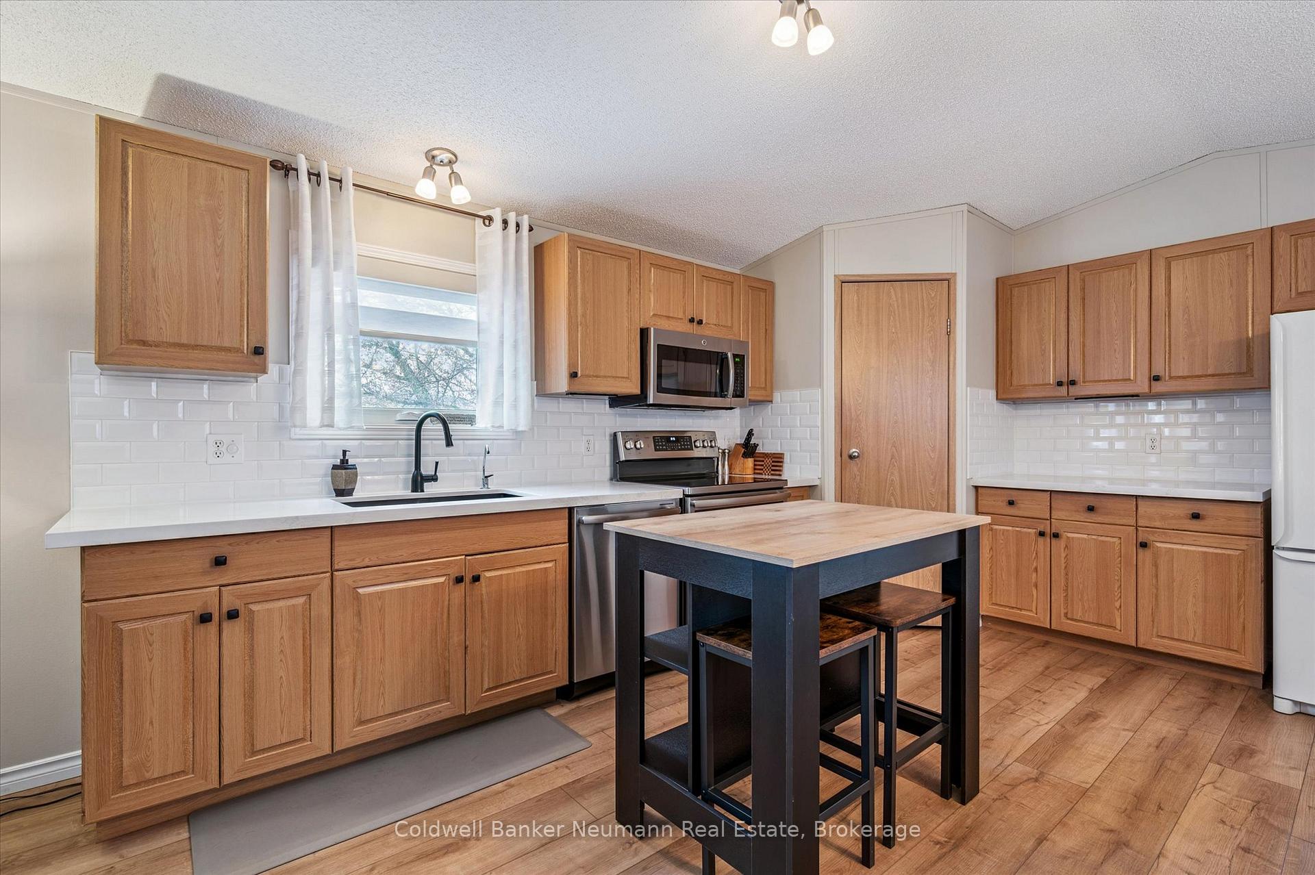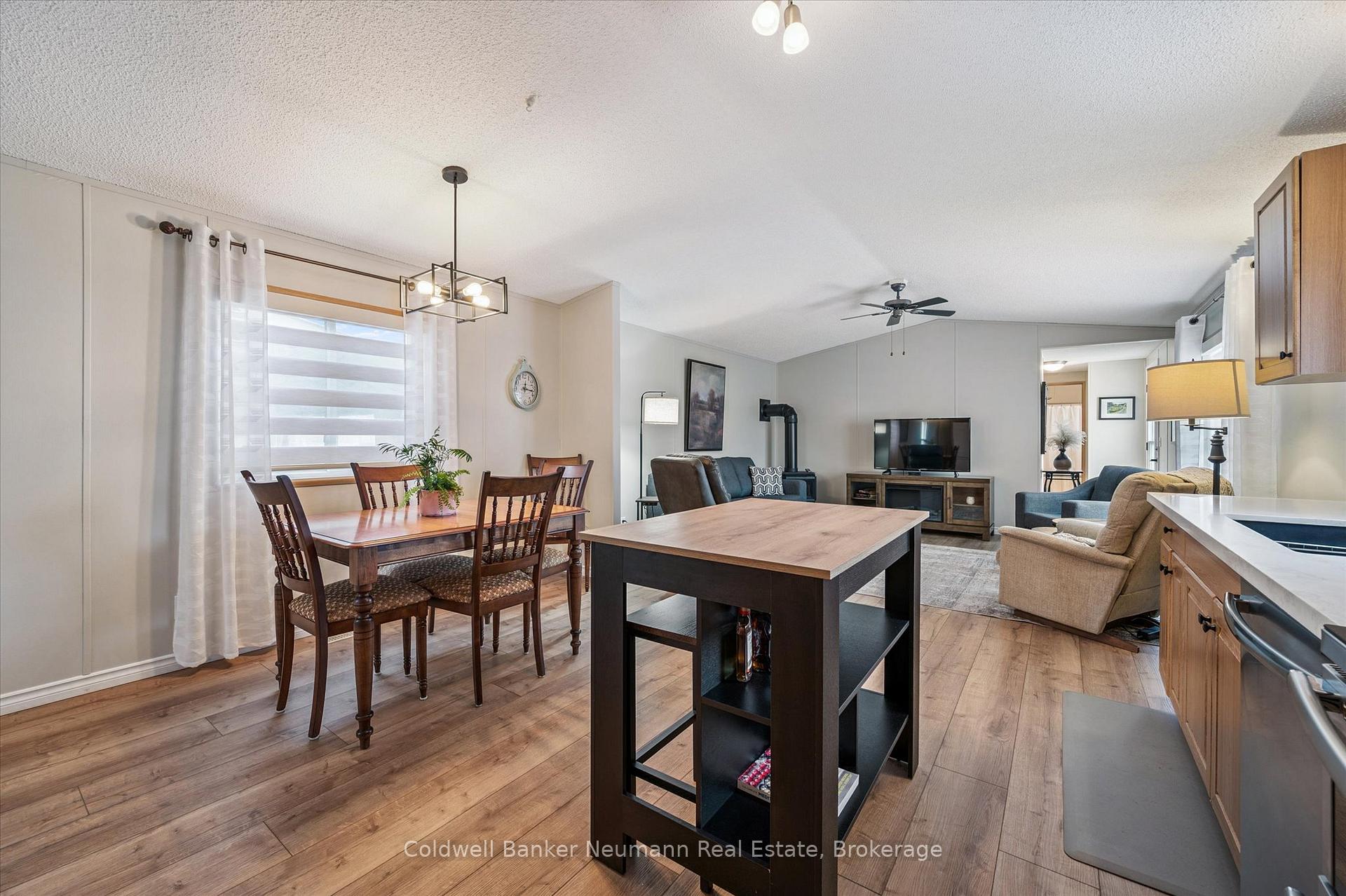 Welcome to this charming home in the sought after Mini Lakes community, ideally located on a desirable corner lot and just minutes from Highway 401, making commuting easy.This well maintained home offers 3 bedrooms and numerous updates have been completed in recent years, including new skirting/apron around the house (2020), all new windows (2021), and new LVP flooring throughout (2021). Additional upgrades include a new freestanding gas fireplace (2022), new roof shingles (2023), a new concrete driveway and walkway (2024), a new fenced backyard (2024), and a beautifully updated kitchen with quartz countertop, undermount sink, faucet, and tile backsplash (2024). The home also features new front and back doors (2025) and a new deck (2025). An insulated shed/workshop with hydro provides great space for hobbies, storage, or projects.Step outside to enjoy the outdoor patio with gazebo, extending your living space during the warmer months and creating a great space for relaxing or entertaining. The property also offers parking for up to 3 vehicles.Mini Lakes residents enjoy a vibrant lifestyle with excellent amenities including spring fed lakes and canals, a heated outdoor pool, community gardens, and scenic walking trails. Residents can also take part in activities such as fishing, swimming, bocce, darts, and card nights, making it easy to stay active and connect with neighbours.Enjoy peaceful community living with convenient access to Highway 401 and nearby amenities.