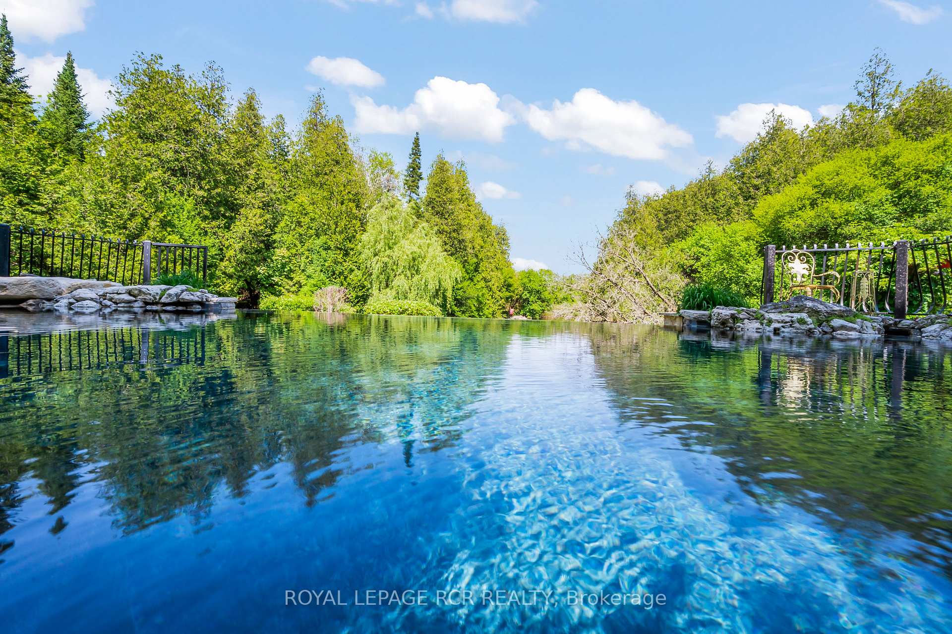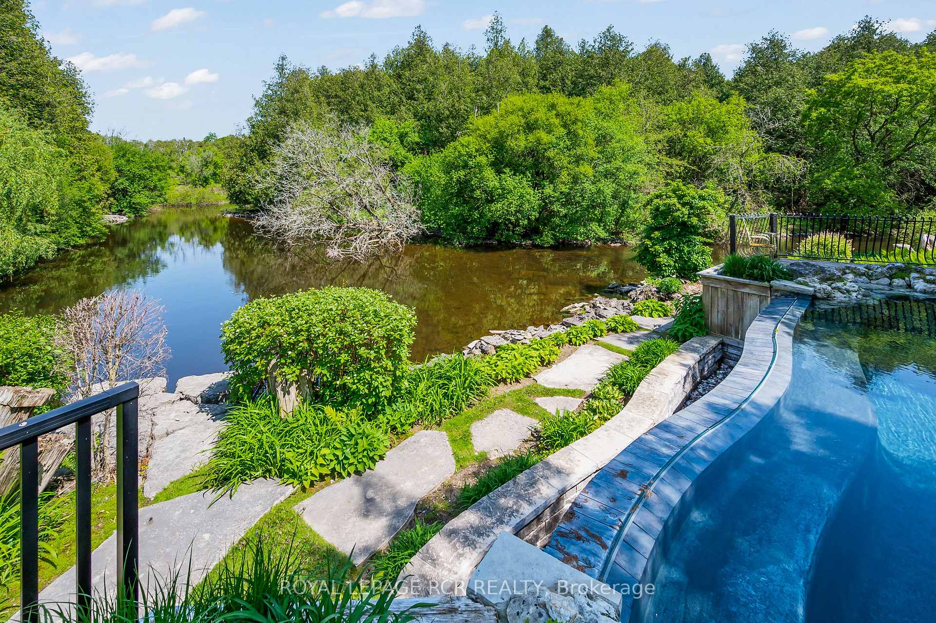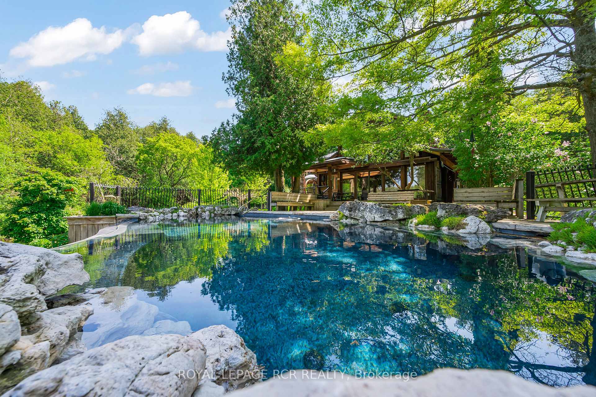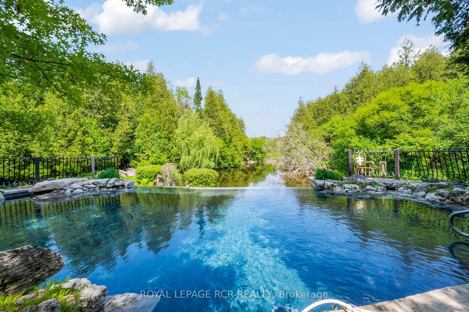 Tucked away on a secluded road, 15 River Bluff Path offers an extraordinary sanctuary blending natural beauty, creative energy, and quiet seclusion. Set on 13 acres with over 750 feet along the Eramosa River, this property presents a once-in-a-lifetime opportunity, with many unique features grandfathered in by the GRCA. The winding drive leads through a forest of mature trees to an almost otherworldly scene where a breathtaking infinity pool appears to spill into the river, surrounded by tranquil vistas and lush vegetation. Enjoy the scenery from the tiered deck, relax in the indoor hot tub, or watch wildlife such as deer, herons, and turtles. The private trail system leads to whimsical outbuildings, including a screened wooden pergola, a Japanese Maple Zen garden, and an outdoor privy. Once owned by a renowned Canadian naturalist, the property brims with creativity and inspiration. Inside, the great room captivates with soaring ceilings, stained glass accents, rustic wood beams, and a dramatic gas fireplace. A wall of windows connects the indoors to the breathtaking river view. The adjoining dining nook is perfect for gatherings, while the spacious kitchen features ample storage, a skylight, and an iconic AGA gas cooker. The main floor includes a vaulted-ceiling bedroom, a dressing/hobby room, two three-piece bathrooms (one wheelchair accessible), and a large laundry room. Upstairs, a loft-style theatre room provides an ideal space for entertainment, and two additional bedrooms share an impressive four-piece bathroom with heated floors and a spacious walk-in glass shower. With a two-car garage and an intercom system throughout, this retreat guarantees comfort and connectivity. Despite its privacy, it’s just minutes from Rockwood’s amenities and easily accessible to Guelph, Milton, and Pearson Airport. 15 River Bluff Path is more than just a home – it’s a legacy property rooted in nature and creativity, where every moment feels extraordinary.