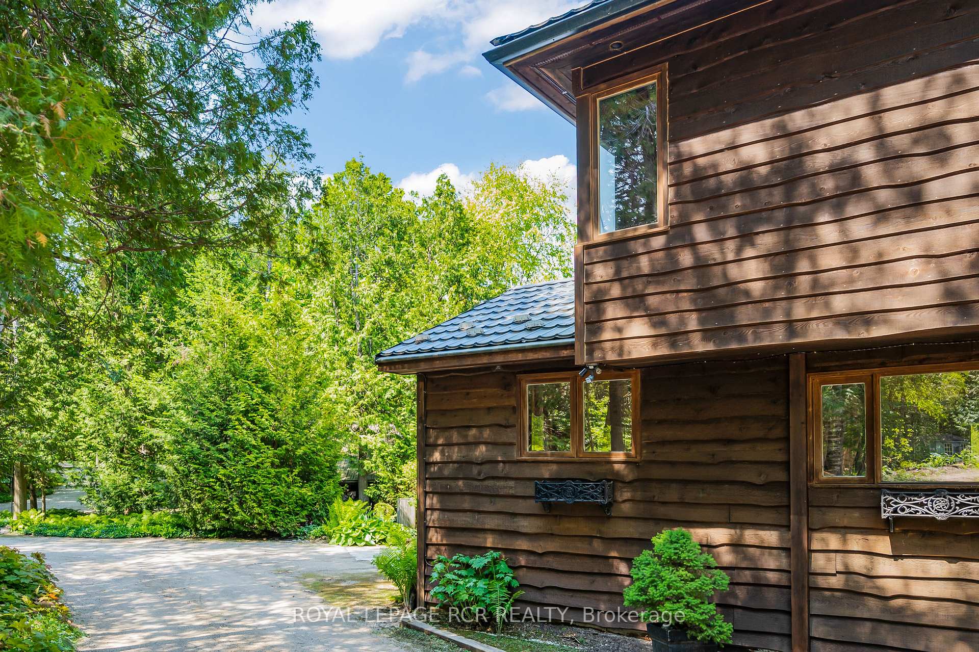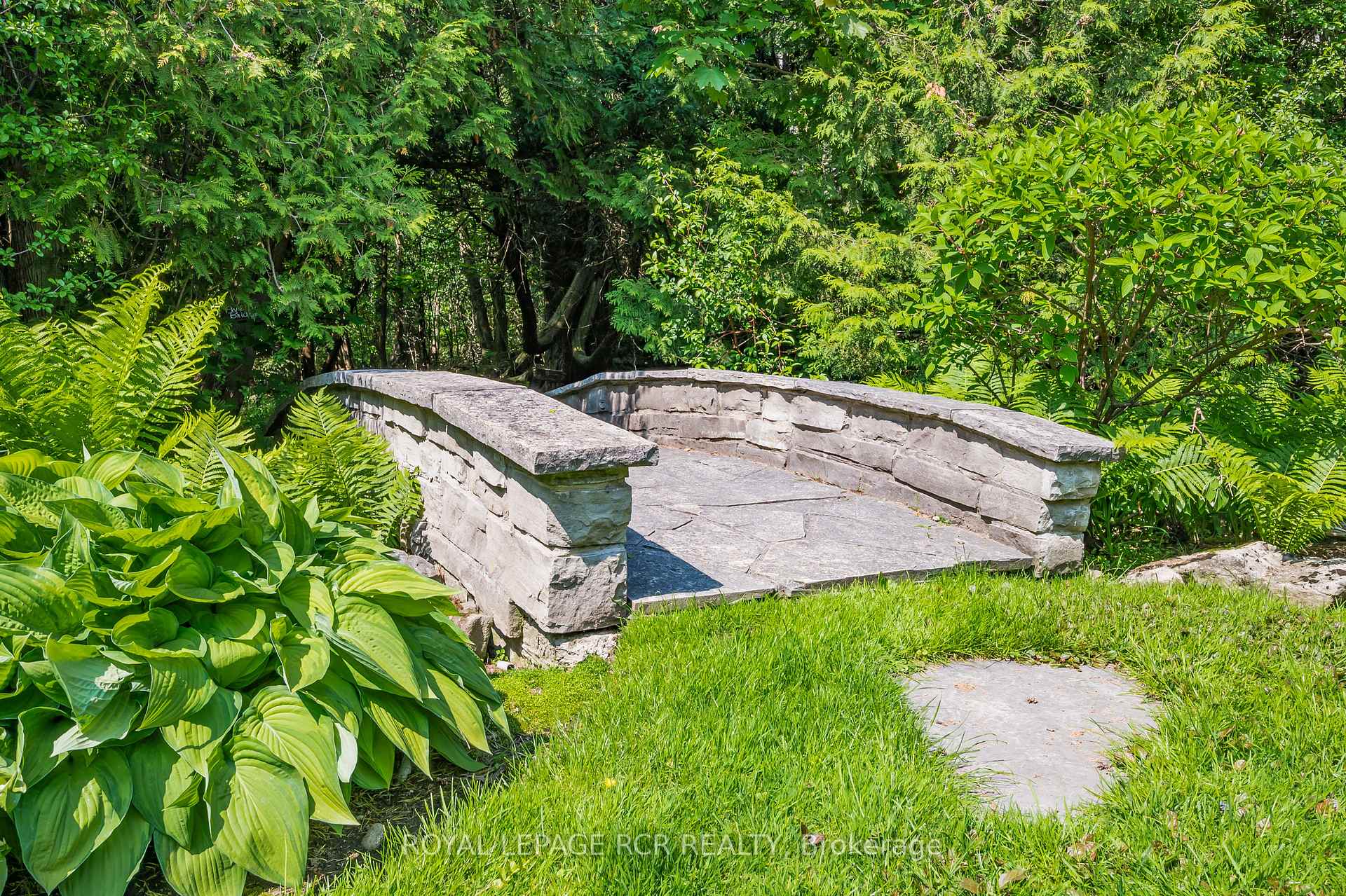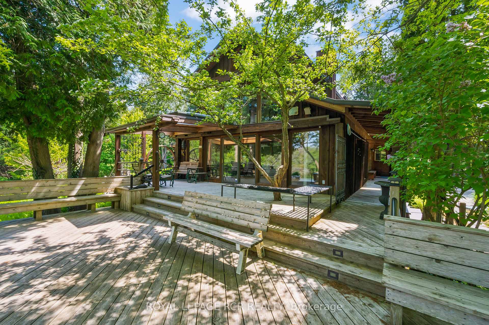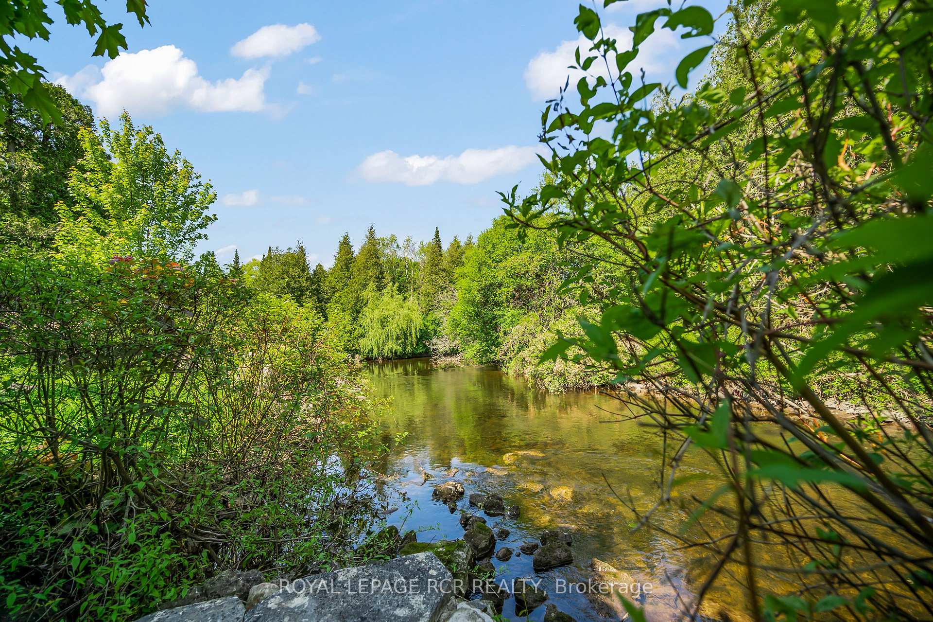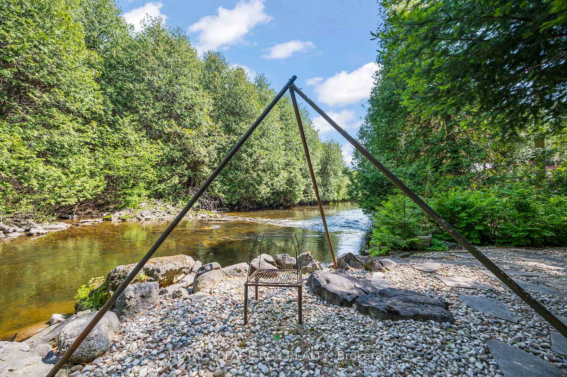 Tucked away on a secluded road, 15 River Bluff Path offers an extraordinary sanctuary blending natural beauty, creative energy, and quiet seclusion. Set on 13 acres with over 750 feet along the Eramosa River, this property presents a once-in-a-lifetime opportunity, with many unique features grandfathered in by the GRCA. The winding drive leads through a forest of mature trees to an almost otherworldly scene where a breathtaking infinity pool appears to spill into the river, surrounded by tranquil vistas and lush vegetation. Enjoy the scenery from the tiered deck, relax in the indoor hot tub, or watch wildlife such as deer, herons, and turtles. The private trail system leads to whimsical outbuildings, including a screened wooden pergola, a Japanese Maple Zen garden, and an outdoor privy. Once owned by a renowned Canadian naturalist, the property brims with creativity and inspiration. Inside, the great room captivates with soaring ceilings, stained glass accents, rustic wood beams, and a dramatic gas fireplace. A wall of windows connects the indoors to the breathtaking river view. The adjoining dining nook is perfect for gatherings, while the spacious kitchen features ample storage, a skylight, and an iconic AGA gas cooker. The main floor includes a vaulted-ceiling bedroom, a dressing/hobby room, two three-piece bathrooms (one wheelchair accessible), and a large laundry room. Upstairs, a loft-style theatre room provides an ideal space for entertainment, and two additional bedrooms share an impressive four-piece bathroom with heated floors and a spacious walk-in glass shower. With a two-car garage and an intercom system throughout, this retreat guarantees comfort and connectivity. Despite its privacy, it’s just minutes from Rockwood’s amenities and easily accessible to Guelph, Milton, and Pearson Airport. 15 River Bluff Path is more than just a home – it’s a legacy property rooted in nature and creativity, where every moment feels extraordinary.