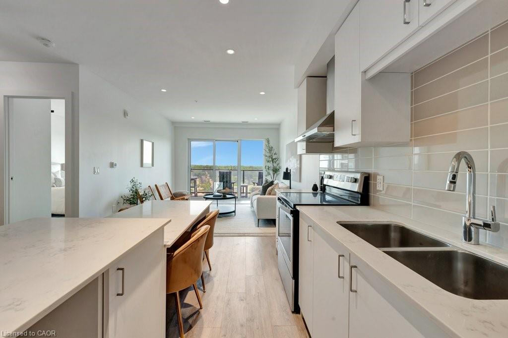 Modern and refined, this 2-bedroom, 2-bathroom condo offers 1,007 sq ft of well-designed living space in Cambridge’s highly sought-after Gaslight District—the city’s premier hub for dining, entertainment, and culture. The bright, open-concept layout features 9-foot ceilings, a contemporary kitchen, and expansive windows that fill the space with natural light. The primary bedroom includes a walk-in closet, while in-suite laundry adds everyday convenience. Enjoy a generous private balcony, accessible from both the living room and bedroom, showcasing panoramic views of the Grand River, Gaslight Square, and the surrounding cityscape. This unit also includes two underground parking spaces. Residents of Gaslight Condos have access to an exceptional array of amenities, including a state-of-the-art fitness centre, games room, study and library area, and an outdoor terrace with pergolas, fire pits, and BBQ areas overlooking the vibrant square below. Ideally located in one of Cambridge’s most dynamic communities, this condo offers a perfect balance of modern comfort and urban living.