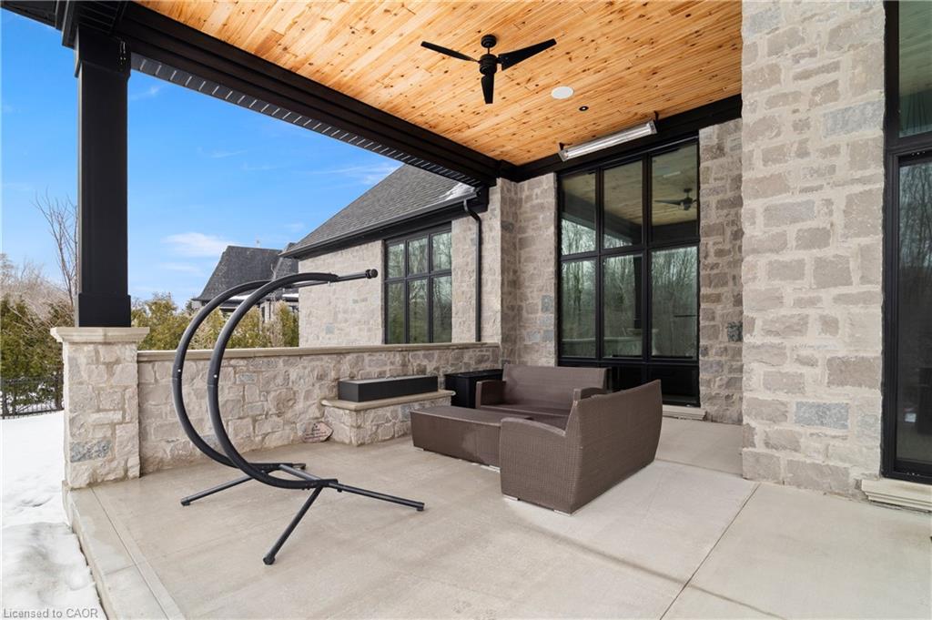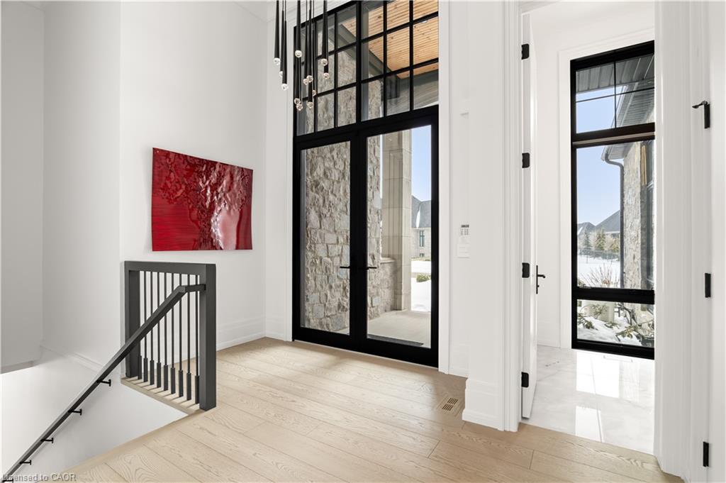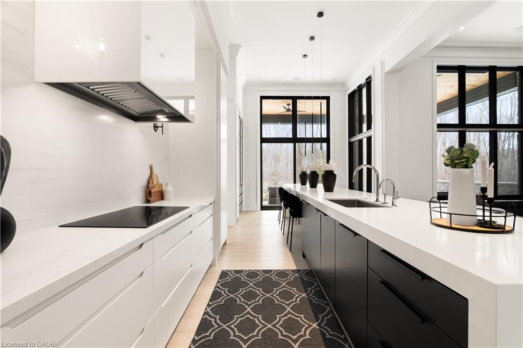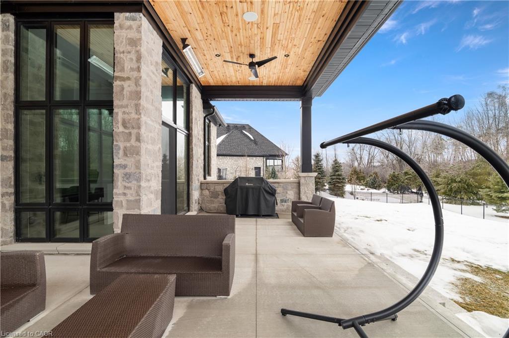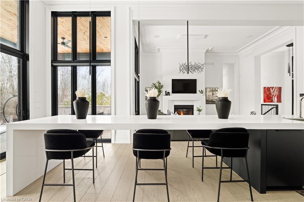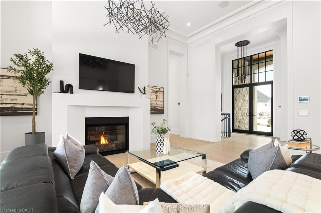 Welcome to life inside Heritage Lake Estates – a private, gated enclave in Puslinch known for its mature surroundings and beautiful custom homes. Set on a premium half-acre pie-shaped lot backing onto mature treelines, this custom stone bungalow offers privacy without compromise. With 2,252 square feet on the main floor and soaring 14-foot ceilings, the principal living space is defined by symmetry, scale, and natural light. A custom fireplace anchors the living room, while upgraded crown moulding and floor-to-ceiling windows create a refined yet inviting atmosphere.The kitchen and dining area are gallery-inspired in design, centred around a striking 21-foot stone waterfall island with seating for eight. Integrated cabinetry conceals premium WOLF appliances for a seamless aesthetic. Heated floors, custom lighting, and electric blinds reflect the many thoughtful upgrades woven throughout the home. Step outside to a covered back patio complete with built-in heaters and an impressive 350 sq ft gas fire feature, overlooking the fenced yard and tranquil forest backdrop – ideal for elevated, year-round outdoor living.The primary suite is a private retreat, offering 12ft ceilings, floor to ceiling windows, a generous walk-in closet and spa-inspired five-piece ensuite with Jet Spa shower system. Across from this, the well-appointed laundry room and additional main-floor bedroom, featuring with its own ensuite bath and walk-in closet, complete the main level. The fully finished lower level adds two bedrooms, each accompanied by an ensuite bathroom, a spacious recreation room with custom fireplace, dedicated office space, and a home gym – perfectly suited for growing families or multi-generational living. A functional mudroom with built-in cabinetry offers direct access to the heated three-car garage and walk-down access to the basement. 153 Heritage Lake Drive invites you to embrace a quiet kind of luxury, framed by the serenity of Puslinch Lake.