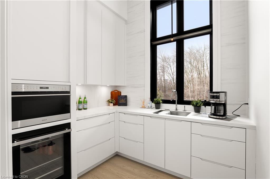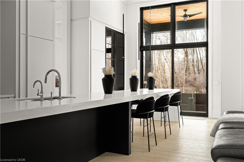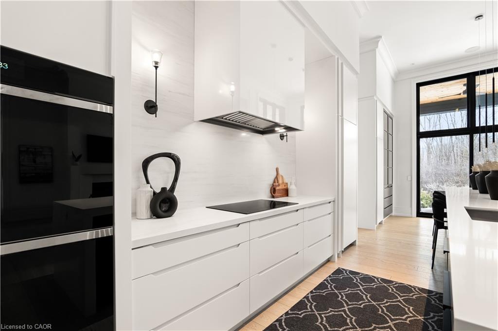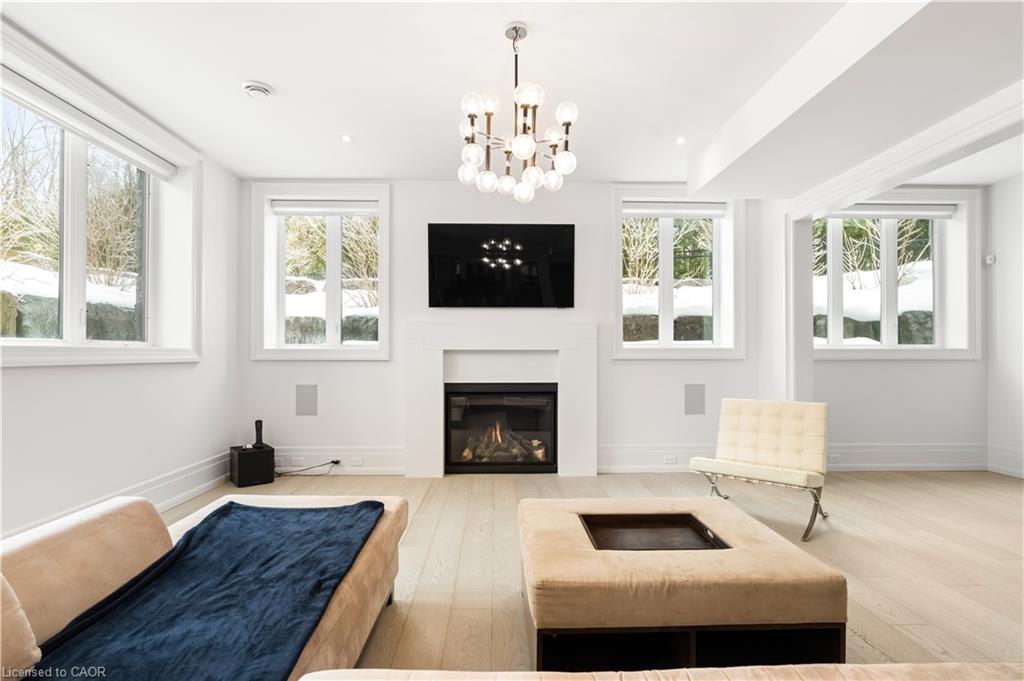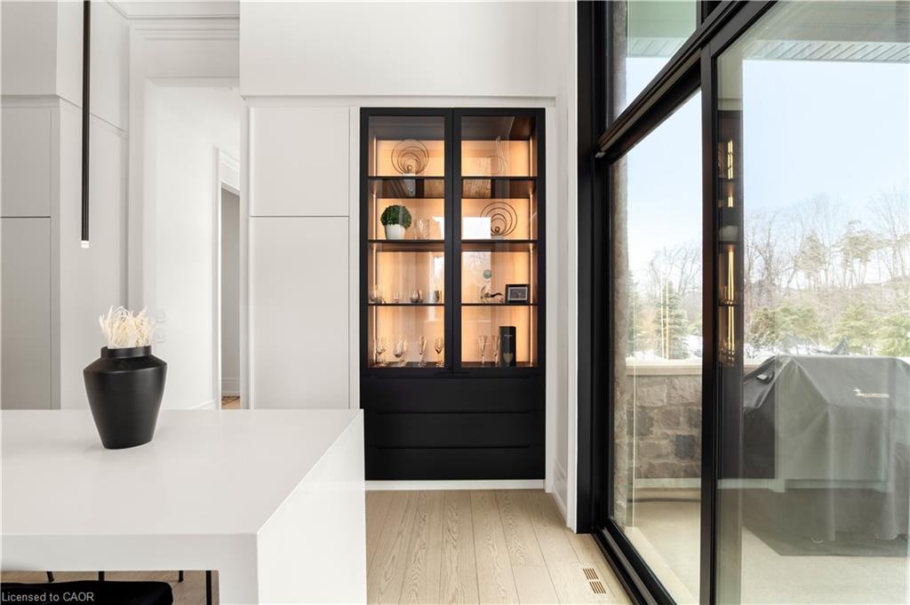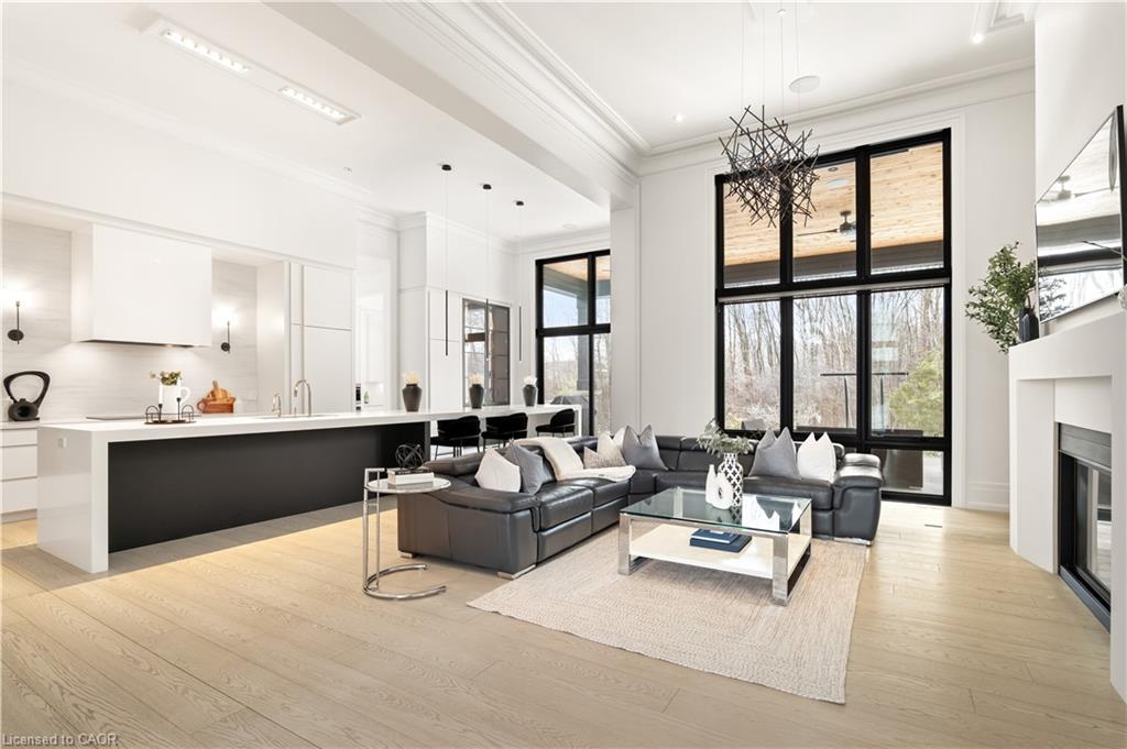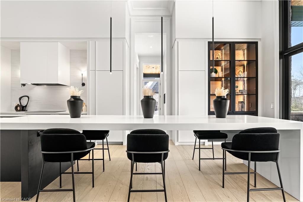 Welcome to life inside Heritage Lake Estates – a private, gated enclave in Puslinch known for its mature surroundings and beautiful custom homes. Set on a premium half-acre pie-shaped lot backing onto mature treelines, this custom stone bungalow offers privacy without compromise. With 2,252 square feet on the main floor and soaring 14-foot ceilings, the principal living space is defined by symmetry, scale, and natural light. A custom fireplace anchors the living room, while upgraded crown moulding and floor-to-ceiling windows create a refined yet inviting atmosphere.The kitchen and dining area are gallery-inspired in design, centred around a striking 21-foot stone waterfall island with seating for eight. Integrated cabinetry conceals premium WOLF appliances for a seamless aesthetic. Heated floors, custom lighting, and electric blinds reflect the many thoughtful upgrades woven throughout the home. Step outside to a covered back patio complete with built-in heaters and an impressive 350 sq ft gas fire feature, overlooking the fenced yard and tranquil forest backdrop – ideal for elevated, year-round outdoor living.The primary suite is a private retreat, offering 12ft ceilings, floor to ceiling windows, a generous walk-in closet and spa-inspired five-piece ensuite with Jet Spa shower system. Across from this, the well-appointed laundry room and additional main-floor bedroom, featuring with its own ensuite bath and walk-in closet, complete the main level. The fully finished lower level adds two bedrooms, each accompanied by an ensuite bathroom, a spacious recreation room with custom fireplace, dedicated office space, and a home gym – perfectly suited for growing families or multi-generational living. A functional mudroom with built-in cabinetry offers direct access to the heated three-car garage and walk-down access to the basement. 153 Heritage Lake Drive invites you to embrace a quiet kind of luxury, framed by the serenity of Puslinch Lake.