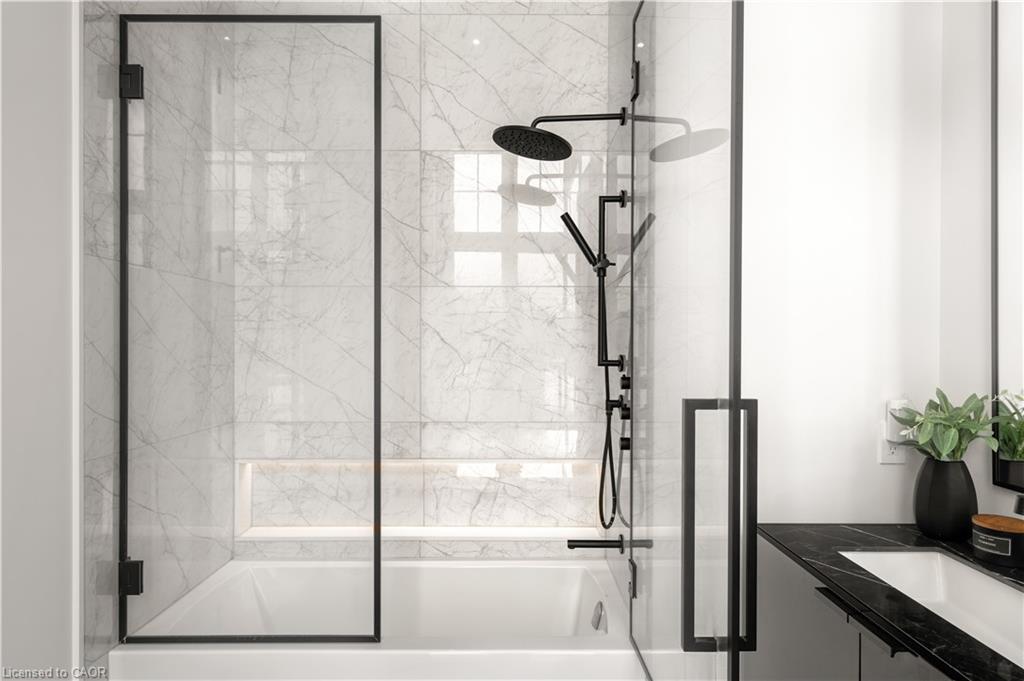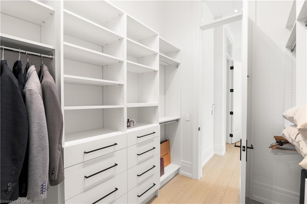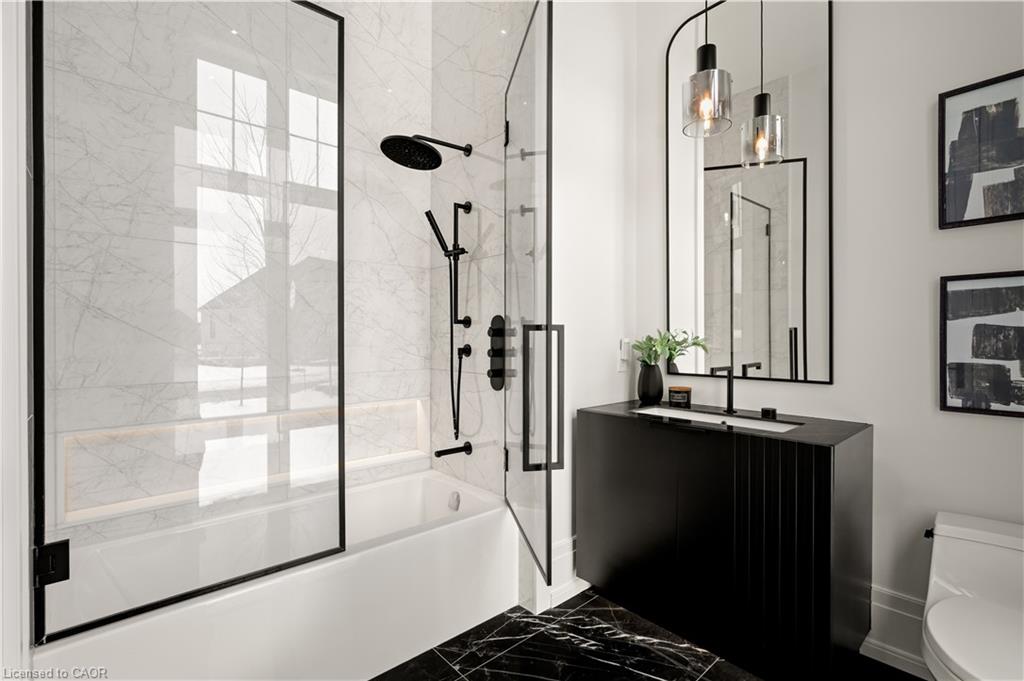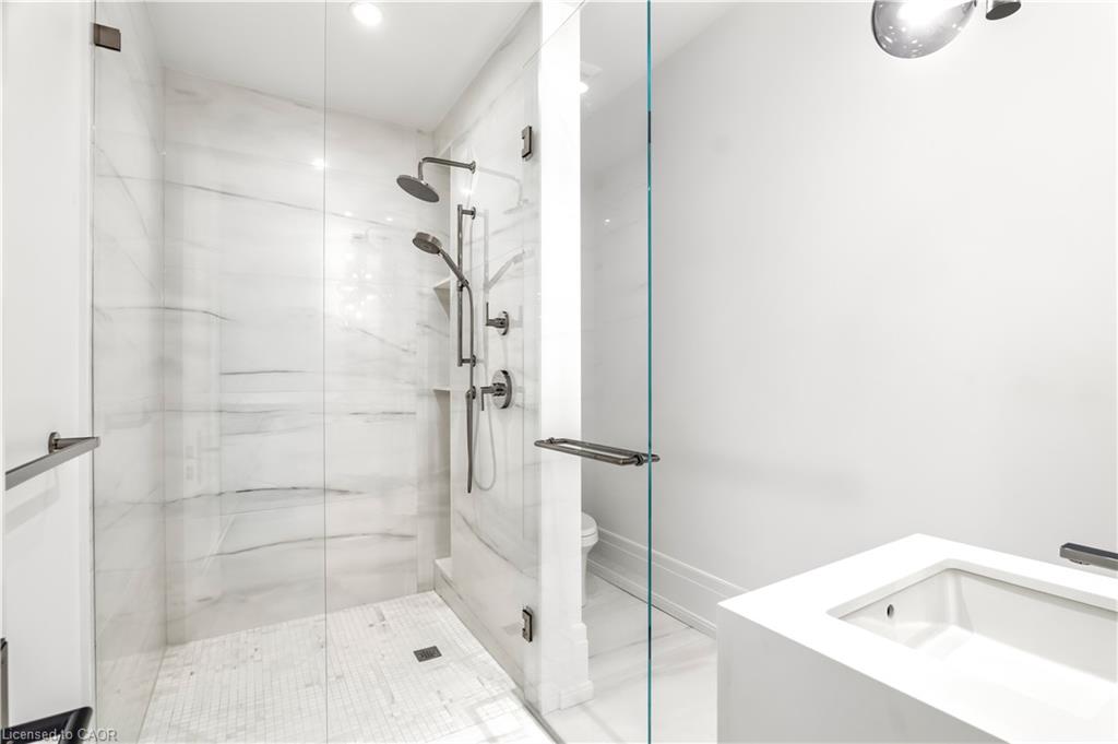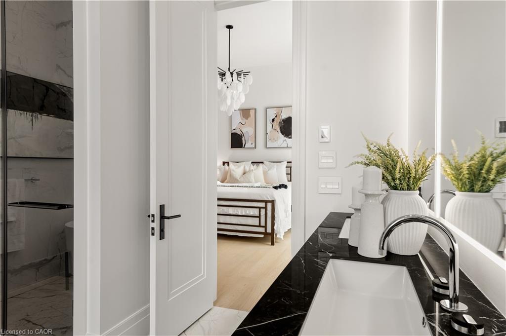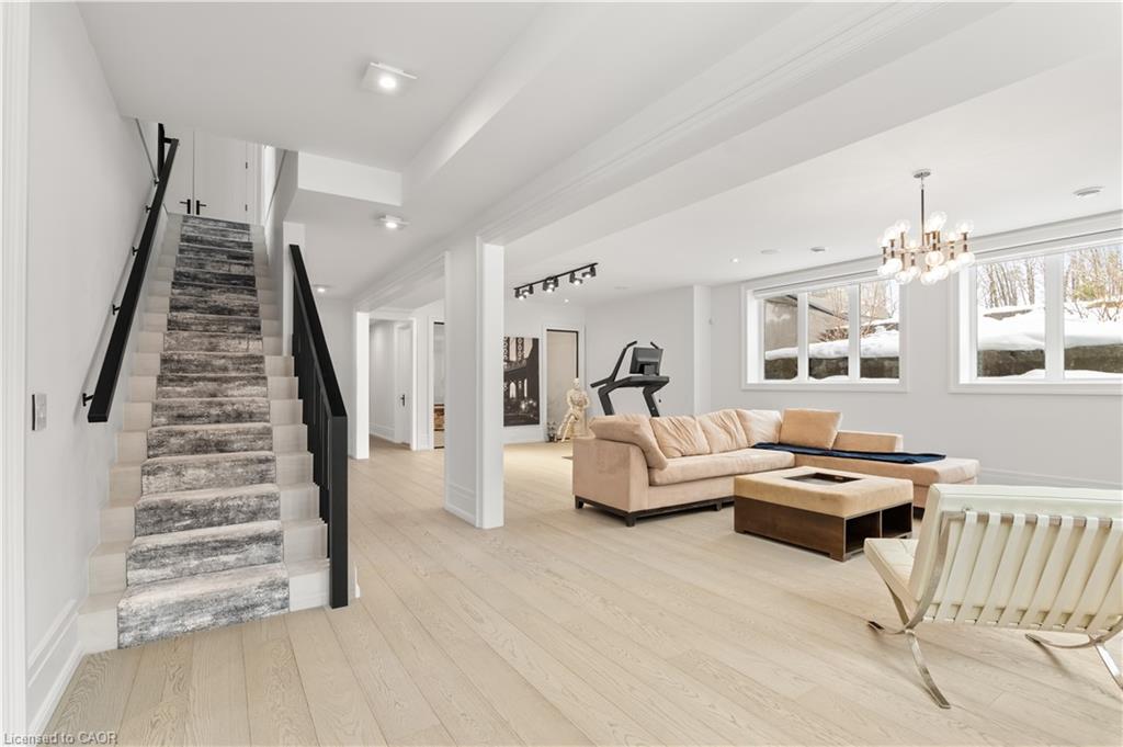 Welcome to life inside Heritage Lake Estates – a private, gated enclave in Puslinch known for its mature surroundings and beautiful custom homes. Set on a premium half-acre pie-shaped lot backing onto mature treelines, this custom stone bungalow offers privacy without compromise. With 2,252 square feet on the main floor and soaring 14-foot ceilings, the principal living space is defined by symmetry, scale, and natural light. A custom fireplace anchors the living room, while upgraded crown moulding and floor-to-ceiling windows create a refined yet inviting atmosphere.The kitchen and dining area are gallery-inspired in design, centred around a striking 21-foot stone waterfall island with seating for eight. Integrated cabinetry conceals premium WOLF appliances for a seamless aesthetic. Heated floors, custom lighting, and electric blinds reflect the many thoughtful upgrades woven throughout the home. Step outside to a covered back patio complete with built-in heaters and an impressive 350 sq ft gas fire feature, overlooking the fenced yard and tranquil forest backdrop – ideal for elevated, year-round outdoor living.The primary suite is a private retreat, offering 12ft ceilings, floor to ceiling windows, a generous walk-in closet and spa-inspired five-piece ensuite with Jet Spa shower system. Across from this, the well-appointed laundry room and additional main-floor bedroom, featuring with its own ensuite bath and walk-in closet, complete the main level. The fully finished lower level adds two bedrooms, each accompanied by an ensuite bathroom, a spacious recreation room with custom fireplace, dedicated office space, and a home gym – perfectly suited for growing families or multi-generational living. A functional mudroom with built-in cabinetry offers direct access to the heated three-car garage and walk-down access to the basement. 153 Heritage Lake Drive invites you to embrace a quiet kind of luxury, framed by the serenity of Puslinch Lake.