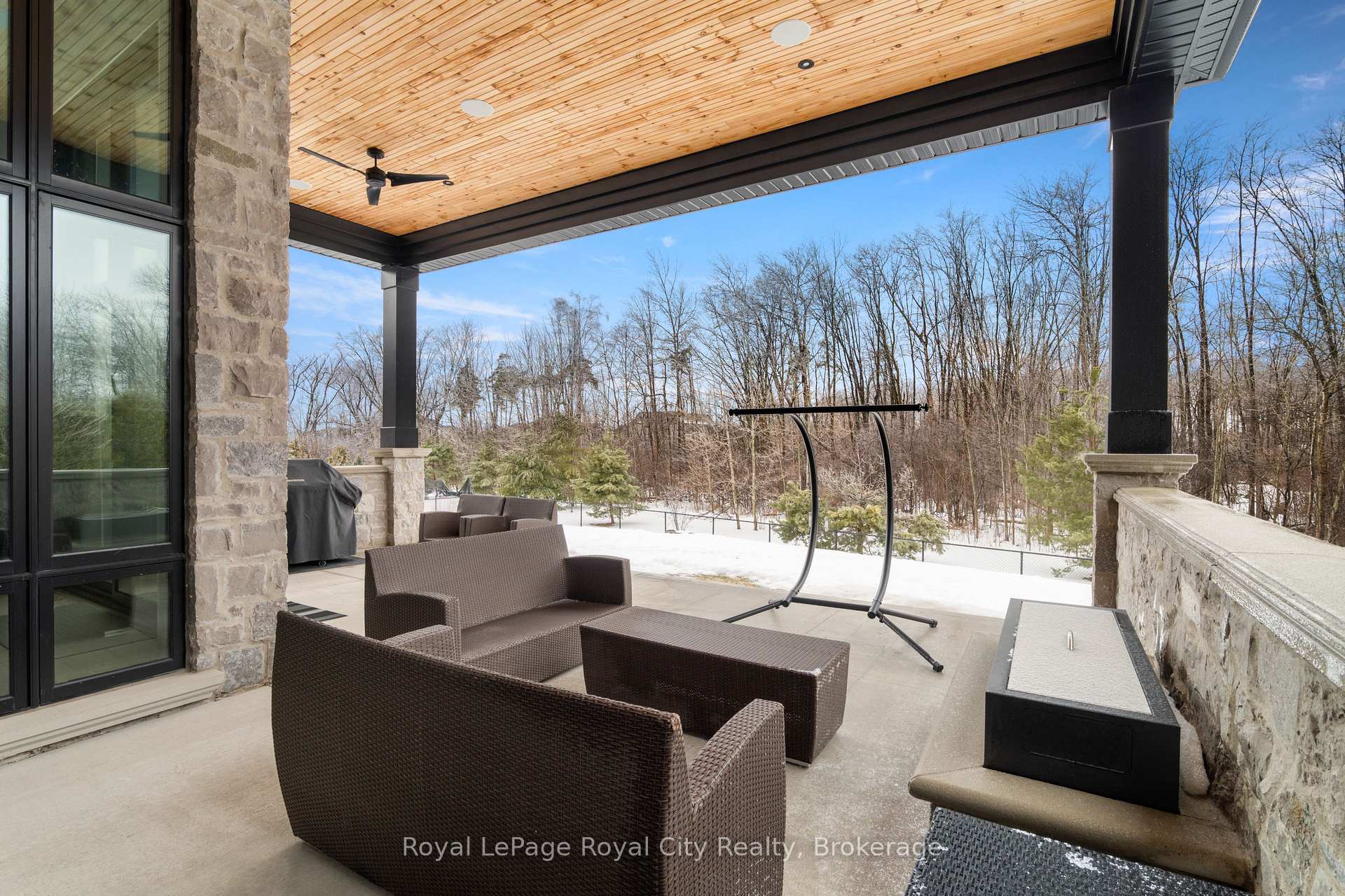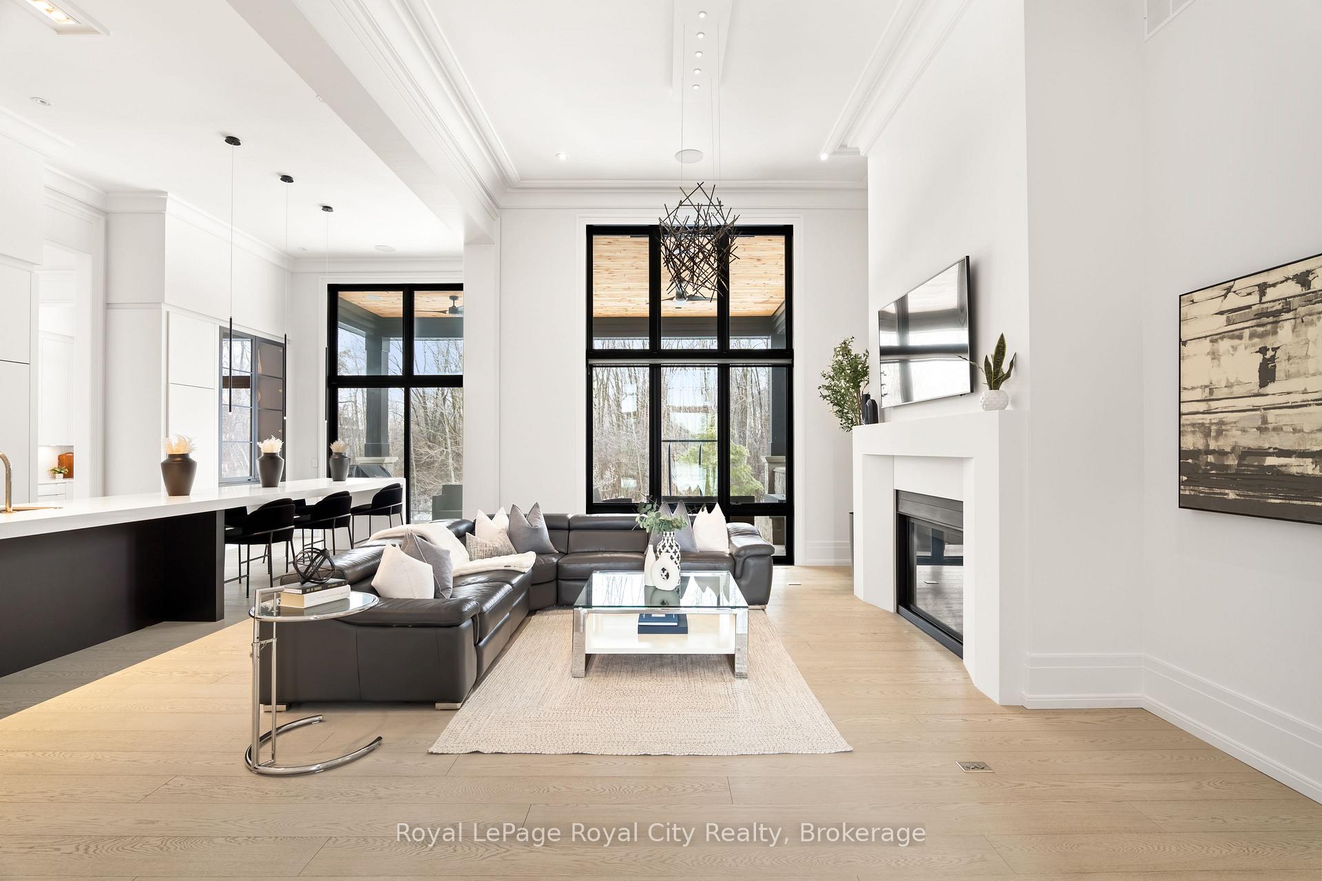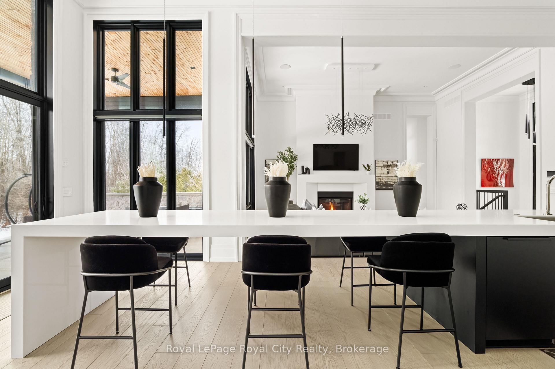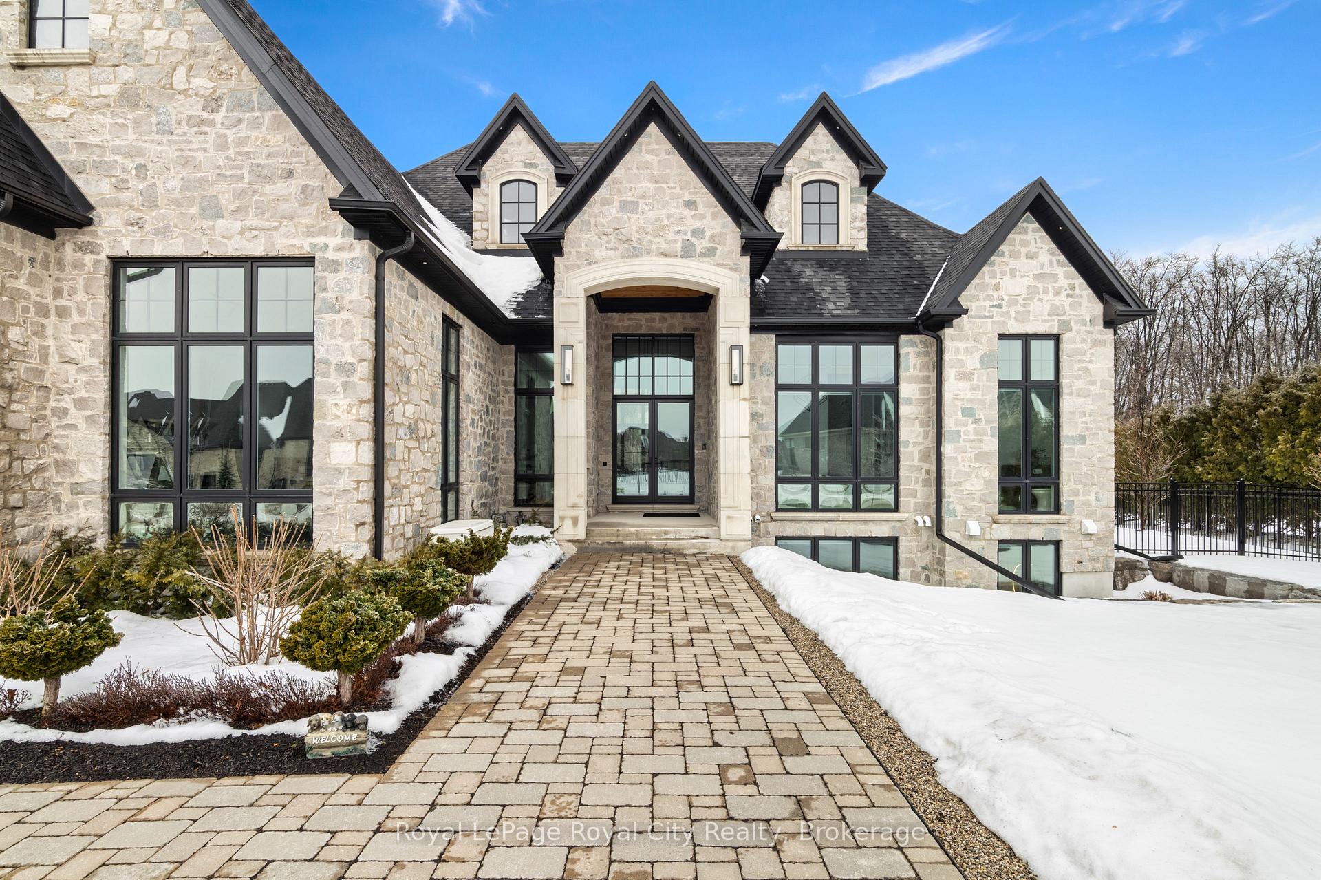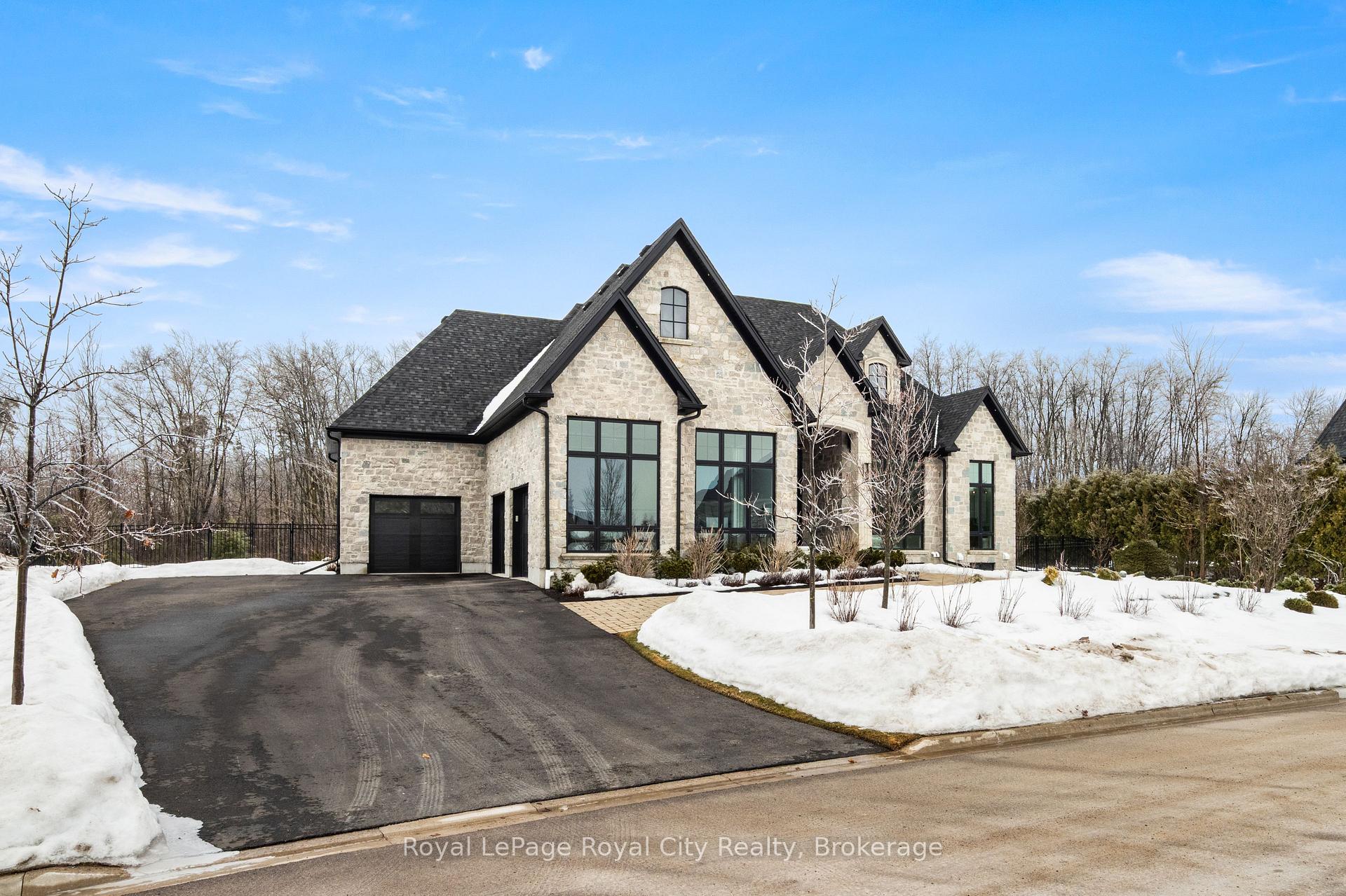 Welcome to life inside Heritage Lake Estates – a private, gated enclave in Puslinch known for its mature surroundings and beautiful custom homes. Set on a premium half-acre pie-shaped lot backing onto mature treelines, this custom stone bungalow offers privacy without compromise. With 2,252 square feet on the main floor and soaring 14-foot ceilings, the principal living space is defined by symmetry, scale, and natural light. A custom fireplace anchors the living room, while upgraded crown moulding and floor-to-ceiling windows create a refined yet inviting atmosphere.The kitchen and dining area are gallery-inspired in design, centred around a striking 21-foot stone waterfall island with seating for eight. Integrated cabinetry conceals premium WOLF appliances for a seamless aesthetic. Heated floors, custom lighting, and electric blinds reflect the many thoughtful upgrades woven throughout the home. Step outside to a covered back patio complete with built-in heaters and an impressive 350 sq ft gas fire feature, overlooking the fenced yard and tranquil forest backdrop – ideal for elevated, year-round outdoor living.The primary suite is a private retreat, offering 12ft ceilings, floor to ceiling windows, a generous walk-in closet and spa-inspired five-piece ensuite with Jet Spa shower system. Across from this, the well-appointed laundry room and additional main-floor bedroom, featuring with its own ensuite bath and walk-in closet, complete the main level. The fully finished lower level adds two bedrooms, each accompanied by an ensuite bathroom, a spacious recreation room with custom fireplace, dedicated office space, and a home gym – perfectly suited for growing families or multi-generational living. A functional mudroom with built-in cabinetry offers direct access to the heated three-car garage and walk-down access to the basement. 153 Heritage Lake Drive invites you to embrace a quiet kind of luxury, framed by the serenity of Puslinch Lake.