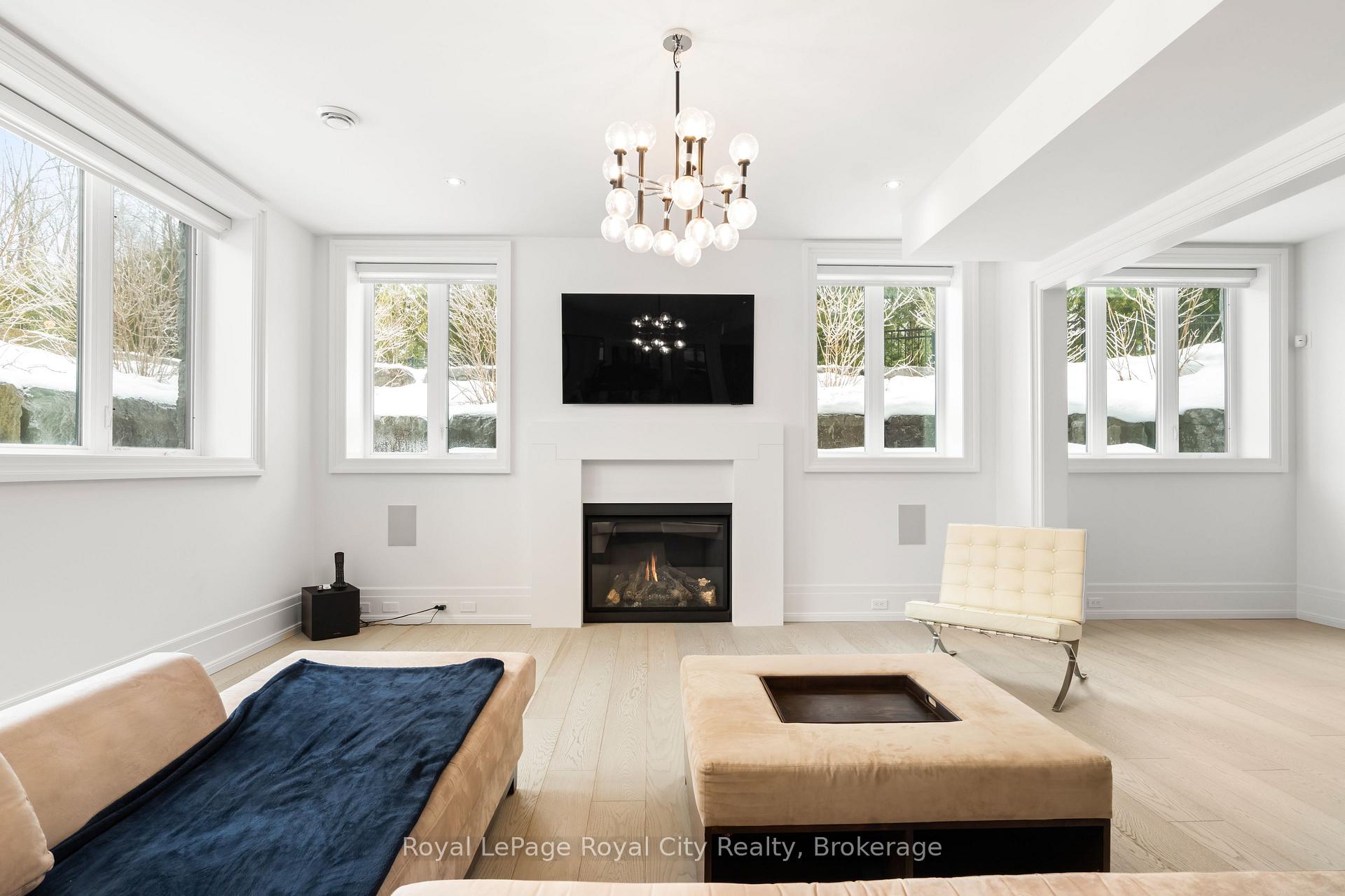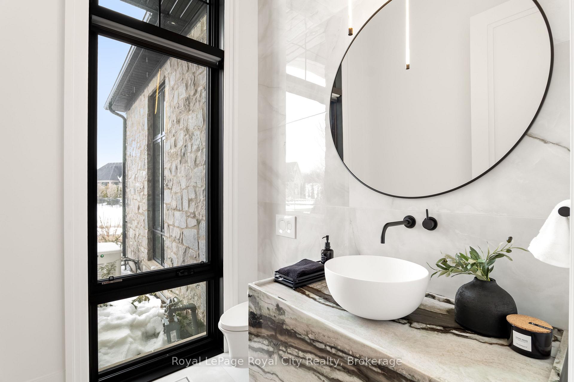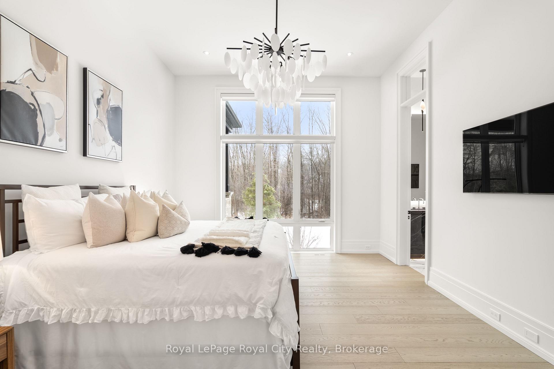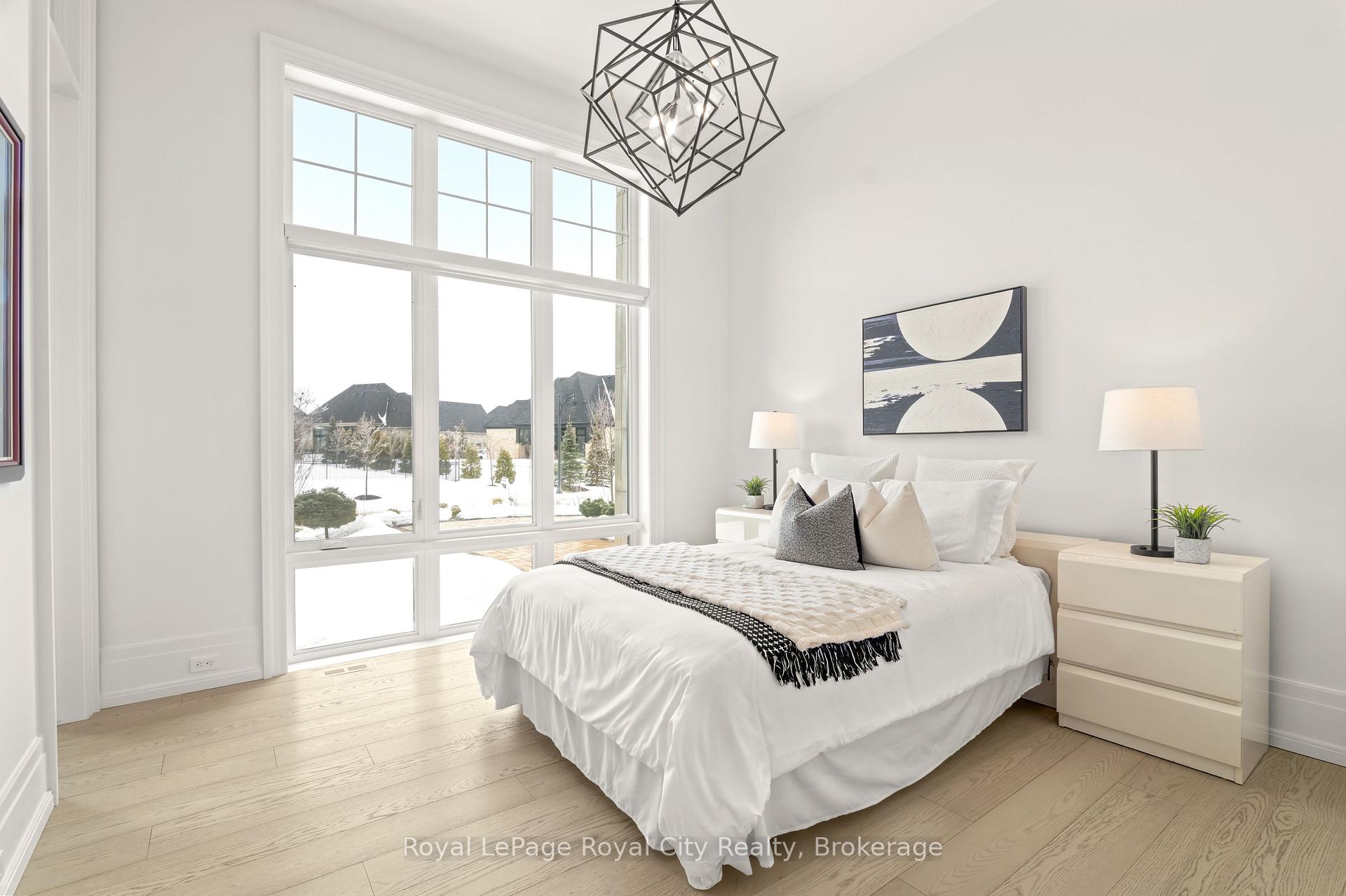 Welcome to life inside Heritage Lake Estates – a private, gated enclave in Puslinch known for its mature surroundings and beautiful custom homes. Set on a premium half-acre pie-shaped lot backing onto mature treelines, this custom stone bungalow offers privacy without compromise. With 2,252 square feet on the main floor and soaring 14-foot ceilings, the principal living space is defined by symmetry, scale, and natural light. A custom fireplace anchors the living room, while upgraded crown moulding and floor-to-ceiling windows create a refined yet inviting atmosphere.The kitchen and dining area are gallery-inspired in design, centred around a striking 21-foot stone waterfall island with seating for eight. Integrated cabinetry conceals premium WOLF appliances for a seamless aesthetic. Heated floors, custom lighting, and electric blinds reflect the many thoughtful upgrades woven throughout the home. Step outside to a covered back patio complete with built-in heaters and an impressive 350 sq ft gas fire feature, overlooking the fenced yard and tranquil forest backdrop – ideal for elevated, year-round outdoor living.The primary suite is a private retreat, offering 12ft ceilings, floor to ceiling windows, a generous walk-in closet and spa-inspired five-piece ensuite with Jet Spa shower system. Across from this, the well-appointed laundry room and additional main-floor bedroom, featuring with its own ensuite bath and walk-in closet, complete the main level. The fully finished lower level adds two bedrooms, each accompanied by an ensuite bathroom, a spacious recreation room with custom fireplace, dedicated office space, and a home gym – perfectly suited for growing families or multi-generational living. A functional mudroom with built-in cabinetry offers direct access to the heated three-car garage and walk-down access to the basement. 153 Heritage Lake Drive invites you to embrace a quiet kind of luxury, framed by the serenity of Puslinch Lake.