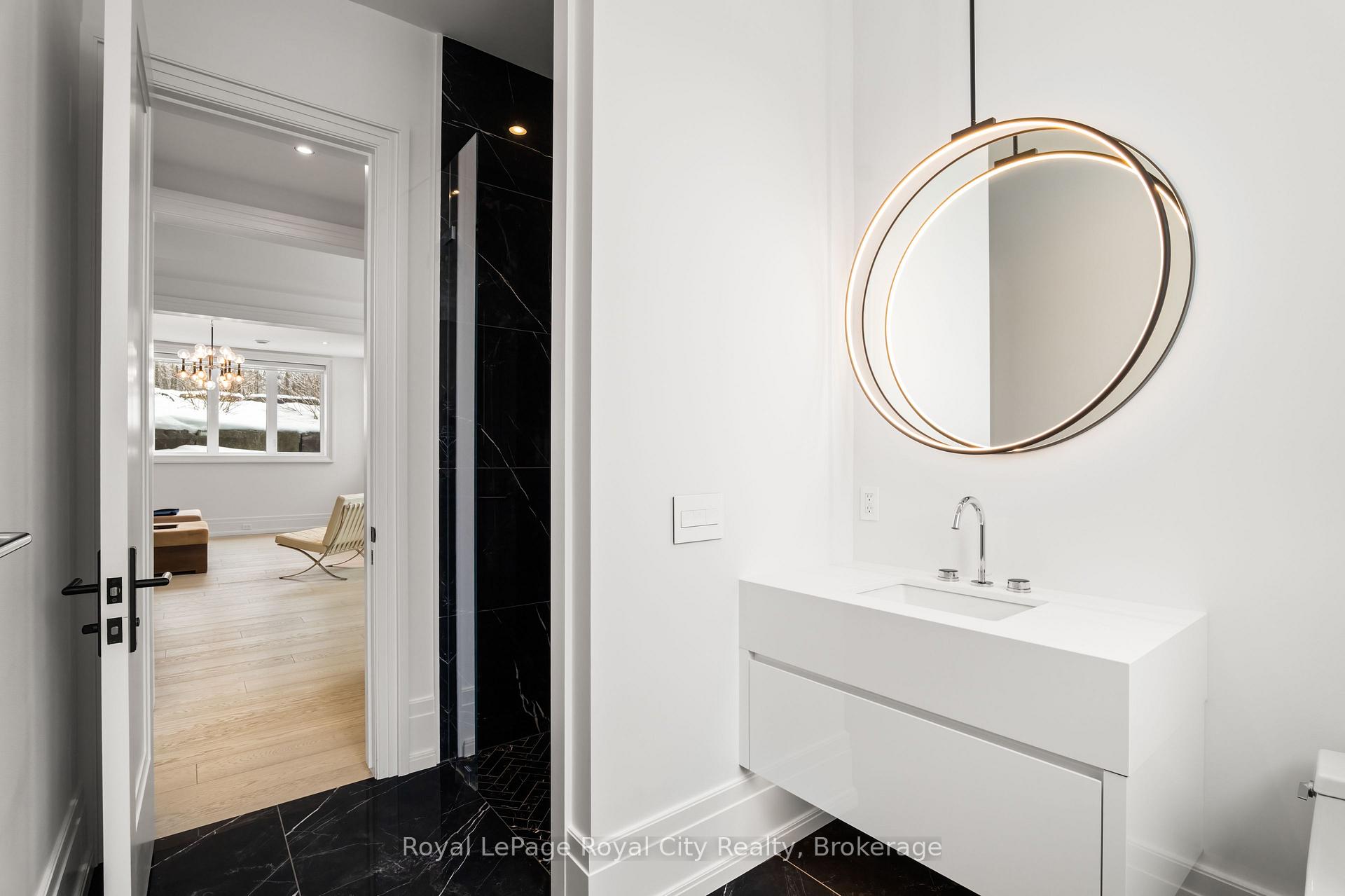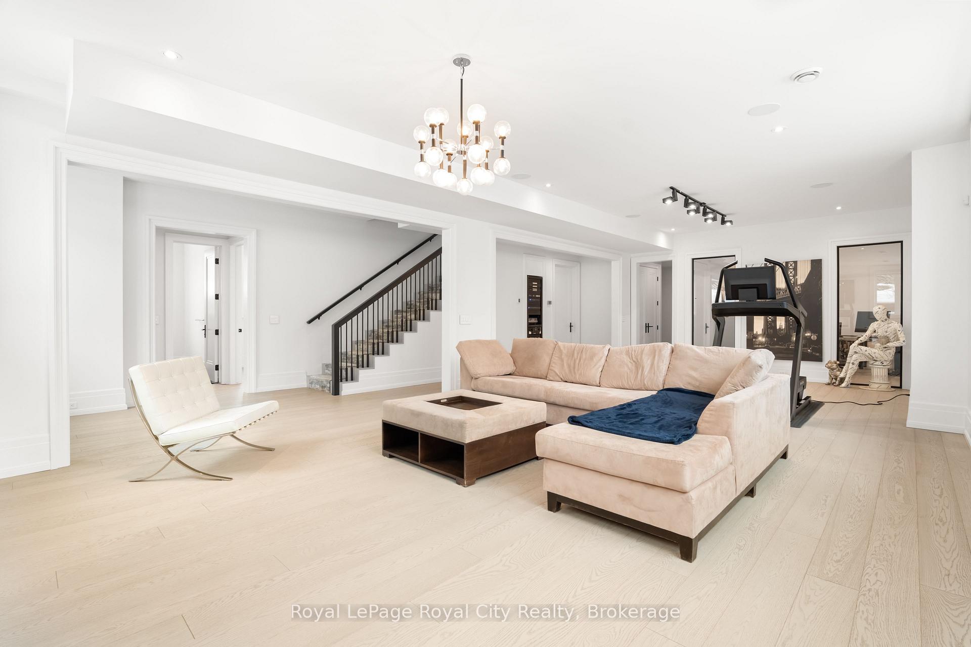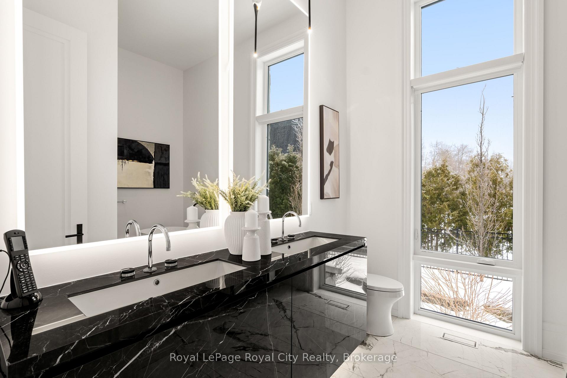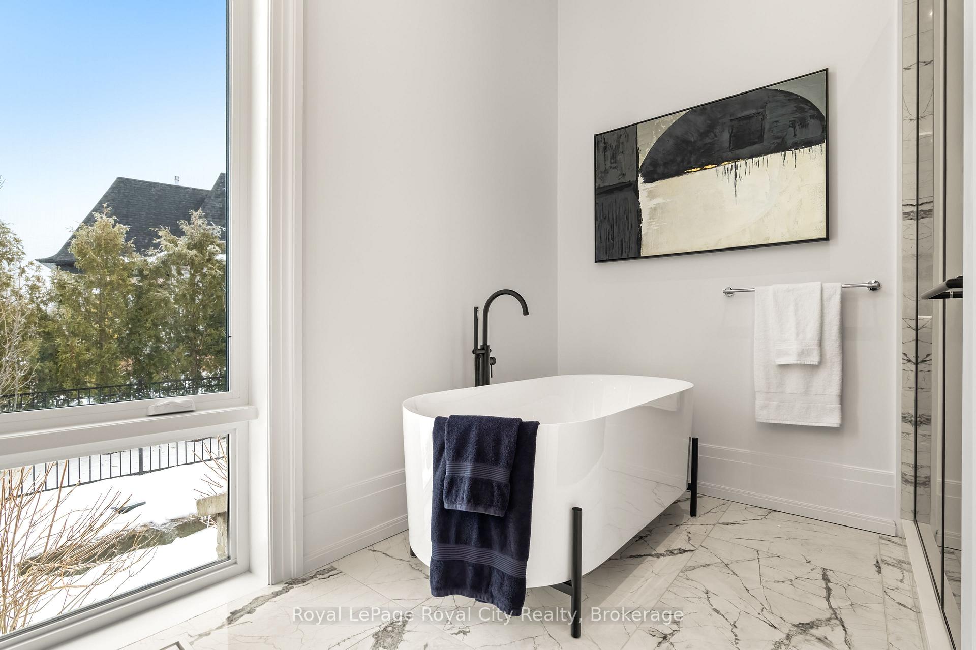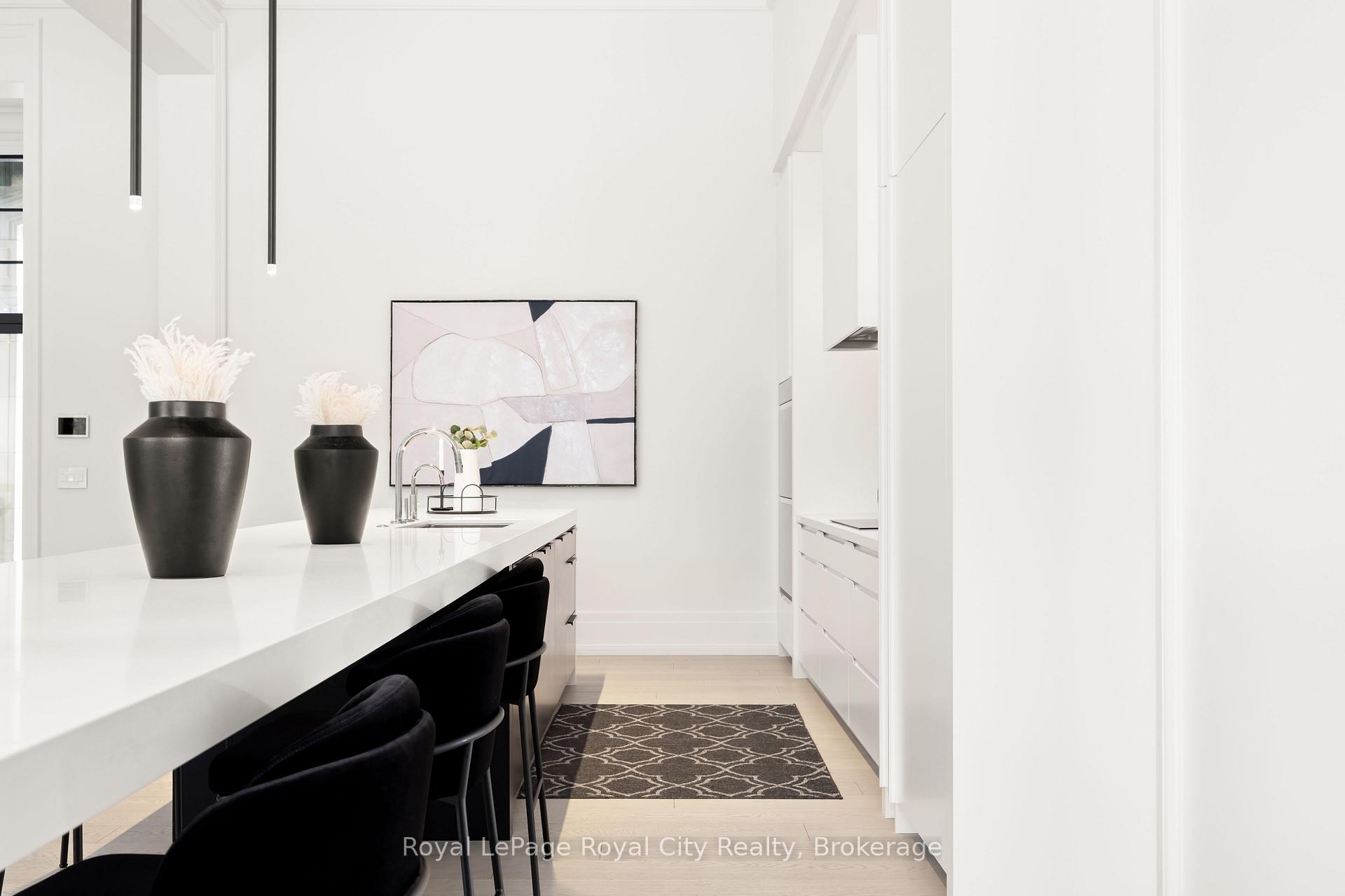 Welcome to life inside Heritage Lake Estates – a private, gated enclave in Puslinch known for its mature surroundings and beautiful custom homes. Set on a premium half-acre pie-shaped lot backing onto mature treelines, this custom stone bungalow offers privacy without compromise. With 2,252 square feet on the main floor and soaring 14-foot ceilings, the principal living space is defined by symmetry, scale, and natural light. A custom fireplace anchors the living room, while upgraded crown moulding and floor-to-ceiling windows create a refined yet inviting atmosphere.The kitchen and dining area are gallery-inspired in design, centred around a striking 21-foot stone waterfall island with seating for eight. Integrated cabinetry conceals premium WOLF appliances for a seamless aesthetic. Heated floors, custom lighting, and electric blinds reflect the many thoughtful upgrades woven throughout the home. Step outside to a covered back patio complete with built-in heaters and an impressive 350 sq ft gas fire feature, overlooking the fenced yard and tranquil forest backdrop – ideal for elevated, year-round outdoor living.The primary suite is a private retreat, offering 12ft ceilings, floor to ceiling windows, a generous walk-in closet and spa-inspired five-piece ensuite with Jet Spa shower system. Across from this, the well-appointed laundry room and additional main-floor bedroom, featuring with its own ensuite bath and walk-in closet, complete the main level. The fully finished lower level adds two bedrooms, each accompanied by an ensuite bathroom, a spacious recreation room with custom fireplace, dedicated office space, and a home gym – perfectly suited for growing families or multi-generational living. A functional mudroom with built-in cabinetry offers direct access to the heated three-car garage and walk-down access to the basement. 153 Heritage Lake Drive invites you to embrace a quiet kind of luxury, framed by the serenity of Puslinch Lake.