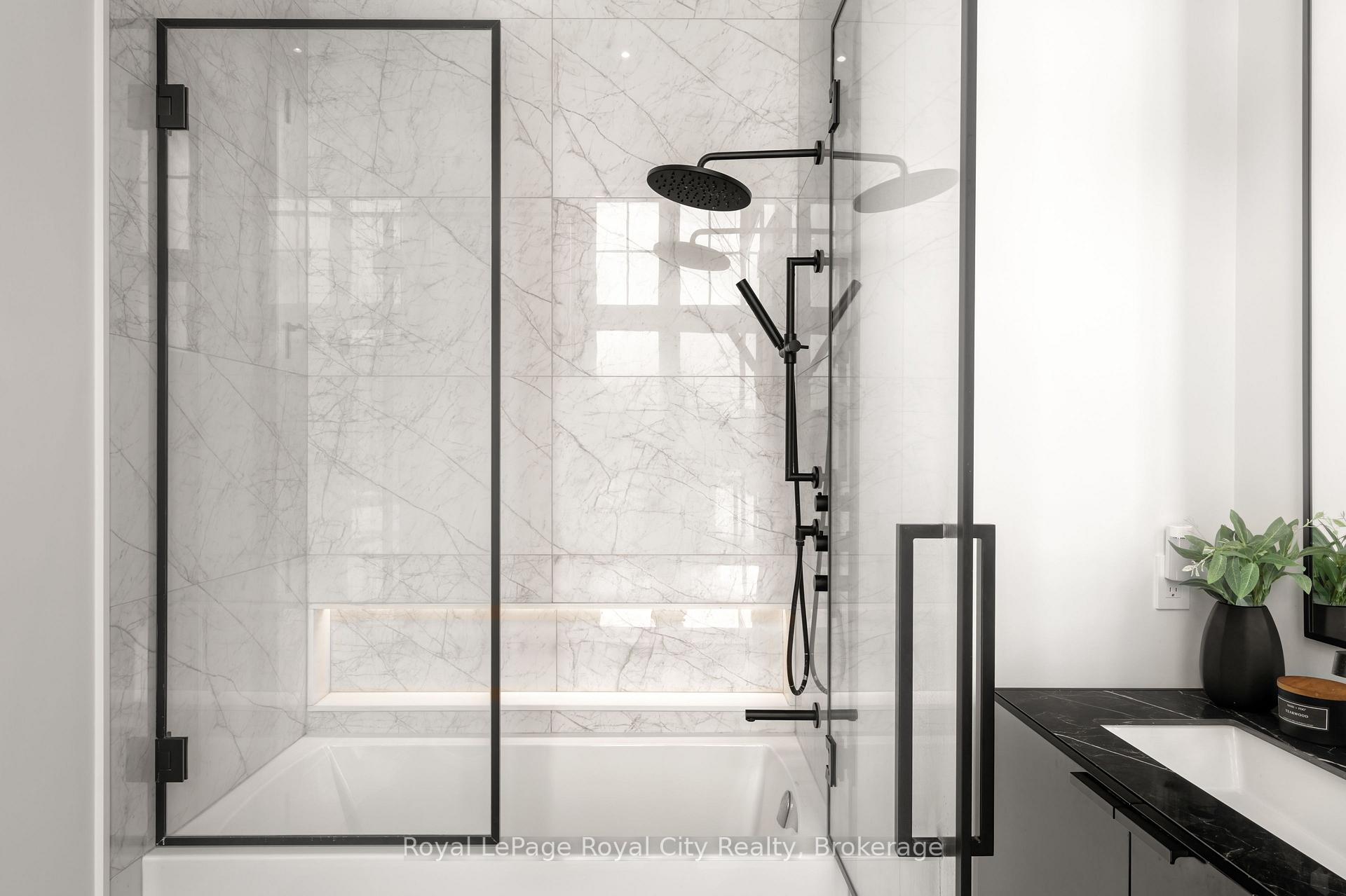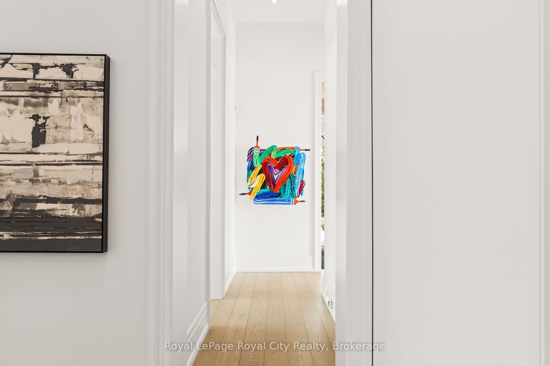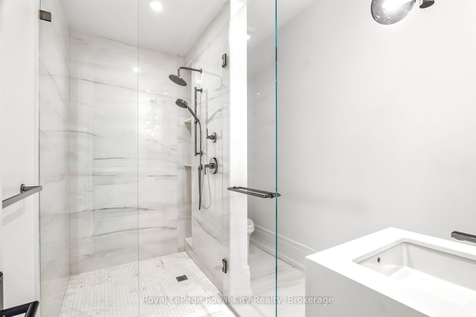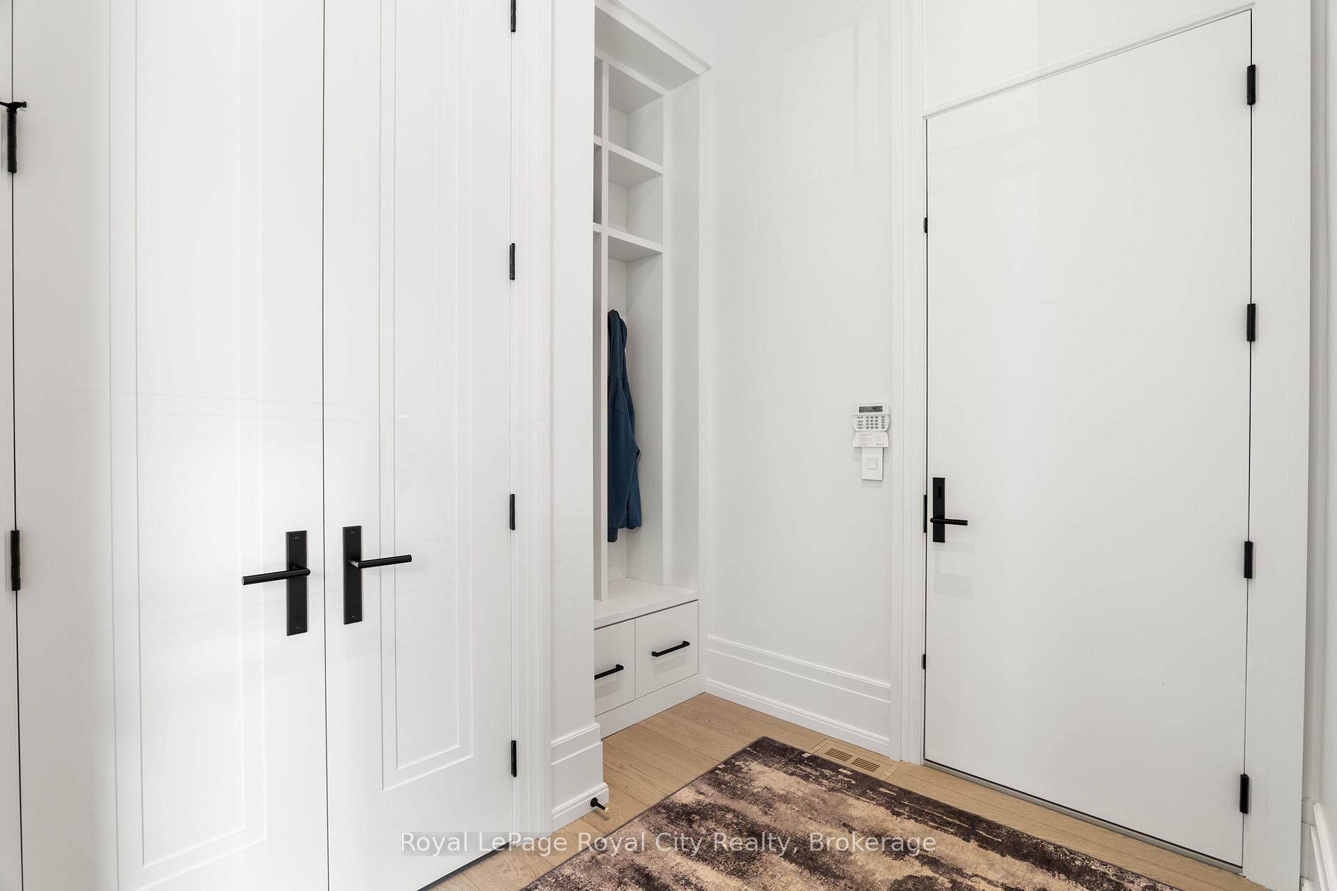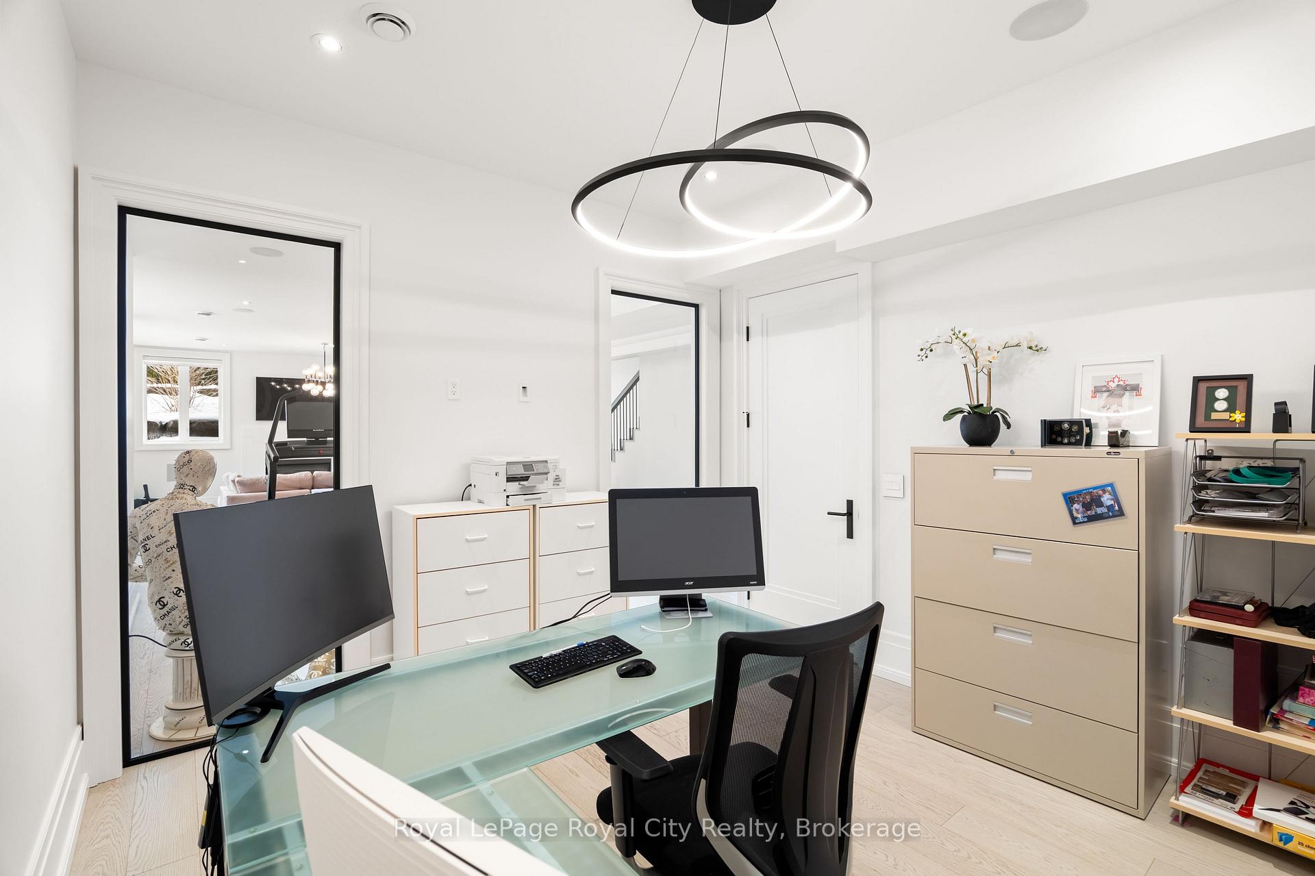 Welcome to life inside Heritage Lake Estates – a private, gated enclave in Puslinch known for its mature surroundings and beautiful custom homes. Set on a premium half-acre pie-shaped lot backing onto mature treelines, this custom stone bungalow offers privacy without compromise. With 2,252 square feet on the main floor and soaring 14-foot ceilings, the principal living space is defined by symmetry, scale, and natural light. A custom fireplace anchors the living room, while upgraded crown moulding and floor-to-ceiling windows create a refined yet inviting atmosphere.The kitchen and dining area are gallery-inspired in design, centred around a striking 21-foot stone waterfall island with seating for eight. Integrated cabinetry conceals premium WOLF appliances for a seamless aesthetic. Heated floors, custom lighting, and electric blinds reflect the many thoughtful upgrades woven throughout the home. Step outside to a covered back patio complete with built-in heaters and an impressive 350 sq ft gas fire feature, overlooking the fenced yard and tranquil forest backdrop – ideal for elevated, year-round outdoor living.The primary suite is a private retreat, offering 12ft ceilings, floor to ceiling windows, a generous walk-in closet and spa-inspired five-piece ensuite with Jet Spa shower system. Across from this, the well-appointed laundry room and additional main-floor bedroom, featuring with its own ensuite bath and walk-in closet, complete the main level. The fully finished lower level adds two bedrooms, each accompanied by an ensuite bathroom, a spacious recreation room with custom fireplace, dedicated office space, and a home gym – perfectly suited for growing families or multi-generational living. A functional mudroom with built-in cabinetry offers direct access to the heated three-car garage and walk-down access to the basement. 153 Heritage Lake Drive invites you to embrace a quiet kind of luxury, framed by the serenity of Puslinch Lake.
