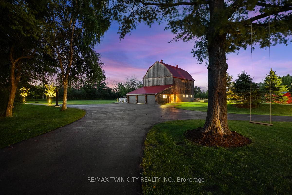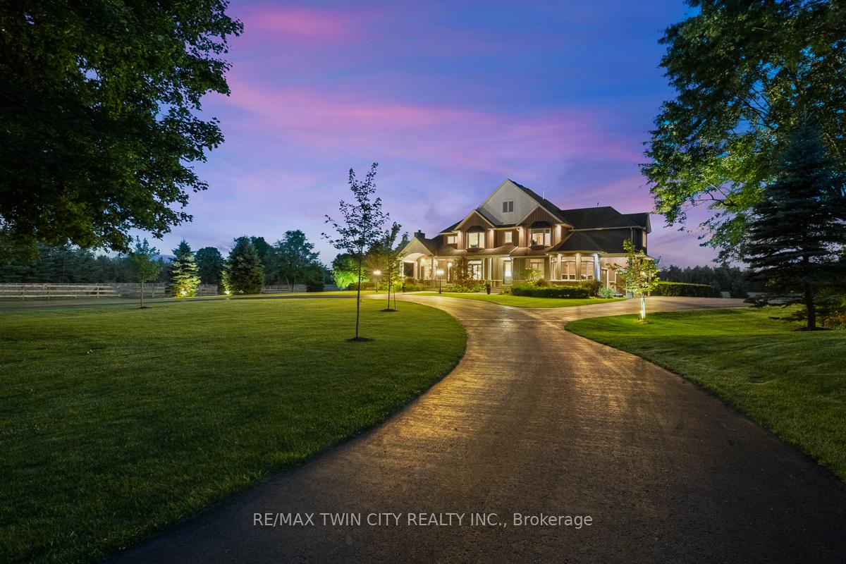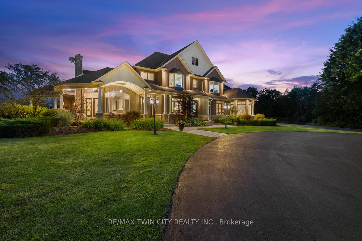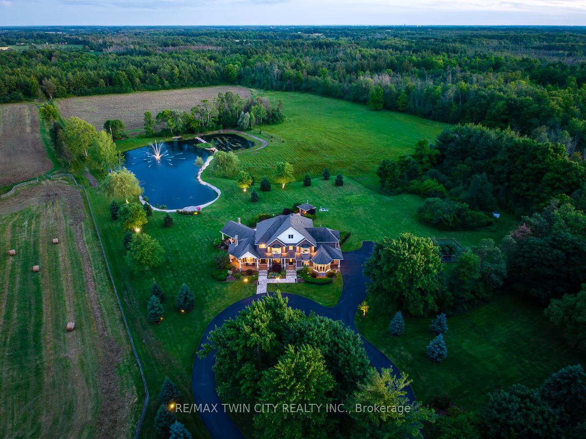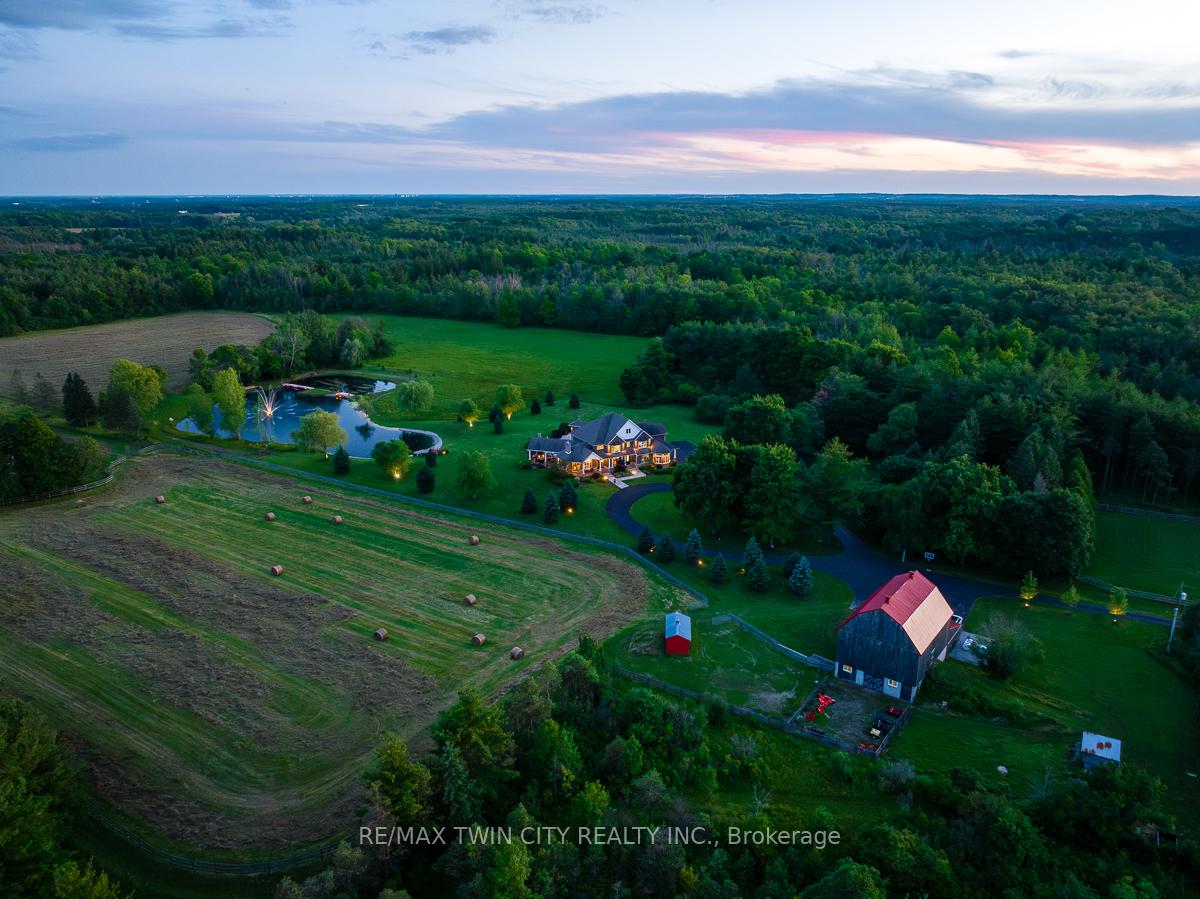Scenic Flamborough is a part of southwestern Ontario known for farms and horse ranches. Located between Cambridge and Hamilton is this completely private, calendar book property on 90 acres. The home is set back from the main road with mature natural beauty as a buffer. A manicured tree line separates the driveway from the paddocks leading up to the home with approximately 15 acres of cultivable land, pastures, and gardens. The barn is suited for horses, complete with hydro, running water, four stalls, tack room, and massive hay loft. Attached to it is an oversized 3 bay garage providing space for utility vehicle storage and a workshop. In the centre of the property is a beautiful two story home at over 6800 square feet of finished space including the basement, with in-floor heating throughout the entire home and subdivided triple car garage. The board and batten/stone skirt exterior, wrap around porch, large windows, and soaring ceilings give the home its luxury farmhouse feel. It offers capacity for living and entertaining with 3 bedrooms plus a spa like primary suite, 6 bathrooms, beautiful living room with stunning fireplace, gourmet kitchen with butler pantry, and oversized dining room open to the nook and family room also featuring an elegant stone fireplace with timber mantel. The main floor office and laundry offer convenience. The basement was designed with recreation in mind offering a games room, wet bar and home theatre with surround sound and projection system. The basement level is also directly accessible from the garage via the second staircase. Relaxation extends to the outdoors with a backyard heated saltwater pool, 20′ x 30′ Muskoka room and wood burning stone fireplace and chimney. The views are gorgeous in every direction; to the south it overlooks a private acre pond complete with beach and aerating fountain, and behind it over 74 acres of forest with a 4 km network of trails for walking and riding. A truly stunning property!