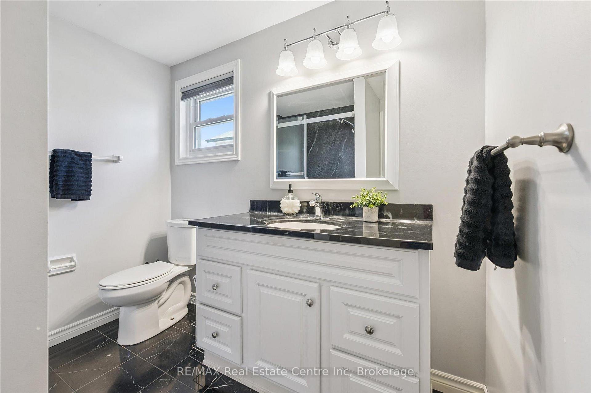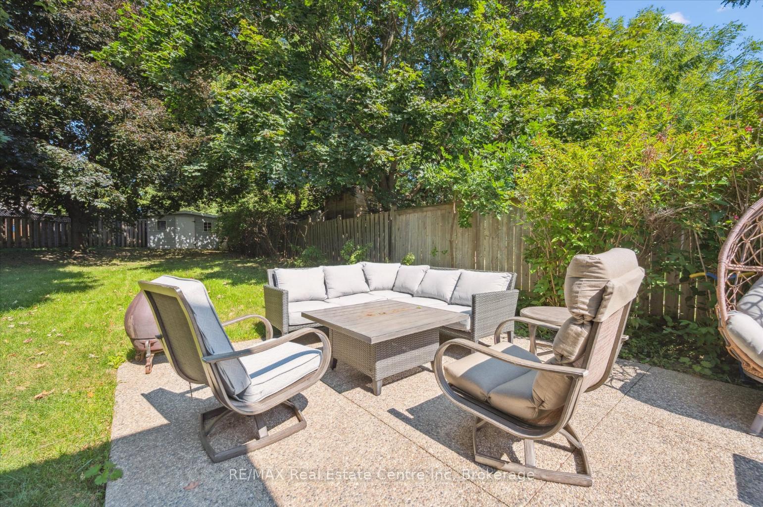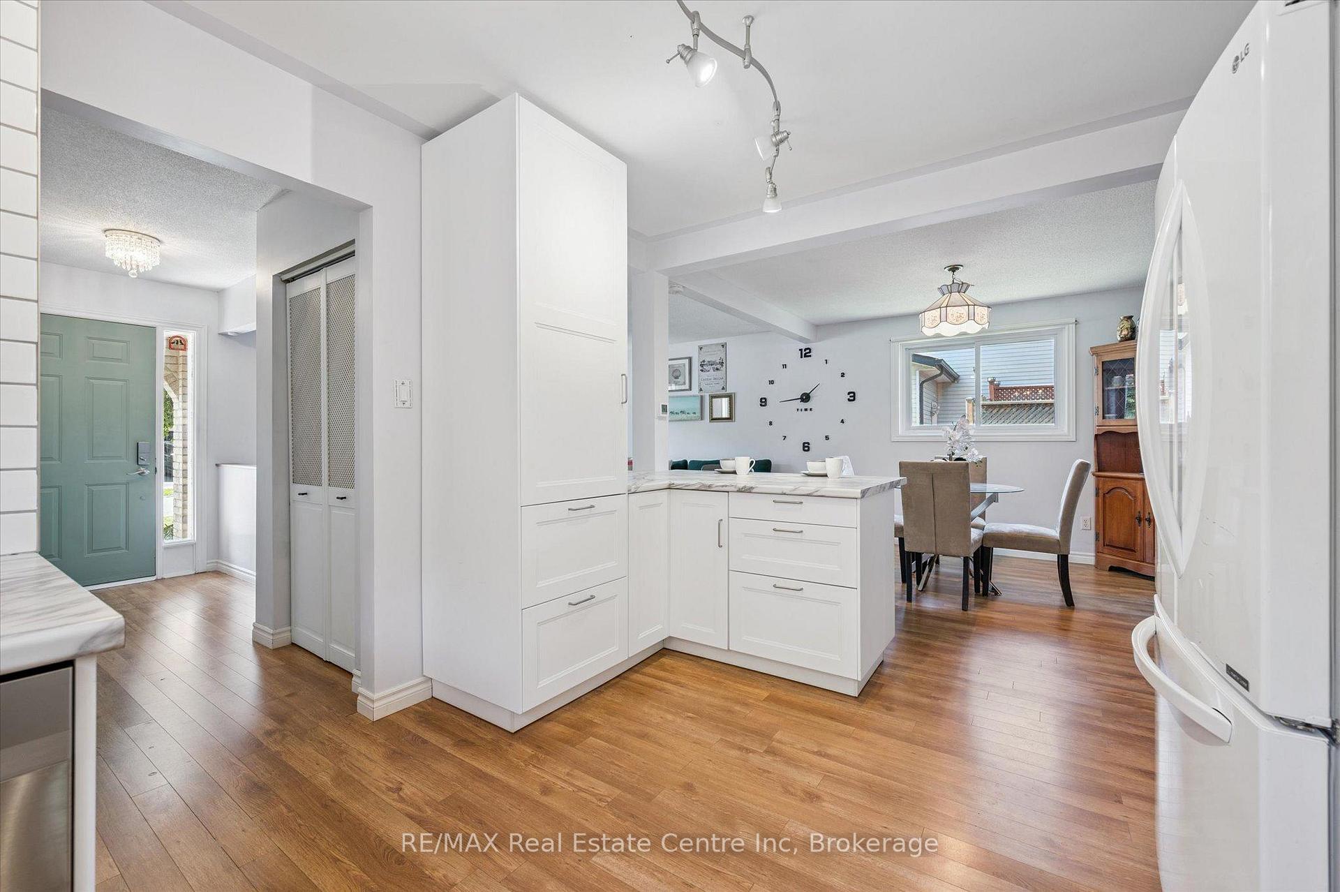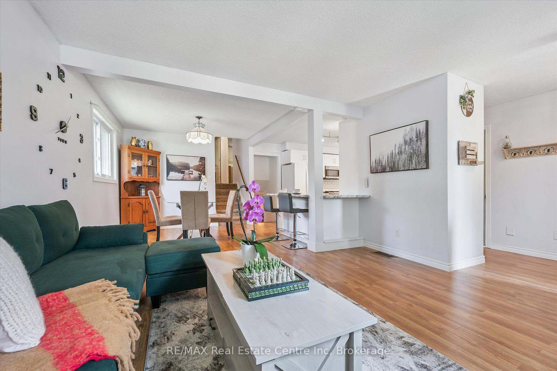 Charming & move-in-ready 3-bdrm backsplit W/fully finished bsmt on massive pool-sized lot in quiet family-friendly neighbourhood! Surrounded by amenities & steps from schools, shops & green space, this home delivers comfort, space & convenience. Step inside to bright & spacious living/dining area where large front-facing windows flood the space W/natural light. Beautiful hardwood floors add warmth throughout & open dining area provides the perfect setting for family dinners & hosting guests. Renovated in 2025 the kitchen blends style & function W/white cabinetry, updated counters, subway tile backsplash, dbl sink under large window & mostly S/S appliances incl. gas stove, new dishwasher & microwave. Its practical layout makes both daily living & entertaining a breeze. Up a few steps you’ll find 3 large bdrms each W/ample closet space, generous windows & neutral tones to suit any style. Updated 4pc bath W/sleek glass door tub/shower (2025), oversized vanity & modern tile flooring. Finished bsmt W/huge rec room, vinyl flooring (2022) & gas fireplace. Whether you need a home theatre, games room, gym or play area-there’s more than enough room for it all. 2pc bath completes this level. Step outside to expansive concrete patio overlooking massive treelined yard that’s both private & fully fenced. Whether you’re BBQing, gardening or watching kids & pets play freely-this backyard offers endless potential. Large shed in back for storage needs. Recent updates: new 30′ x 15′ concrete patio (2023), soffits & eavestroughs (2020) & roof (2017) providing peace of mind for yrs to come. Set on quiet street W/minimal traffic this home is located around the corner from shopping centre W/groceries, pharmacy & dining. Short stroll to Hespeler Public School, mins from Hespeler Village known for charming restaurants & boutiques. Moments from 401 for easy commuting. This home offers perfect mix of space, privacy & convenience W/all essentials nearby & a community vibe that’s hard to beat!
