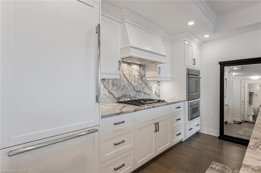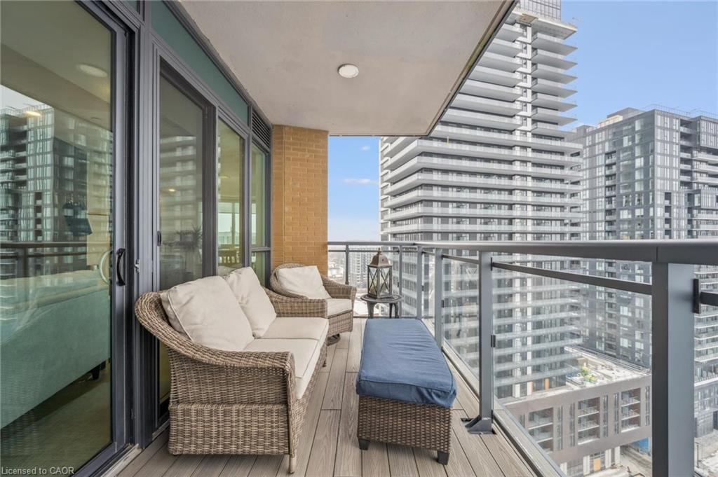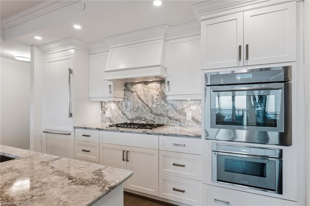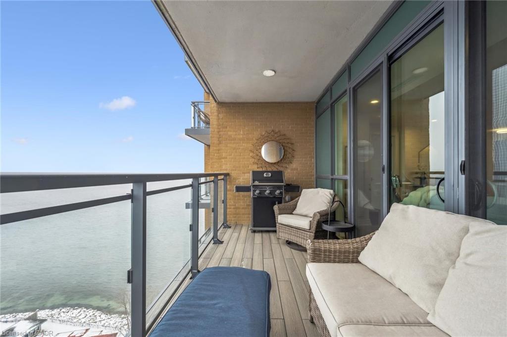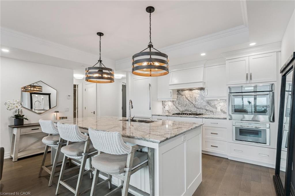 The upgraded kitchen includes Thermador appliances, a five-burner gas cooktop, upgraded large island with additional lower cabinet storage, and a layout designed to capture the lake views. The living and dining areas offer generous space for multiple furniture configurations, with an upgraded large 36” gas fireplace, perfect for warm winter evenings and direct access to the balcony equipped with a gas line for a barbecue and upgraded maintenance free, custom balcony decking from Condo Kandy.