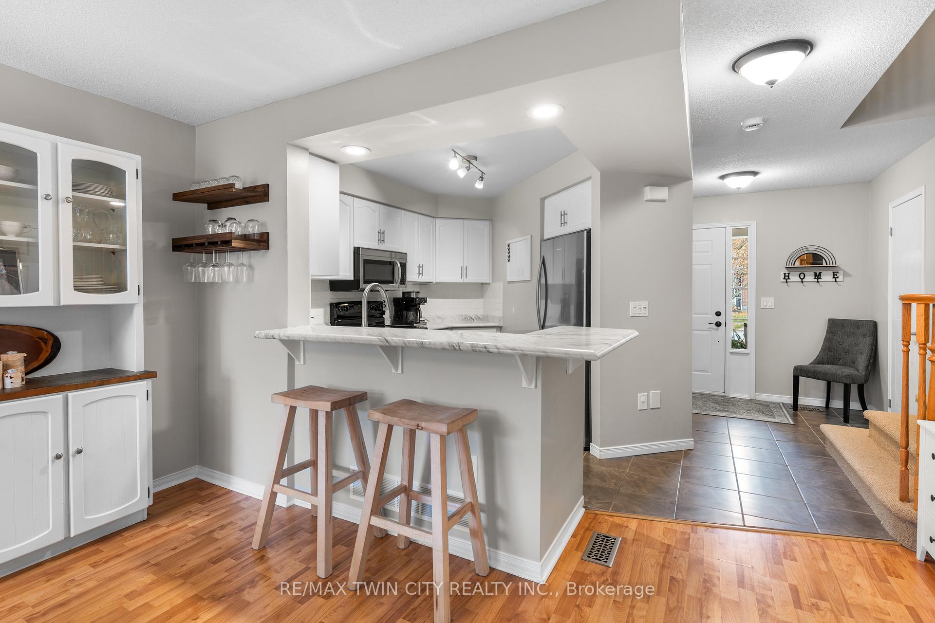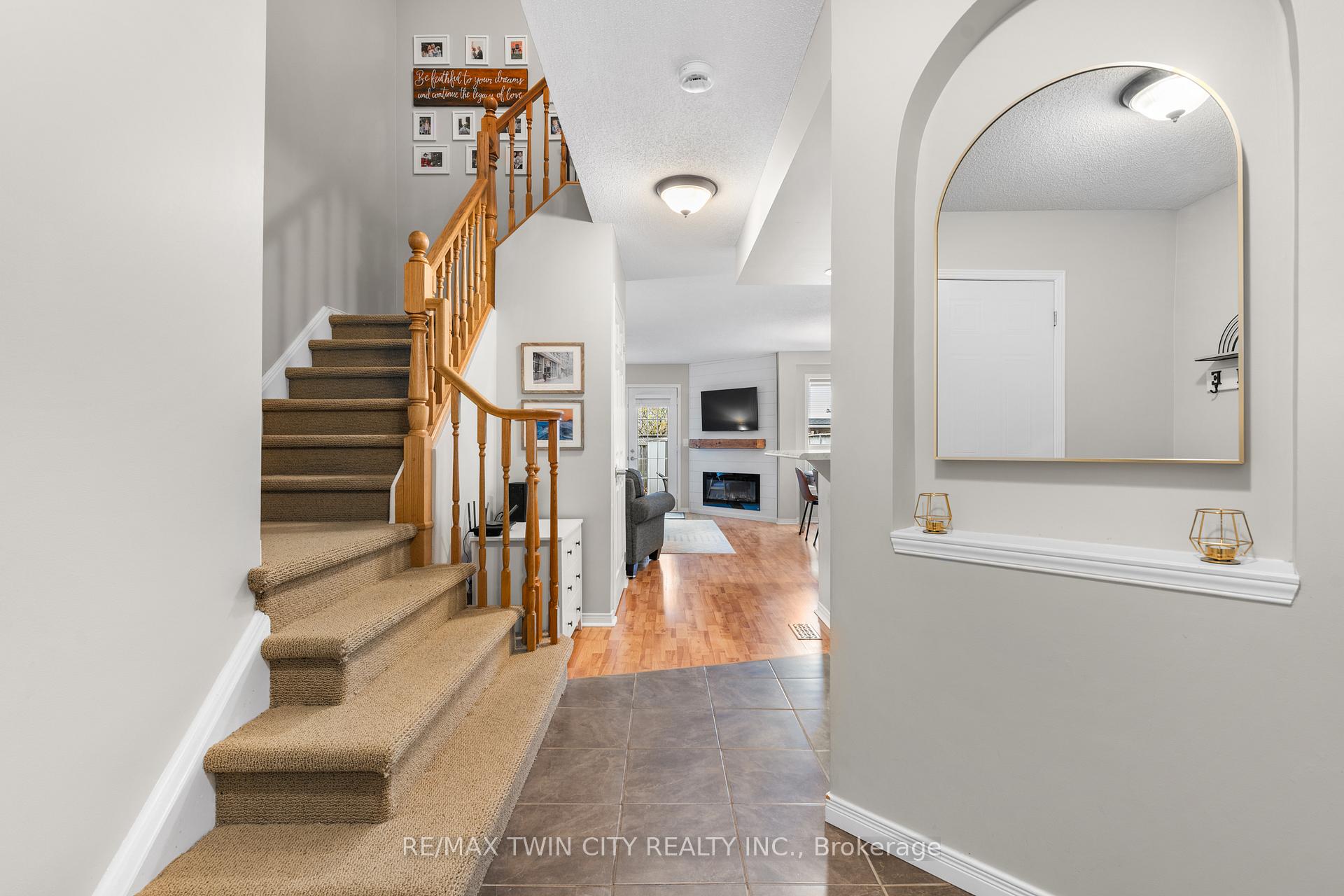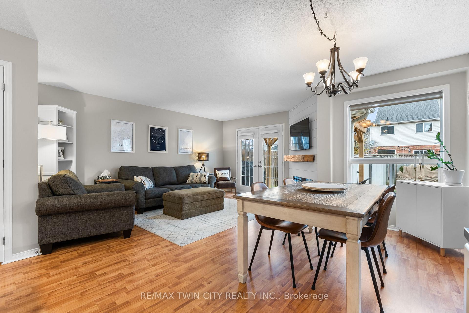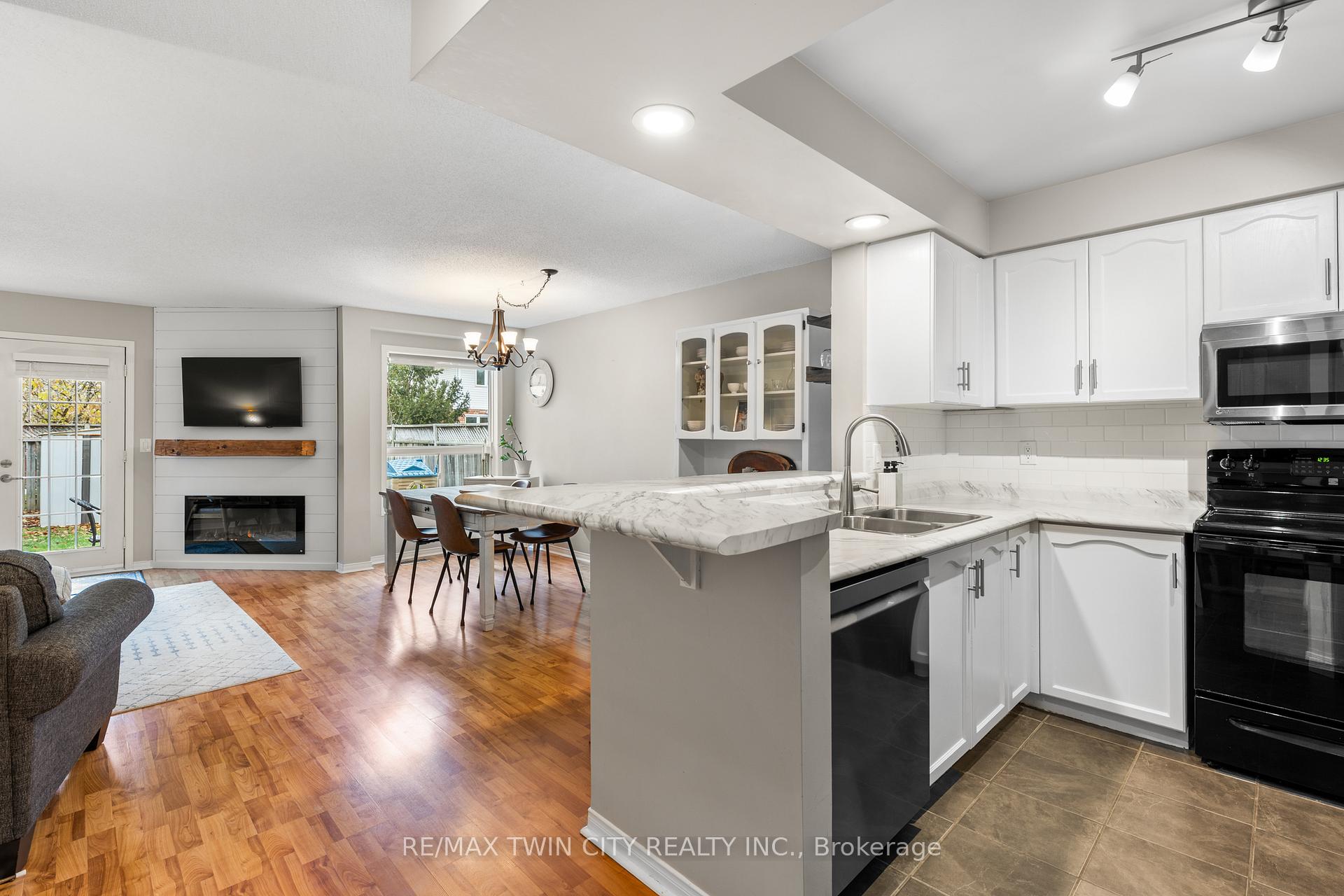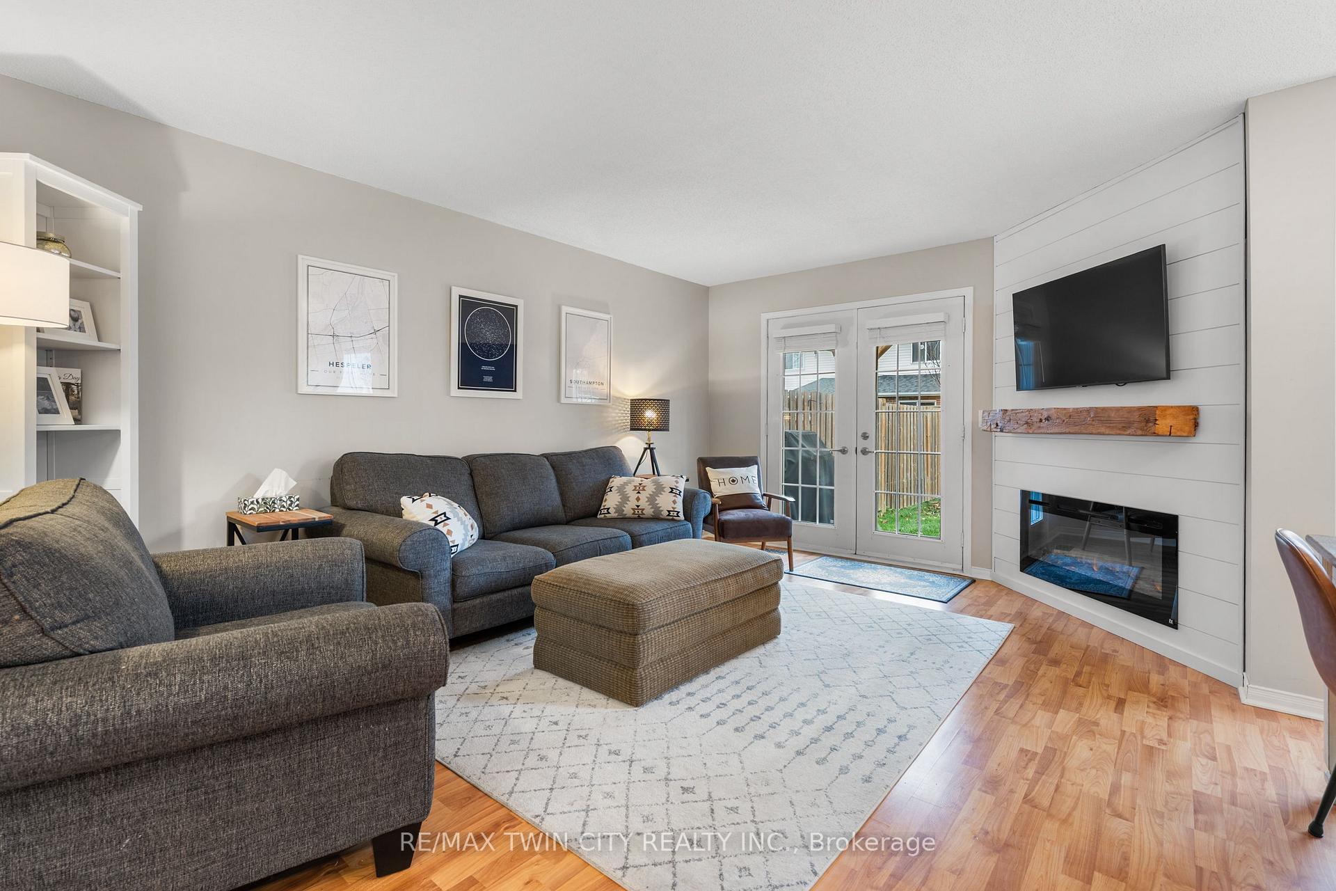 Welcome to Townline Estates! This well-maintained freehold townhome offers an ideal blend of comfort, functionality, and location. Featuring 3 bedrooms and 2 bathrooms, this home is perfect for families, professionals, or first-time buyers. The open-concept main floor is bright and inviting with a carpet-free layout, highlighted by a cozy electric fireplace in the family room. The modern kitchen boasts stainless steel appliances, a breakfast bar, and a built-in microwave, making it ideal for both everyday living and entertaining. Convenient garage access from the front foyer adds everyday practicality. Upstairs, the spacious primary bedroom offers ample room to unwind, while the cheater en-suite provides added convenience. Step outside through French doors to a private, fully fenced backyard featuring a deck with pergola-perfect for summer entertaining. Additional exterior highlights include an attached garage, private double driveway, and stamped concrete accents. The unfinished basement offers excellent future potential and includes rough-ins for a bathroom and central vacuum. Notable updates include: Fridge (3 yrs), Furnace (4 yrs), A/C (3 yrs), Owned water softener (6 yrs) and Roof (approx. 8 yrs)Ideally located minutes to Highway 401 access via Townline Road, and close to amenities, schools, and shopping. A fantastic opportunity to own in a desirable neighbourhood-move-in ready with room to grow.