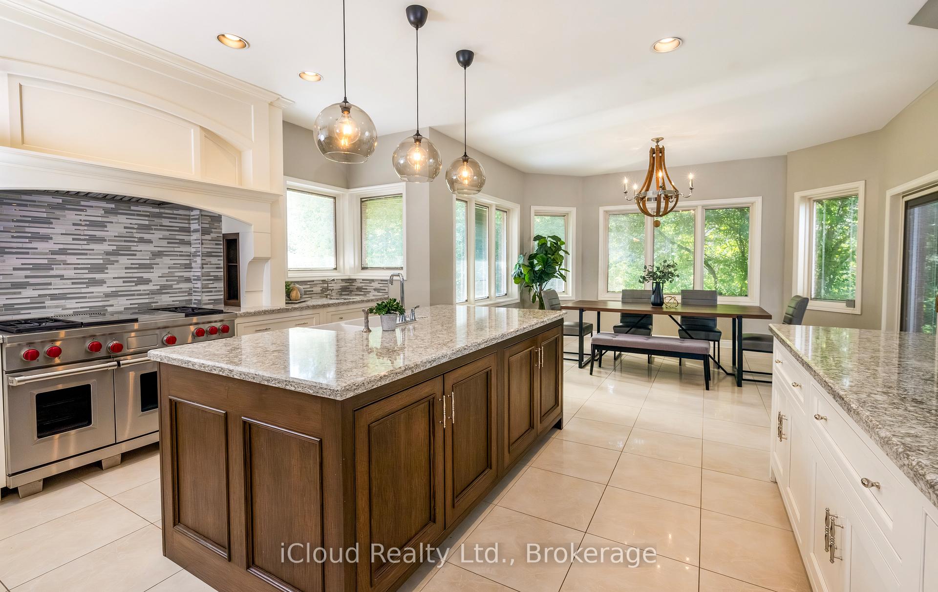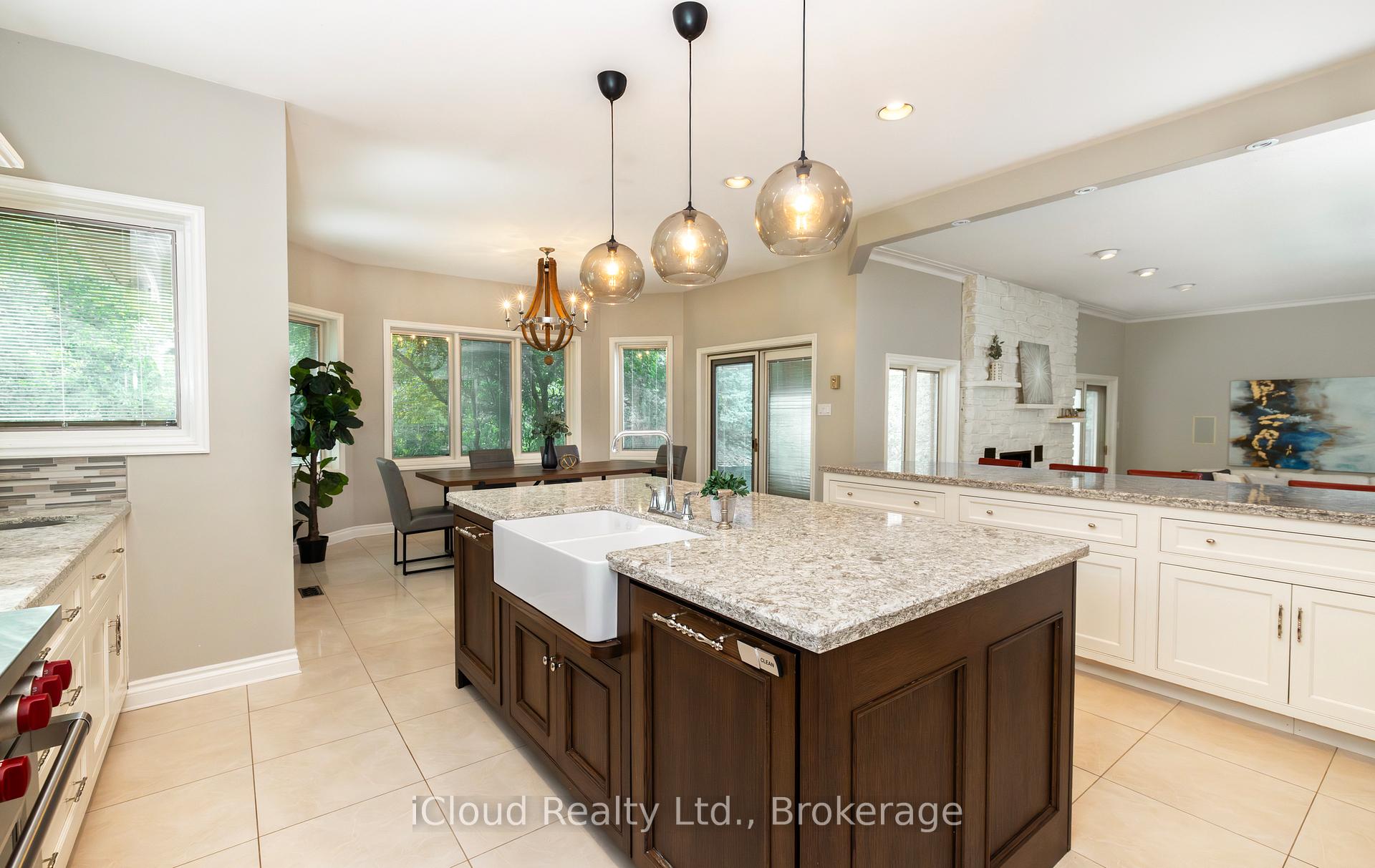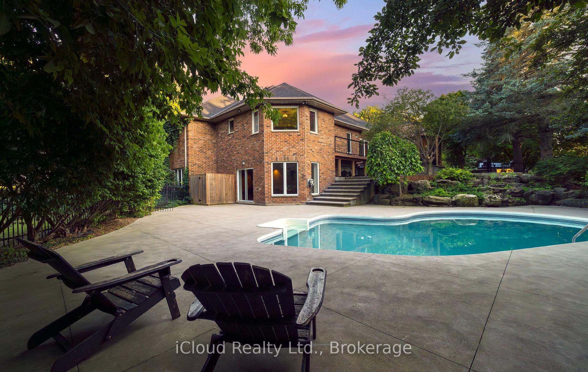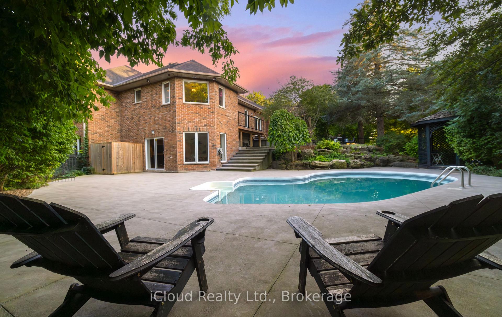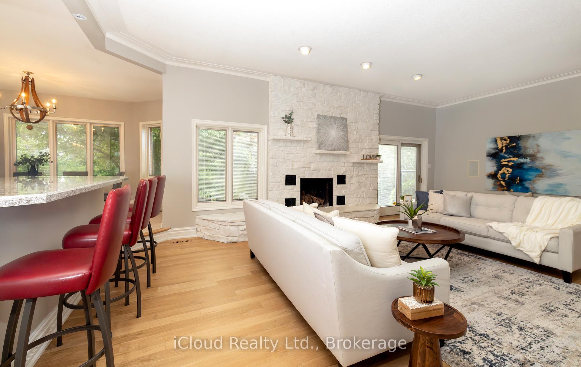Set amid a community of upscale estate properties, this refined residence offers over 6,500 sq ft of luxurious living on a 1.12-acre lot in the heart of Campbellville. The grand foyer showcases herringbone-laid white oak flooring, leading into a formal dining room and a sunlit kitchen featuring Quartz counters, double islands, Wolf appliances, and designer lighting. The bright breakfast area opens to multiple levels of patios and decks, perfect for dining, lounging, and entertaining outdoors. A sunken family room overlooks the kitchen and includes a wood-burning fireplace with a classic brick surround. The formal living and dining rooms offer their own fireplaces, double-door entries, crown moulding, and oversized windows that bring in natural light. In the east wing, the expansive primary suite includes a romantic accent wall, designer sconces, a walk-in closet, a five-piece spa-inspired ensuite, and access to a private deck. Three additional bedrooms provide generous space; one includes a gas fireplace, while the others share a four-piece bathroom. A two-piece powder room completes this wing. The west wing includes a large mudroom, a second powder room, and a laundry room with built-in cabinetry. This area provides access to the garage, backyard, and a separate entrance to the basement. A bold black-and-white circular staircase leads to the lower level, where you’ll find a spacious recreation room with a wet bar and fireplace, a walk-out to the backyard, a fifth bedroom, a four-piece bathroom with a sauna, and a gym with a private entrance. The backyard retreat features an in-ground saltwater pool, tiered concrete patios, a charming gazebo, and lush perennial gardens, all surrounded by mature trees for complete privacy. A stone circular driveway, three-car garage, and classic brick-and-stone facade create an elegant first impression. All are just minutes from major commuter routes, shops, and restaurants.