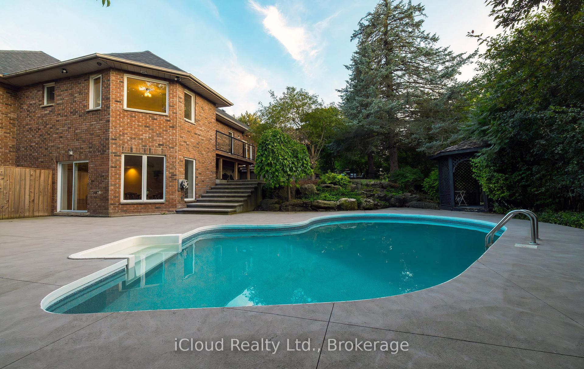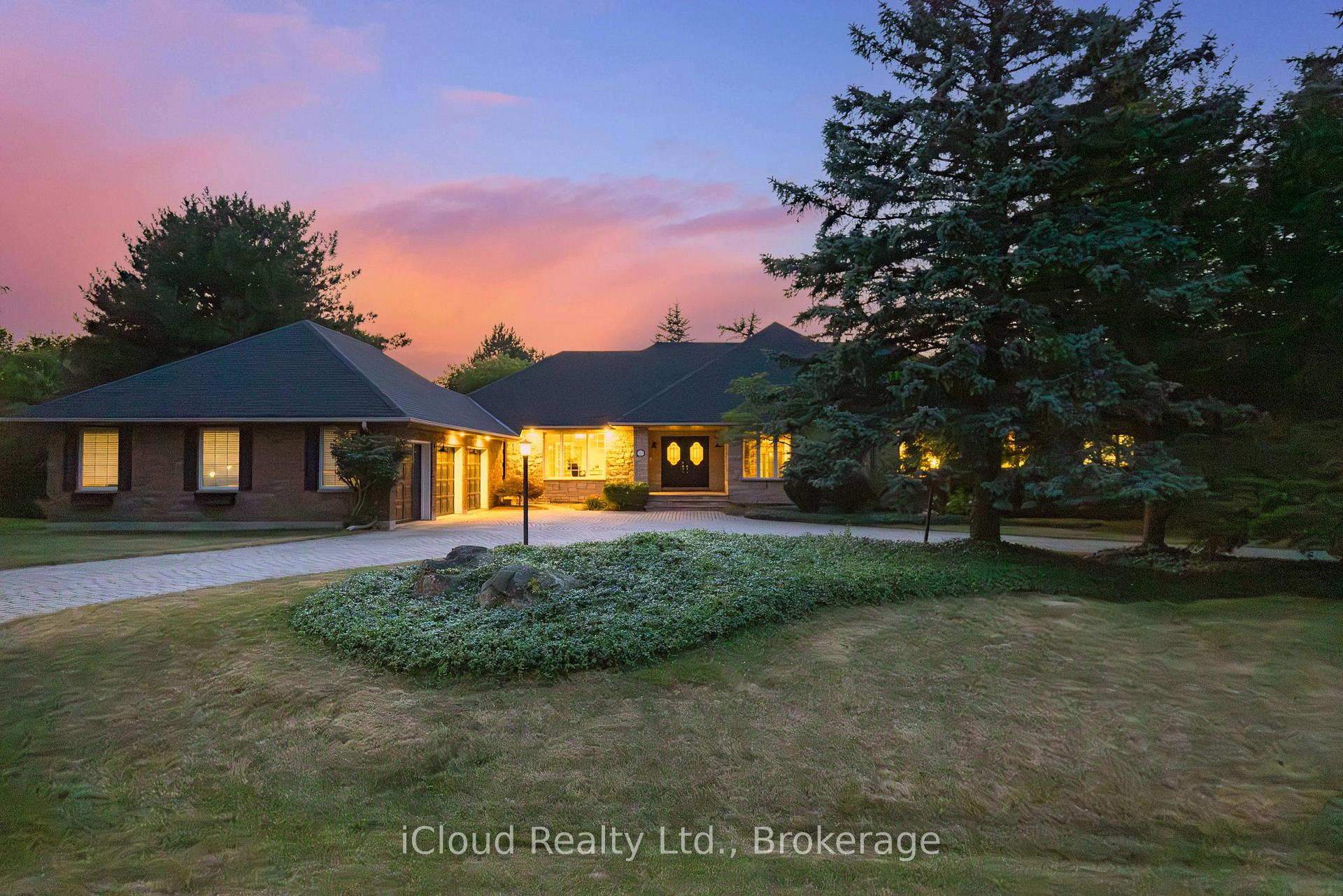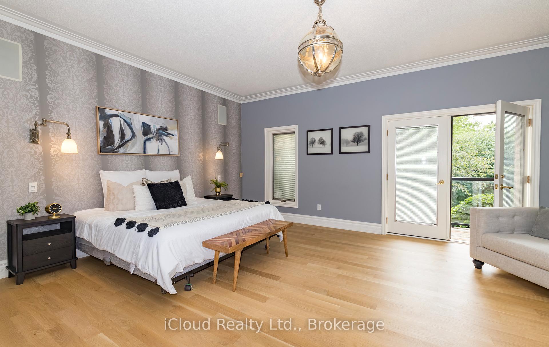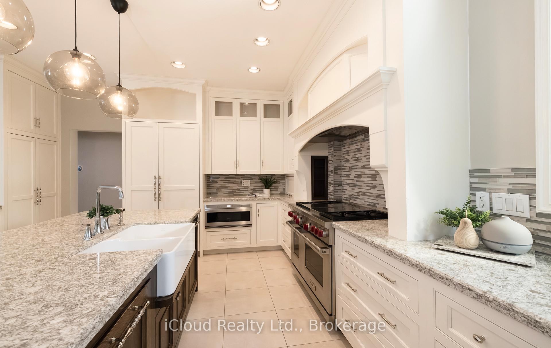 Set amid a community of upscale estate properties, this refined residence offers over 6,500 sq ft of luxurious living on a 1.12-acre lot in the heart of Campbellville. The grand foyer showcases herringbone-laid white oak flooring, leading into a formal dining room and a sunlit kitchen featuring Quartz counters, double islands, Wolf appliances, and designer lighting. The bright breakfast area opens to multiple levels of patios and decks, perfect for dining, lounging, and entertaining outdoors. A sunken family room overlooks the kitchen and includes a wood-burning fireplace with a classic brick surround. The formal living and dining rooms offer their own fireplaces, double-door entries, crown moulding, and oversized windows that bring in natural light. In the east wing, the expansive primary suite includes a romantic accent wall, designer sconces, a walk-in closet, a five-piece spa-inspired ensuite, and access to a private deck. Three additional bedrooms provide generous space; one includes a gas fireplace, while the others share a four-piece bathroom. A two-piece powder room completes this wing. The west wing includes a large mudroom, a second powder room, and a laundry room with built-in cabinetry. This area provides access to the garage, backyard, and a separate entrance to the basement. A bold black-and-white circular staircase leads to the lower level, where you’ll find a spacious recreation room with a wet bar and fireplace, a walk-out to the backyard, a fifth bedroom, a four-piece bathroom with a sauna, and a gym with a private entrance. The backyard retreat features an in-ground saltwater pool, tiered concrete patios, a charming gazebo, and lush perennial gardens, all surrounded by mature trees for complete privacy. A stone circular driveway, three-car garage, and classic brick-and-stone facade create an elegant first impression. All are just minutes from major commuter routes, shops, and restaurants.