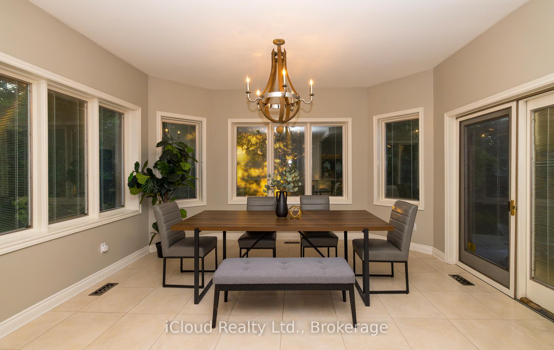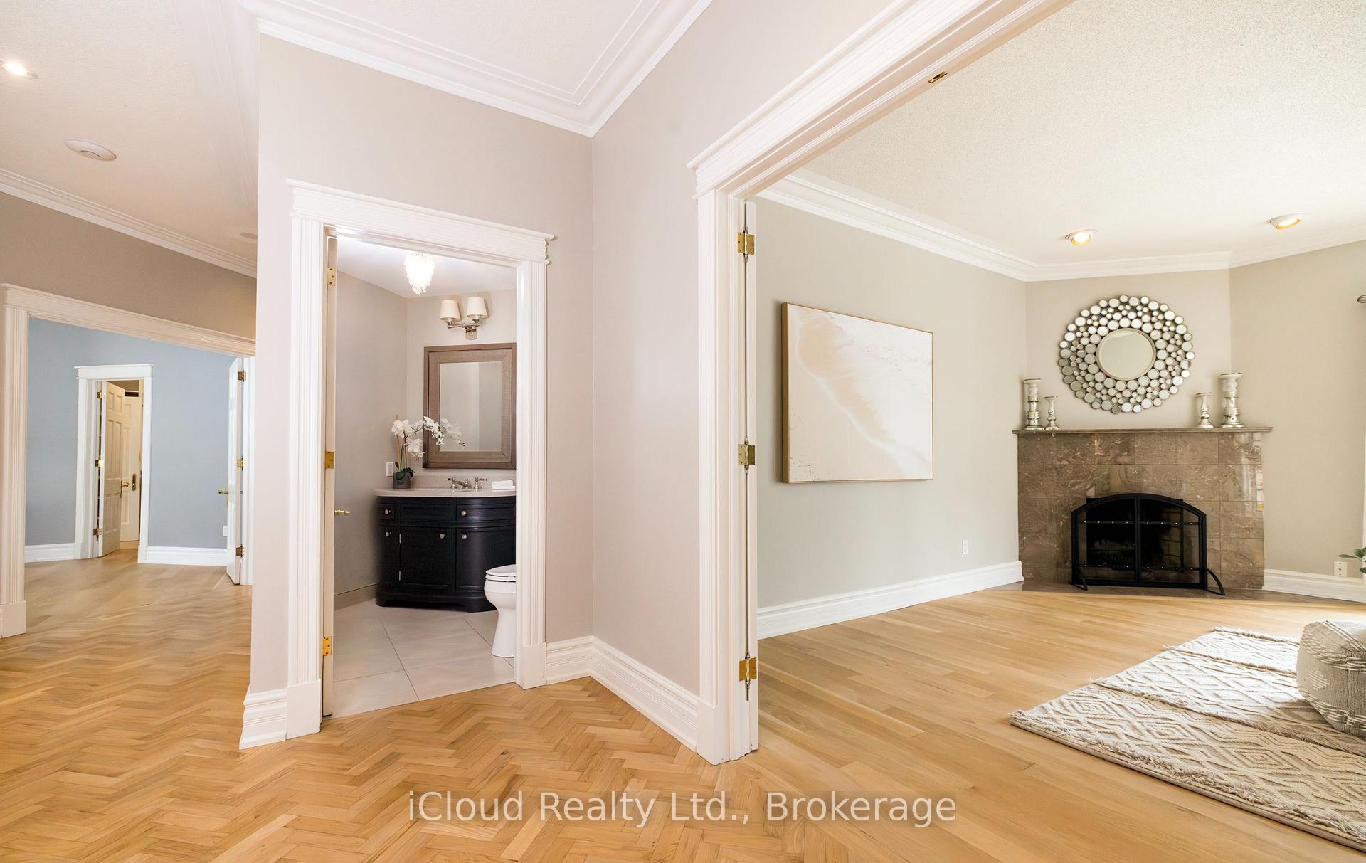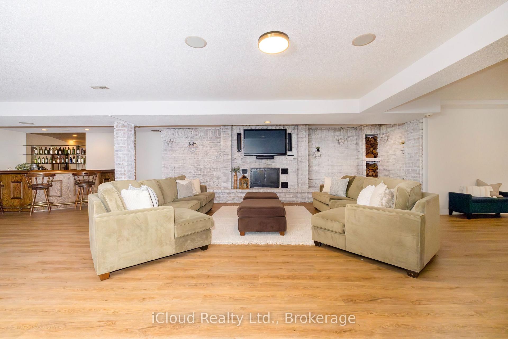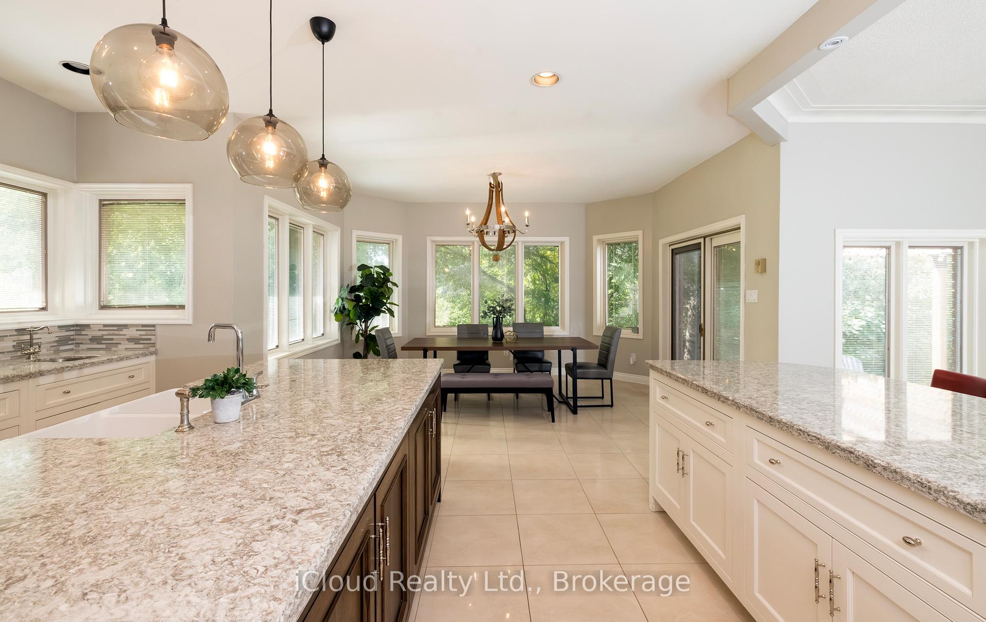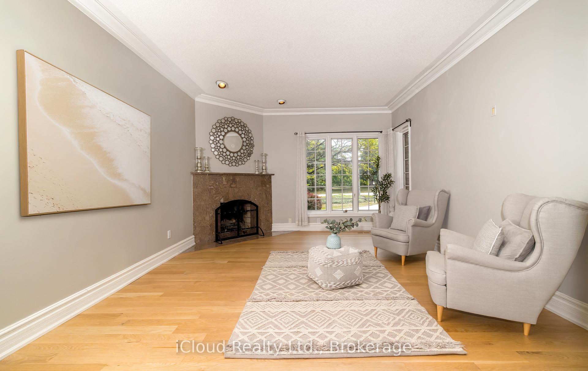 Set amid a community of upscale estate properties, this refined residence offers over 6,500 sq ft of luxurious living on a 1.12-acre lot in the heart of Campbellville. The grand foyer showcases herringbone-laid white oak flooring, leading into a formal dining room and a sunlit kitchen featuring Quartz counters, double islands, Wolf appliances, and designer lighting. The bright breakfast area opens to multiple levels of patios and decks, perfect for dining, lounging, and entertaining outdoors. A sunken family room overlooks the kitchen and includes a wood-burning fireplace with a classic brick surround. The formal living and dining rooms offer their own fireplaces, double-door entries, crown moulding, and oversized windows that bring in natural light. In the east wing, the expansive primary suite includes a romantic accent wall, designer sconces, a walk-in closet, a five-piece spa-inspired ensuite, and access to a private deck. Three additional bedrooms provide generous space; one includes a gas fireplace, while the others share a four-piece bathroom. A two-piece powder room completes this wing. The west wing includes a large mudroom, a second powder room, and a laundry room with built-in cabinetry. This area provides access to the garage, backyard, and a separate entrance to the basement. A bold black-and-white circular staircase leads to the lower level, where you’ll find a spacious recreation room with a wet bar and fireplace, a walk-out to the backyard, a fifth bedroom, a four-piece bathroom with a sauna, and a gym with a private entrance. The backyard retreat features an in-ground saltwater pool, tiered concrete patios, a charming gazebo, and lush perennial gardens, all surrounded by mature trees for complete privacy. A stone circular driveway, three-car garage, and classic brick-and-stone facade create an elegant first impression. All are just minutes from major commuter routes, shops, and restaurants.