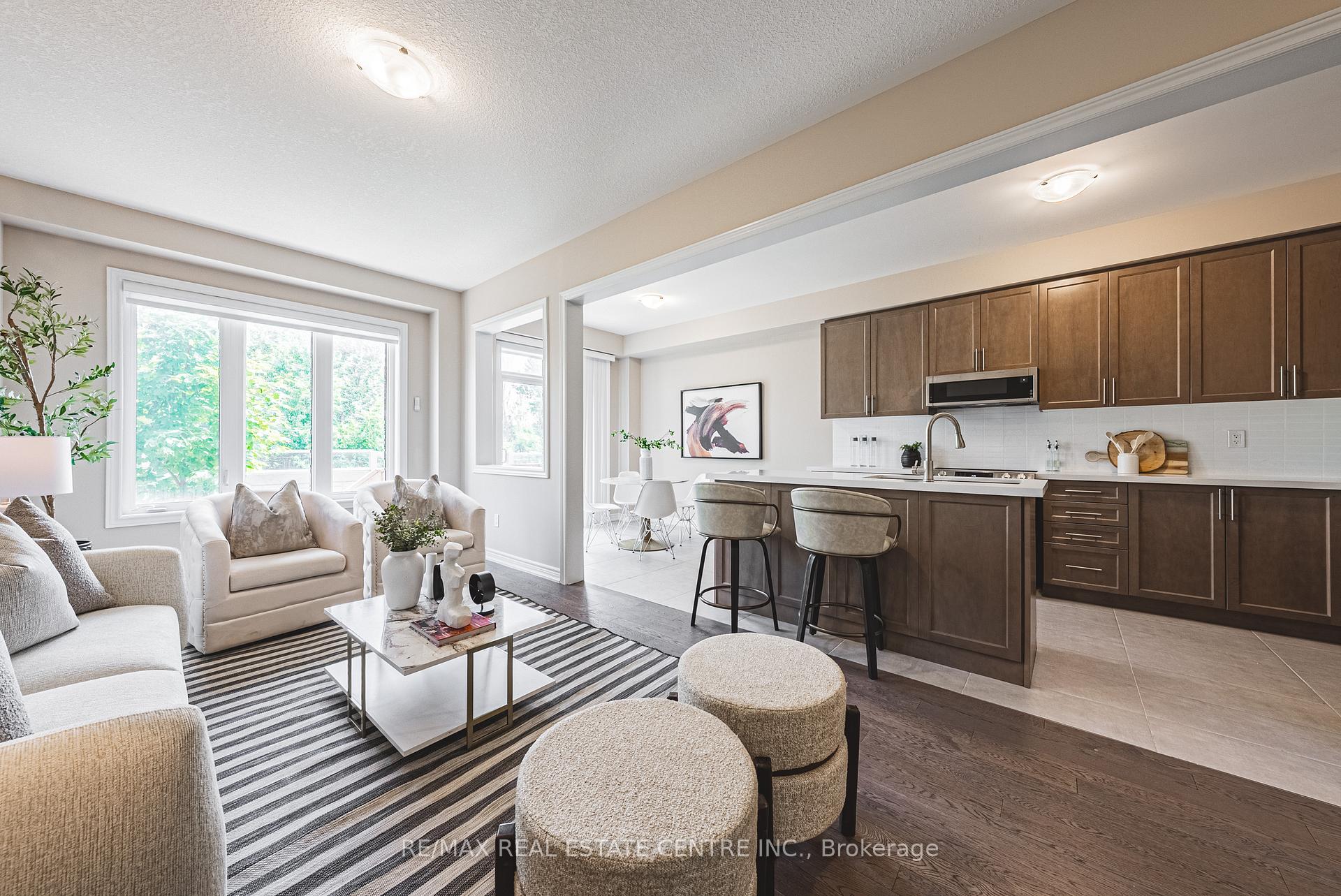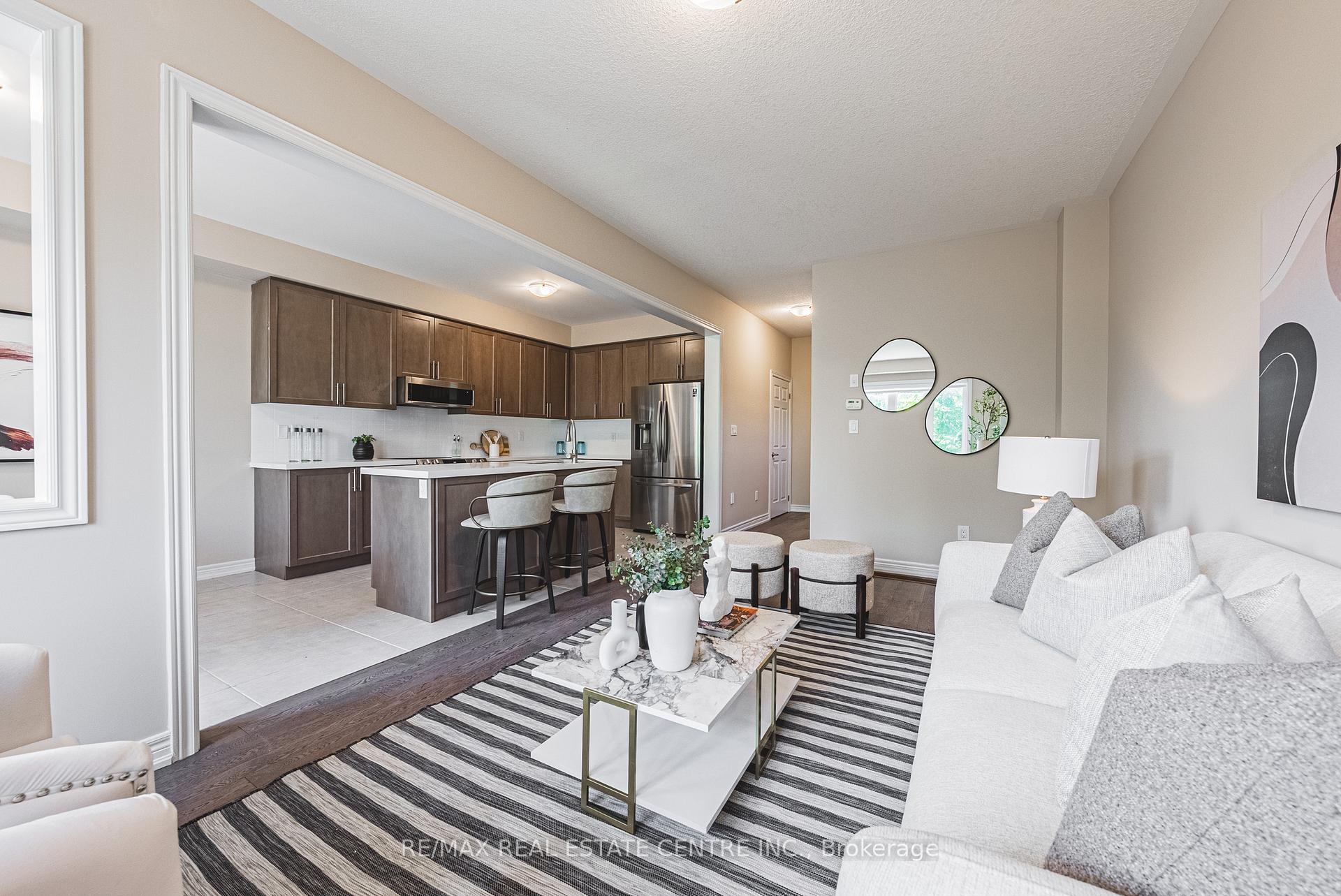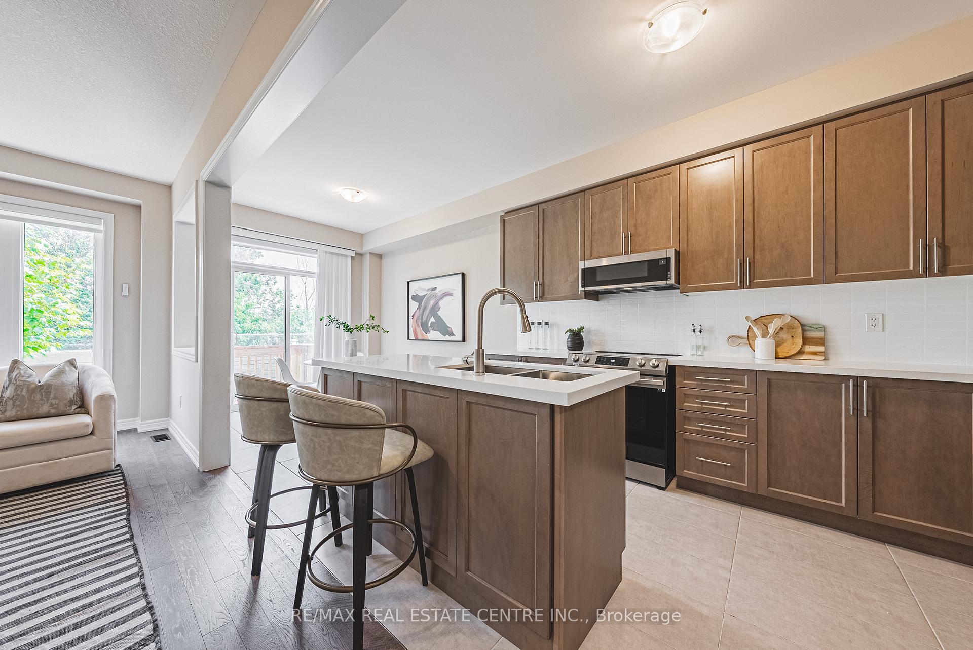 Welcome to this modern executive end-unit townhome in the heart of Guelph. Offering 3 bedrooms and 3 bathrooms across two well-designed levels, this home is located in a quiet, family-friendly neighbourhood and backs onto a private ravine, providing rare privacy and a tranquil setting. The main floor features hardwood flooring and a solid wood staircase. The open-concept kitchen includes quartz countertops, a centre island, stylish backsplash, and upgraded stainless steel appliances-ideal for entertaining and everyday living. Upstairs, the spacious primary bedroom offers a walk-in closet and a full ensuite. Two additional west-facing bedrooms provide generous space, double closets, and excellent natural light. Built in 2022, this home offers modern construction and energy efficiency. Convenient access to Highways 6, 7, and 401, close to top-rated schools, and minutes to University of Guelph (12 min), Conestoga College (7 min), and Centennial College (5 min). Enjoy central Guelph living without big-city congestion. Book your showing today.
