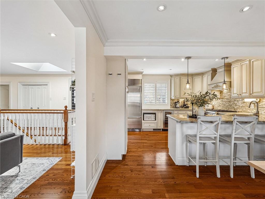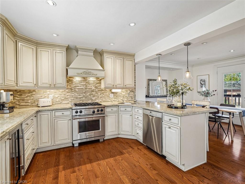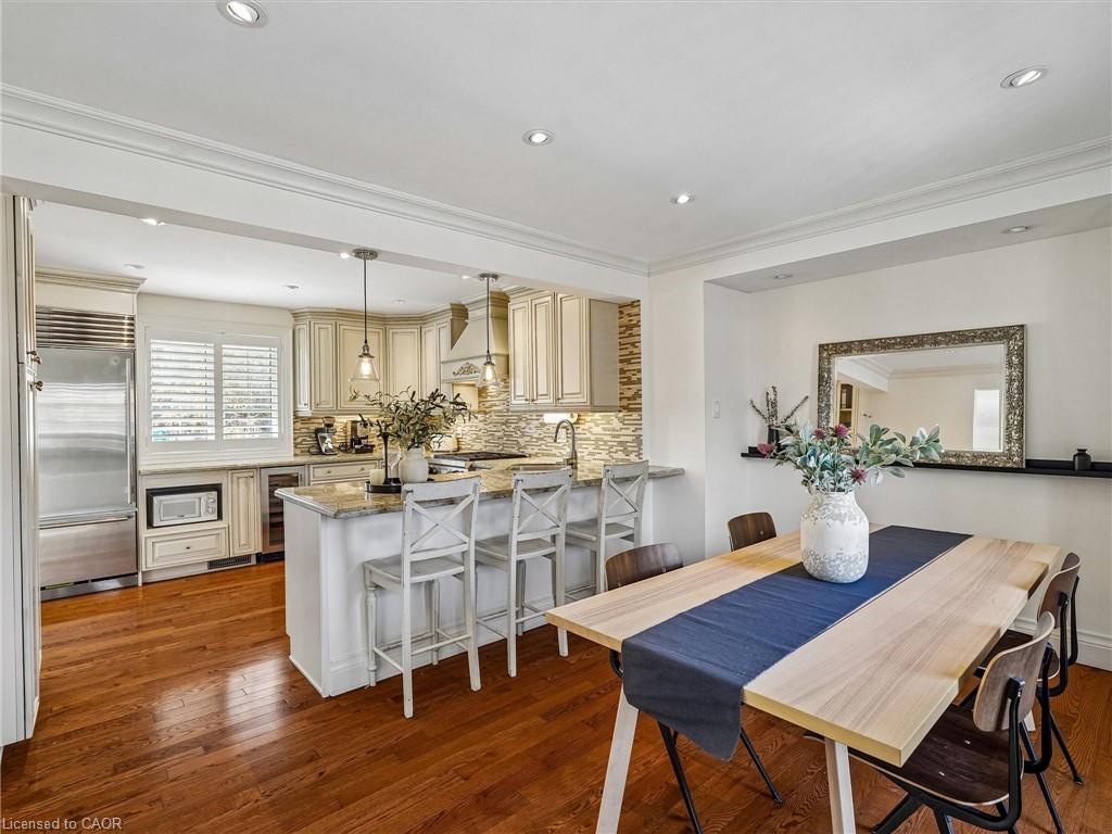 Nestled in the heart of prestigious Morrison, this fabulous bright open-concept bungalow sits on an exceptional 0.35-acre premium lot backing onto tranquil Morrison Creek and fronting onto Lawson Park-offering a rare “Muskoka-like” setting just moments from downtown Oakville, Gairloch Gardens, and the lake. This beautifully maintained 3+2 bedroom residence features a spacious living room with a wood burning fireplace and an effortless flow into the dining area, where a walkout leads to a private balcony overlooking lush gardens and an inviting in-ground swimming pool. The gourmet kitchen is equipped with premium Sub-Zero refrigeration, Sub-Zero wine fridge, and a Wolf gas stove-perfect for both everyday living and entertaining. The primary suite offers a renovated ensuite, while California shutters throughout enhance both elegance and privacy. Newly upgraded broadloom flooring extends through the bedrooms and into the fully finished lower level, which features a large recreation room with gas fireplace, two additional bedrooms (or office/den), a self-contained kitchen, laundry, and a 3-piece bath with heated floors-ideal for an in-law or nanny suite. A tiled walkout provides seamless access to the backyard oasis. An extra-long, updated asphalt driveway accommodates parking for 8+ vehicles. Located within a top-tier school district and directly across from a park, this rare offering combines natural beauty, luxury, and convenience in one of Oakville’s most sought-after neighbourhoods.