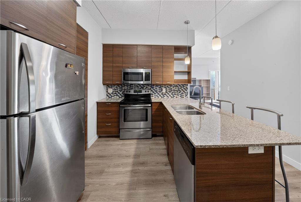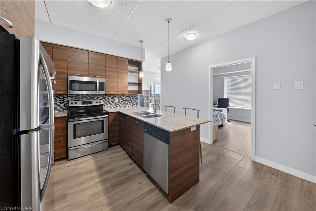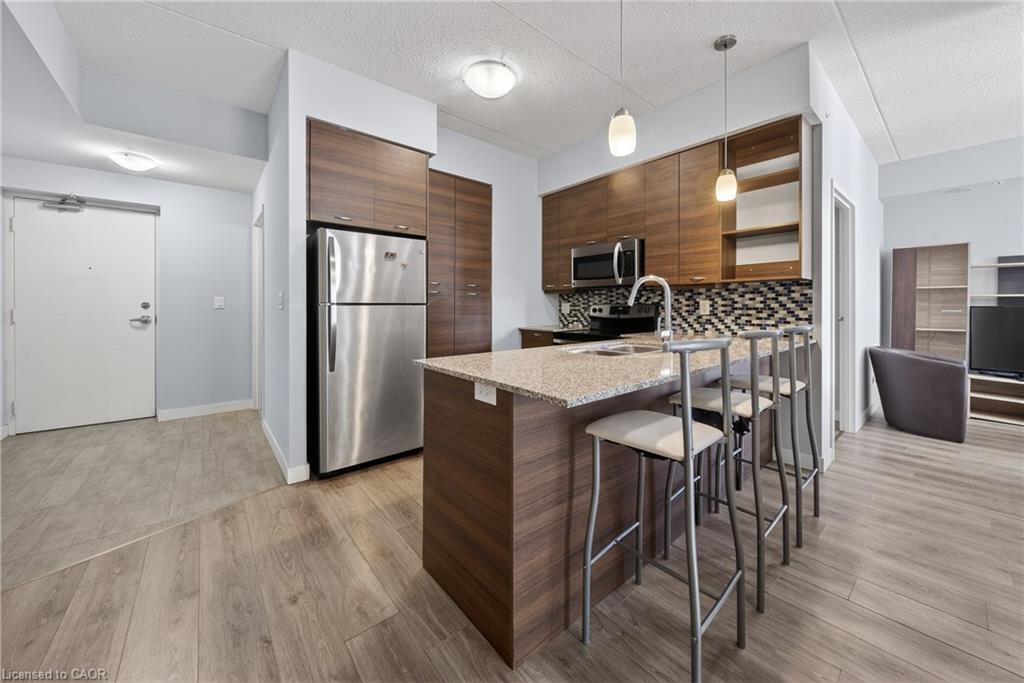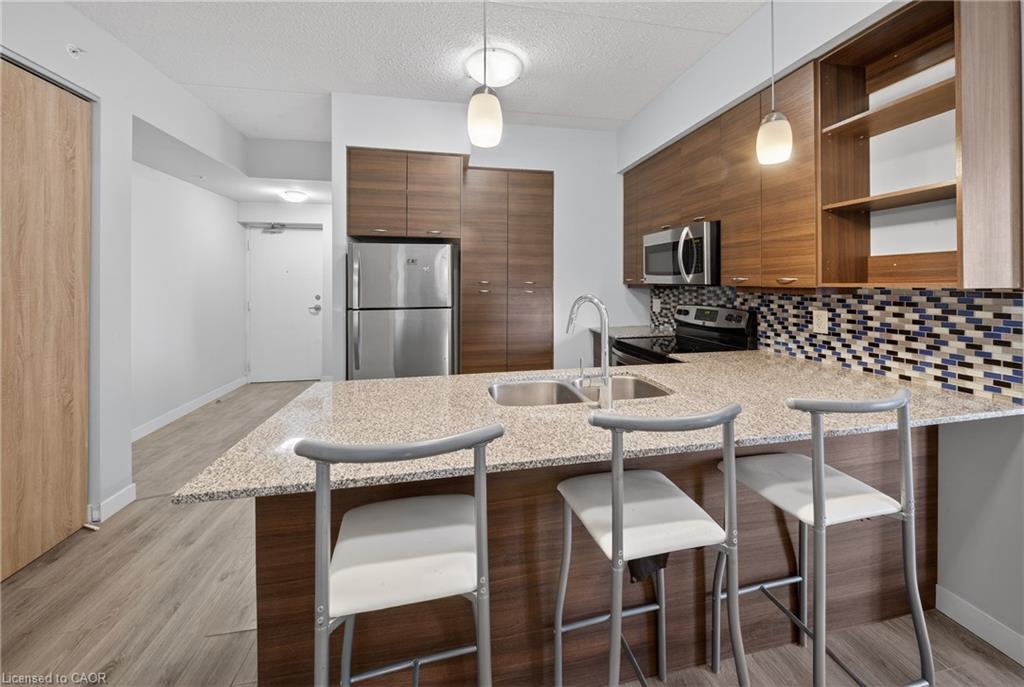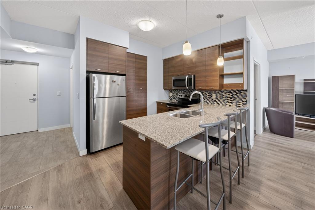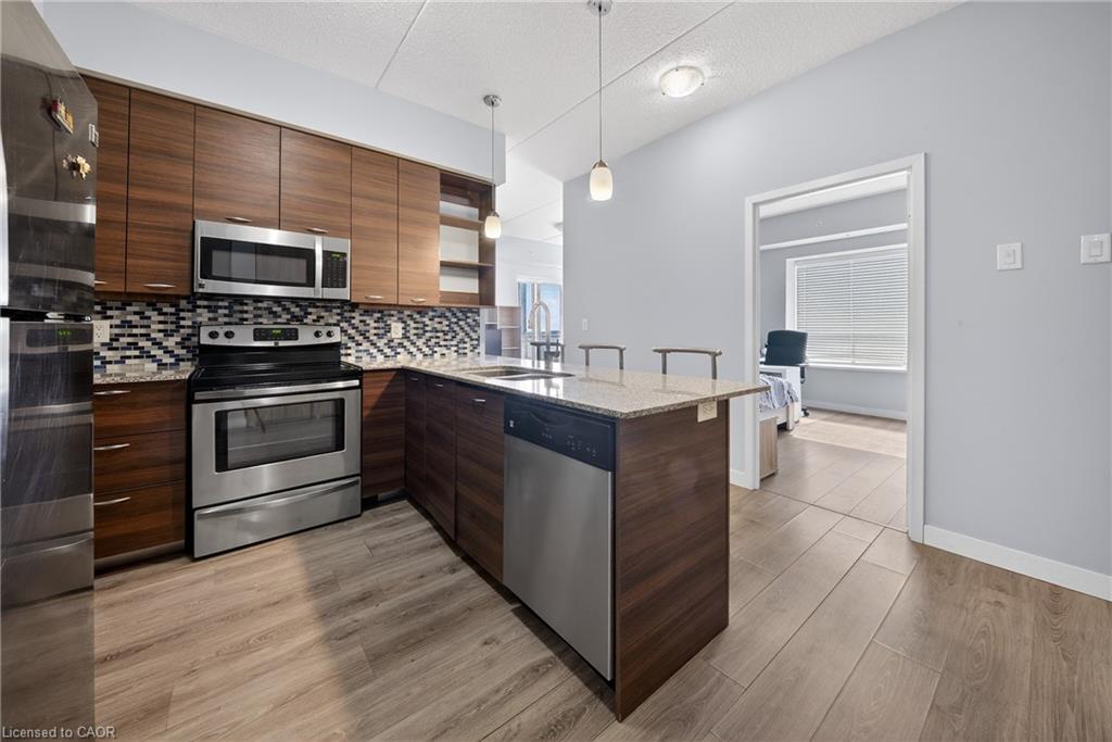 Modern condo living in a well-maintained building just minutes from the University of Waterloo and Wilfrid Laurier University. This bright west-facing suite offers approximately 953 sq. ft. of thoughtfully designed space with 2 bedrooms and 2 bathrooms, ideal for comfortable everyday living or investment potential. The open-concept layout seamlessly connects the kitchen, dining, and living areas, creating a functional and inviting space. The contemporary kitchen features sleek cabinetry, granite countertops, stainless steel appliances, and a breakfast bar with seating-perfect for casual meals or entertaining. A stylish mosaic backsplash adds a modern touch while generous counter space provides practicality for daily use. The living and dining area is filled with natural light from large windows and sliding doors leading to a private open balcony with west-facing exposure-an ideal spot to relax and enjoy sunset views. Durable flooring and neutral finishes throughout make the space easy to personalize. Both bedrooms offer comfortable proportions, while the primary bedroom benefits from its own private ensuite bathroom. Ensuite laundry adds everyday convenience. Residents enjoy access to building amenities while maintenance fees include common elements, heat, water, and central air conditioning, helping simplify monthly expenses. Situated in a vibrant and highly accessible neighbourhood close to universities, shopping, restaurants, transit, and parks, this condo offers an excellent opportunity to experience convenient urban living in Waterloo.