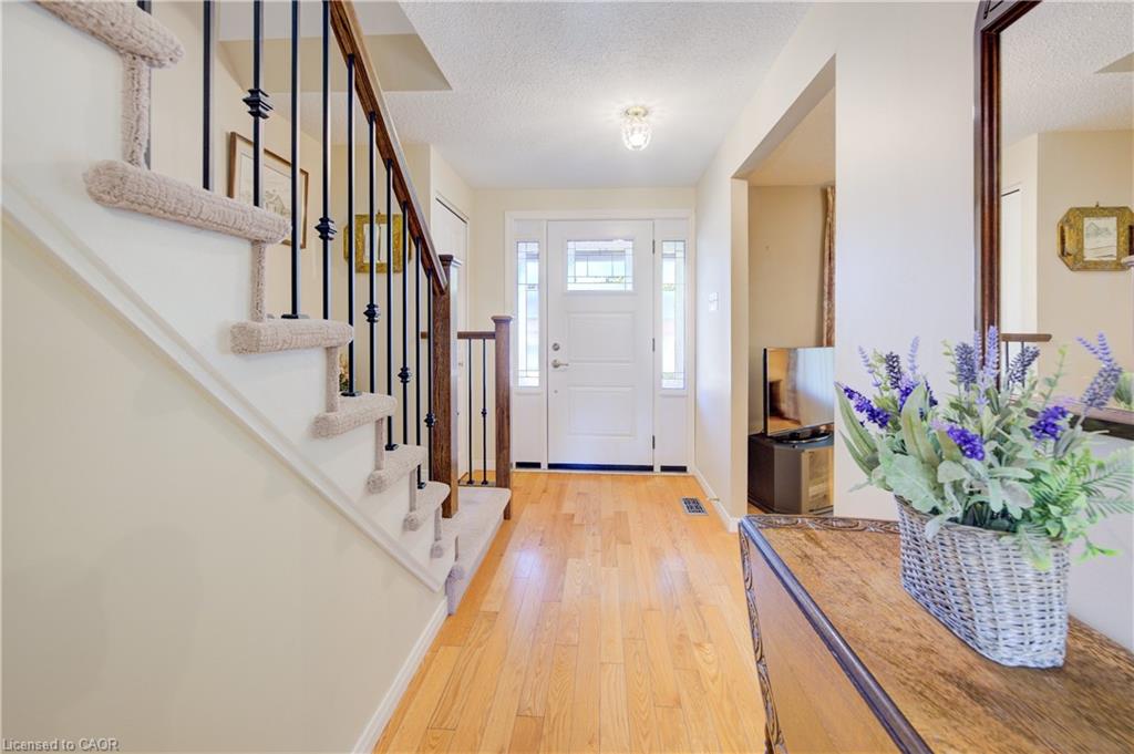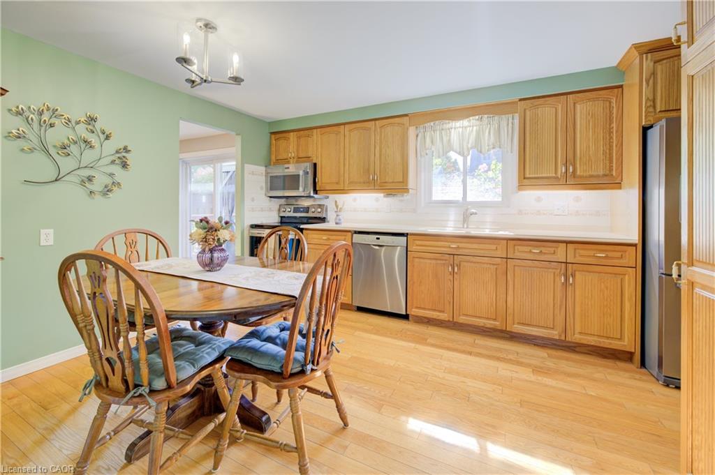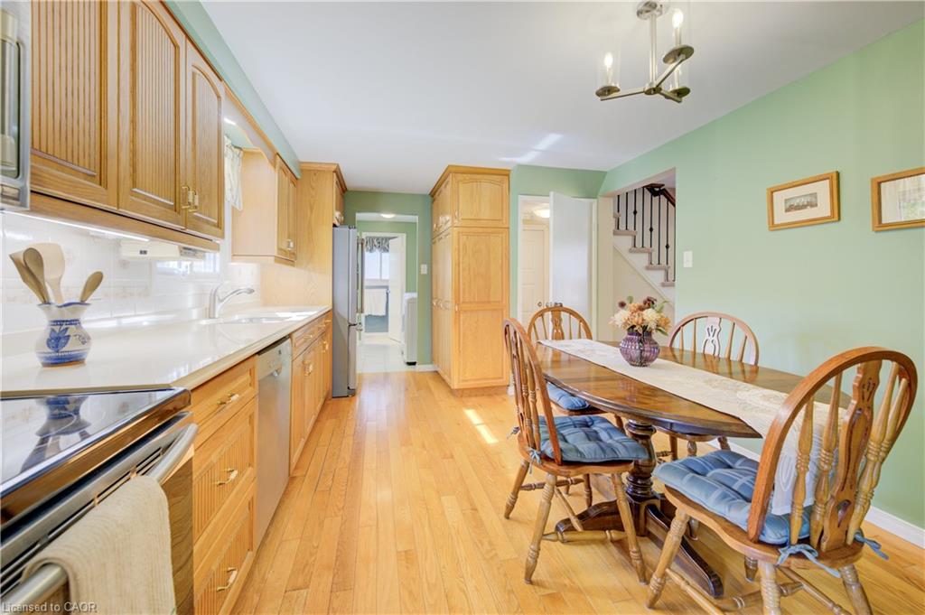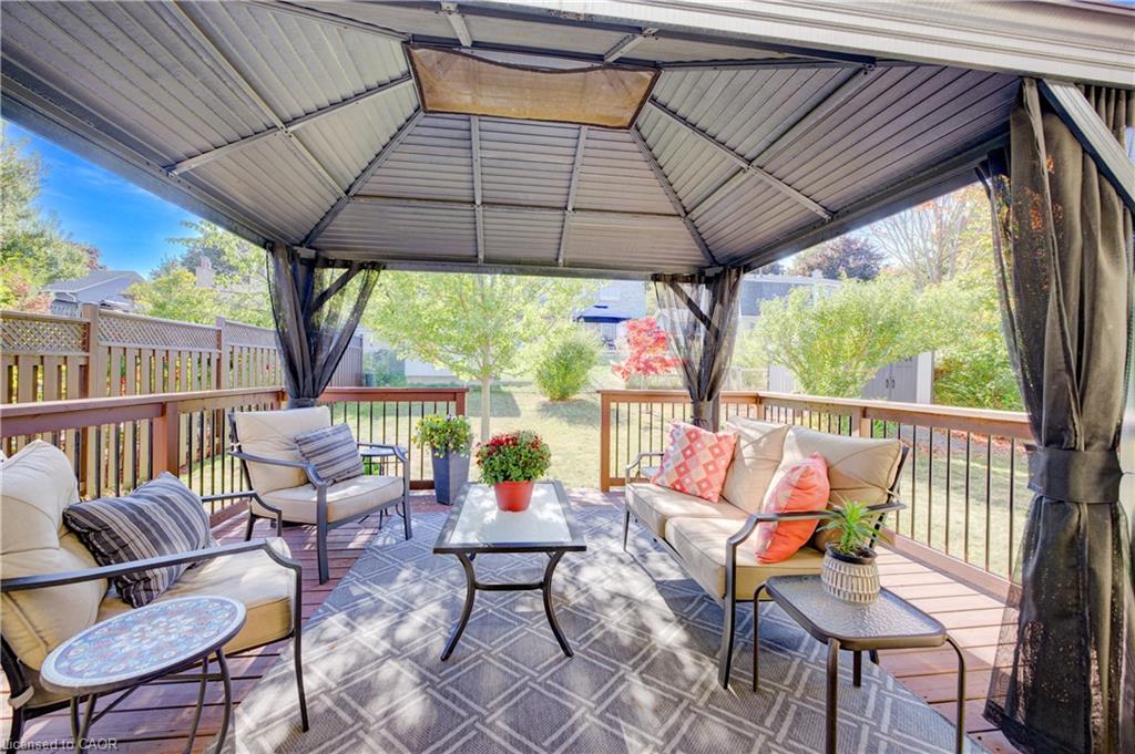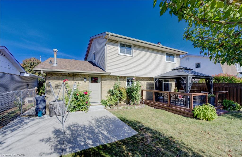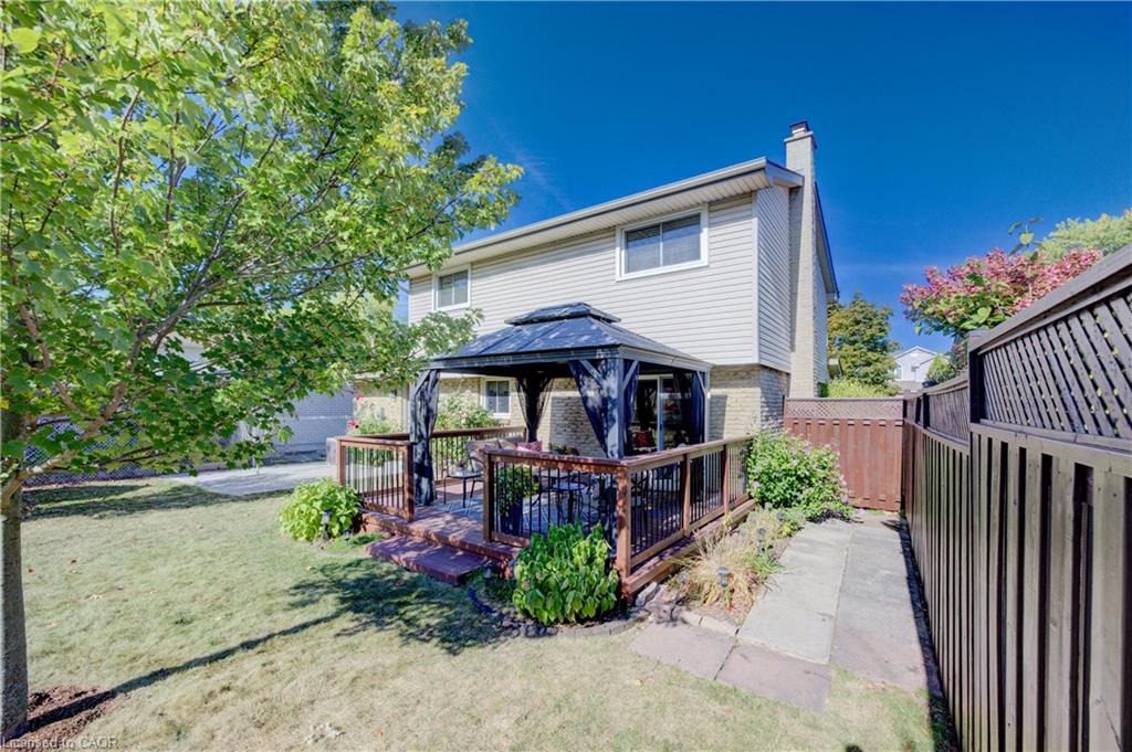 A TRUE FAMILY HOME, LOVINGLY MAINTAINED JUST STEPS FROM CHICOPEE SKI-HILL. Welcome to this move-in ready 4-bedroom, 3-bathroom home located in one of Kitchener’s most desirable, family-friendly neighborhoods. Offering convenient access to Highway 401, public transit, Costco, Fairview Park Mall, Chicopee Tube Park, scenic trails, schools, and more, this home combines lifestyle and location. Step inside to a stunning foyer with updated oak flooring throughout the main level and metal railing and new carpeting on the stairs. The spacious family room seamlessly connects to the eat-in kitchen, featuring quartz countertops, ample cabinetry, and stainless steel appliances. A main-level laundry room with closet space and a powder room adds everyday convenience. Upstairs, you’ll find four spacious bedrooms, each with large closets, and a 4-piece bathroom. The fully finished basement includes a recreation room with a cozy gas fireplace, a newly upgraded 3-piece bathroom, and plenty of storage. Enjoy your private backyard oasis complete with a deck and gazebo—perfect for relaxing or entertaining. Parking for three vehicles, including one in the garage, completes this wonderful family home.