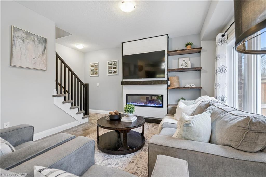 The kitchen features quartz countertops, stainless steel appliances, modern backsplash, ample cabinetry and a spacious island ideal for meal prep and casual dining. The adjoining living room offers a stylish feature wall, sleek electric fireplace and custom live-edge built-in shelves, creating a warm and contemporary gathering space.