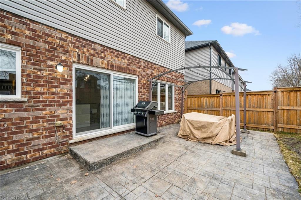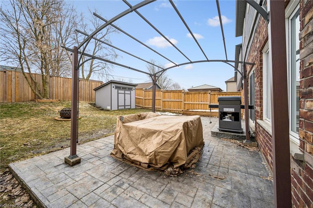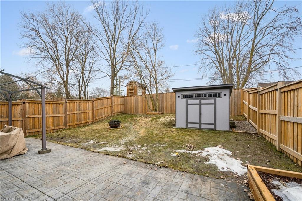 Large windows and an oversized patio door lead to the private, fenced backyard featuring a gorgeous stamped concrete patio, perfect for outdoor dining or relaxing on summer evenings, and a newer shed.