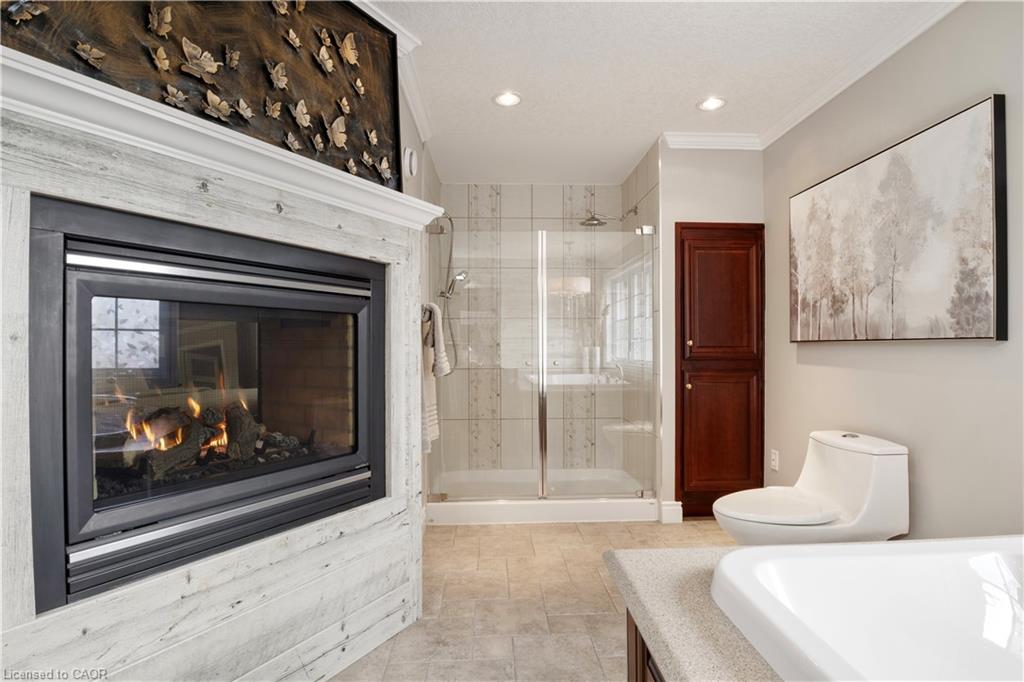 The main level offers a chef’s kitchen with oversized island, generous dining area, walk-in pantry, and formal dining room. A library or office with coffered ceilings adds flexibility, while the private primary suite features a double-sided gas fireplace shared with the spa-like ensuite. Additional bedrooms are tucked into their own wing for privacy.