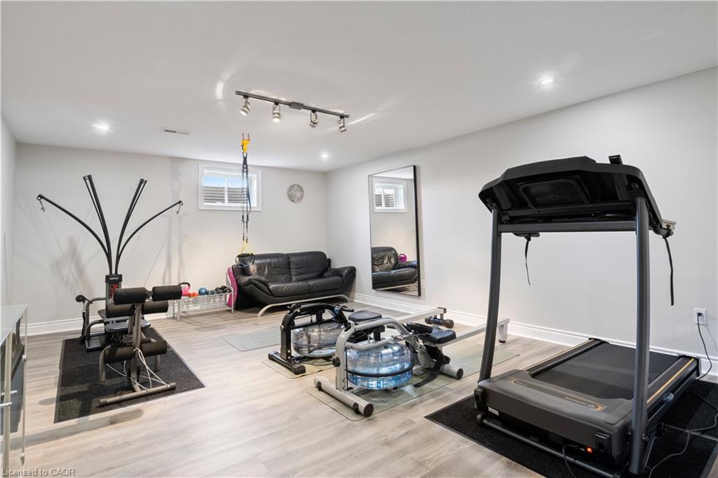The fully finished lower level includes two bedroom suites, a large entertainment area, glass-enclosed home gym, and ample storage. A finished loft with balcony, accessible via interior stairs and an exterior walk-up, adds versatility.