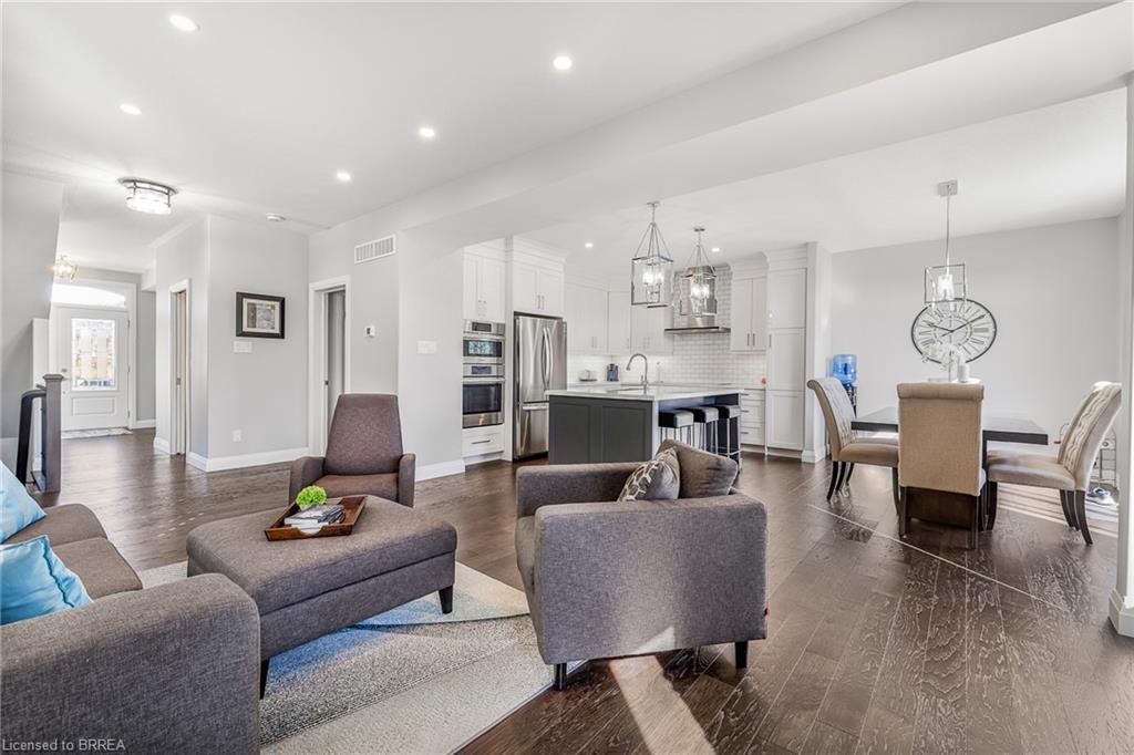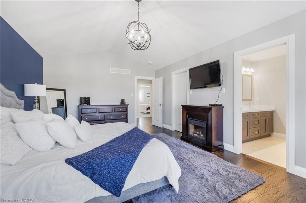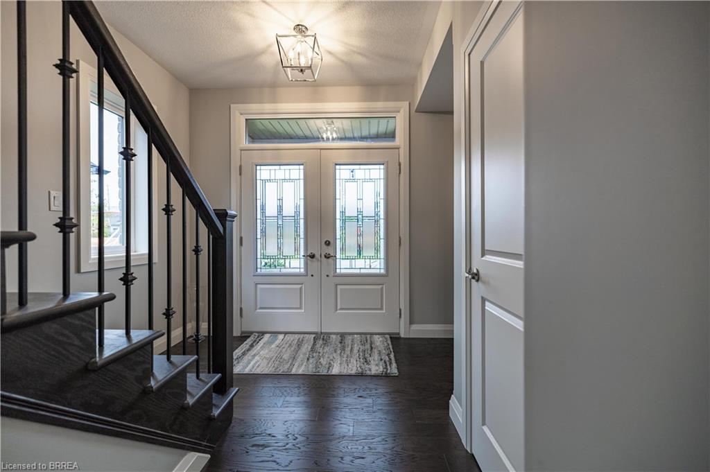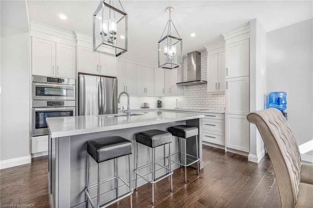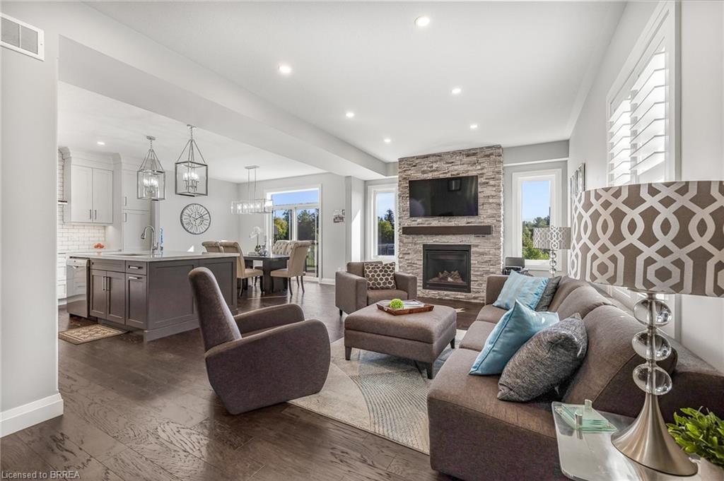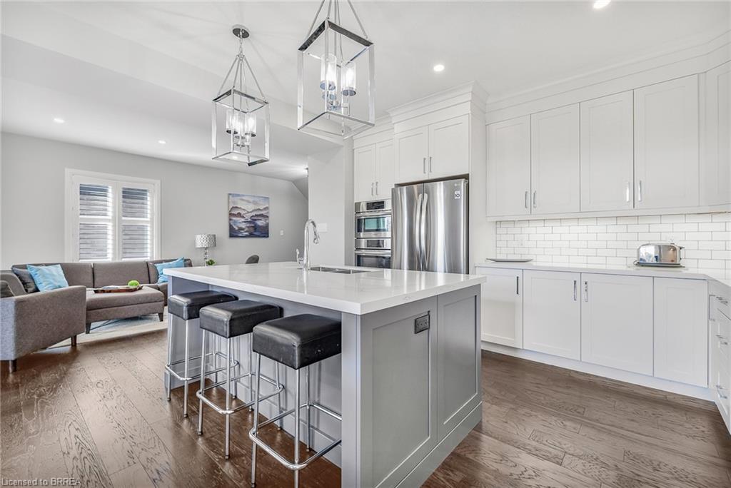 This exquisite custom-built 2-storey home backs onto a vibrant walking trail and park in the charming town of Paris, Ontario! Immerse yourself in a sophisticated neighbourhood designed for upscale family living. This meticulously crafted home seamlessly blends contemporary design with opulent comfort. From the moment you enter, you’ll notice the thoughtful details—gleaming hardwood floors, soaring 9-foot ceilings, elegant pot lights, and upgraded light fixtures that enhance the home’s bright and inviting atmosphere. The open-concept main floor creates a seamless flow between the kitchen, dining area, and living room, making it the ideal space for both everyday living and memorable entertaining. The chef-inspired kitchen is a true showstopper, boasting a large center island, sleek quartz countertops, premium stainless steel appliances including a BOSCH cooktop and built-in dual oven/microwave, a stylish tile backsplash, and under-mount lighting. The adjoining living room features a stunning stone-surround gas fireplace, while the dining area offers sliding doors that open to a raised deck complete with BBQ gas hook up, where you can enjoy tranquil sunrises, shaded afternoons, and family BBQs. The luxurious primary suite provides a private retreat with a generous walk-in closet and a spa-like ensuite complete with dual vanities and a glass shower with body jets. Downstairs, the unfinished walkout basement with a separate entrance is fully framed and includes a rough-in for a bathroom—presenting endless possibilities for an in-law suite, rental unit, or additional living space tailored to your needs. Perfectly situated just minutes from Hwy 403, the Brant Sports Complex, shopping, schools, and parks, this home offers both serenity and convenience. With meticulous craftsmanship, luxurious finishes, and an impeccable location, this property is a true sanctuary that combines elegance with everyday practicality. Don’t miss your chance to make this exceptional home yours!