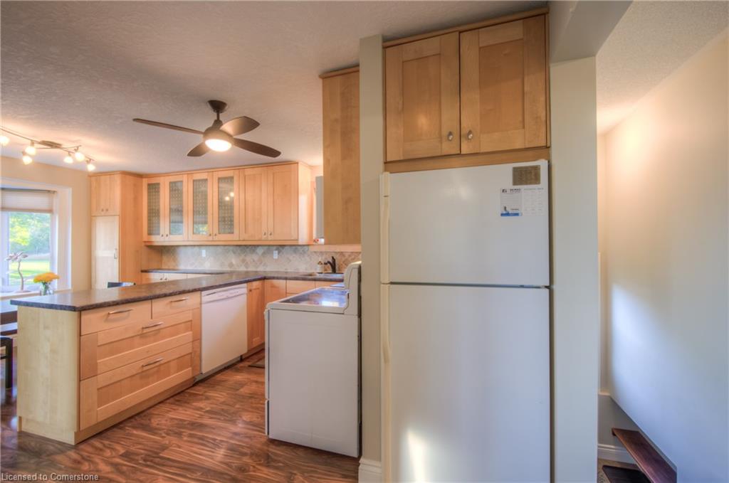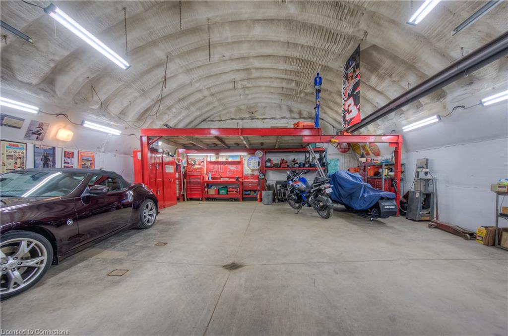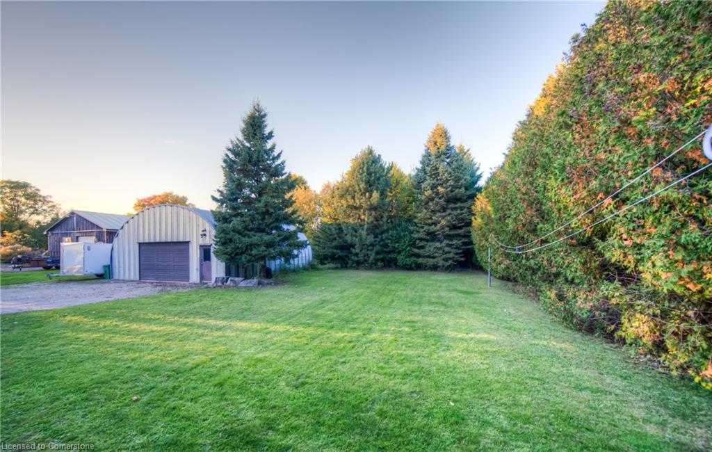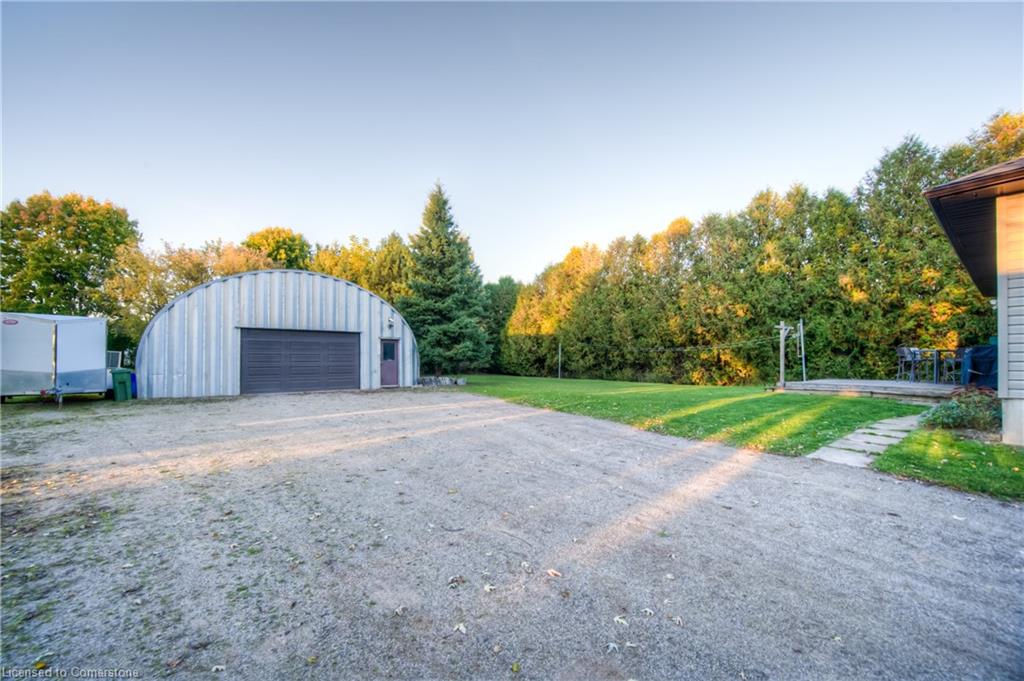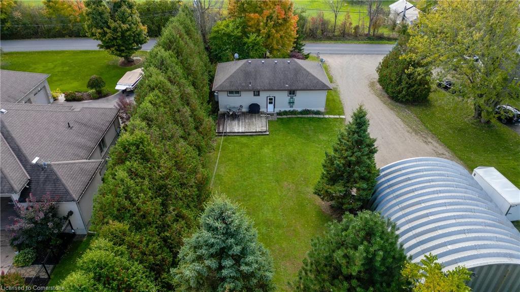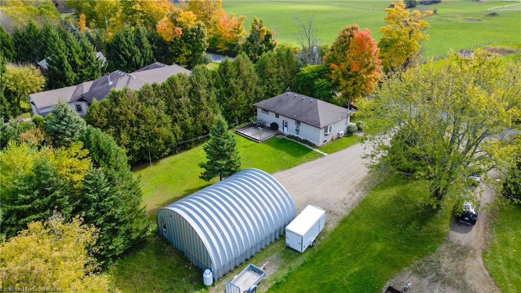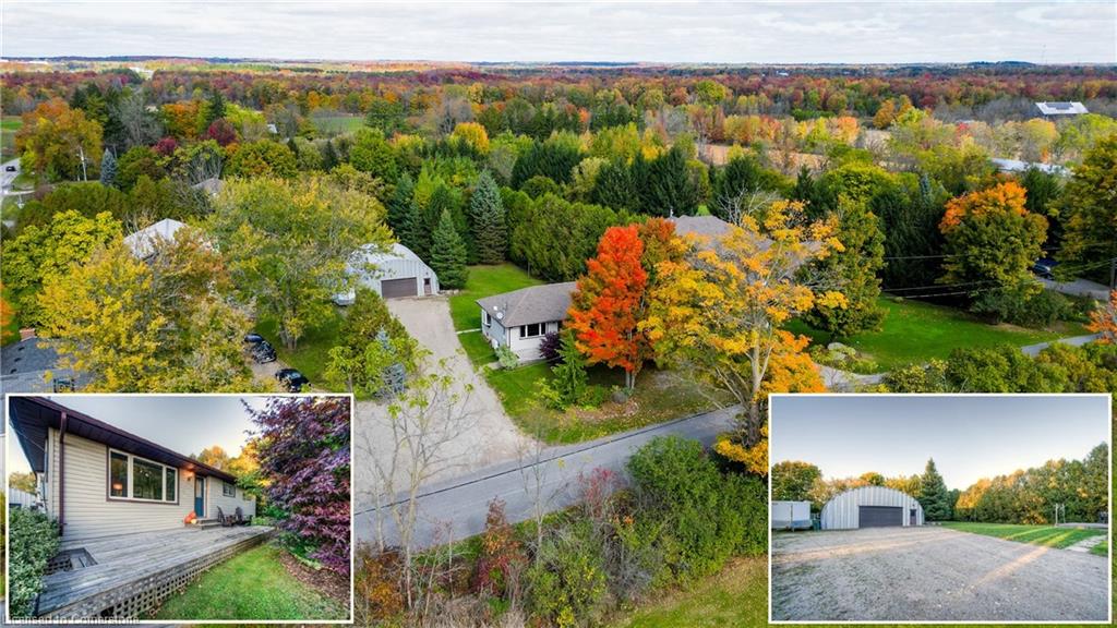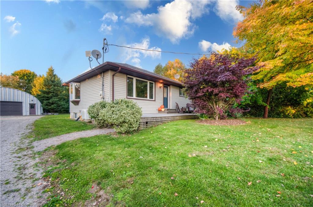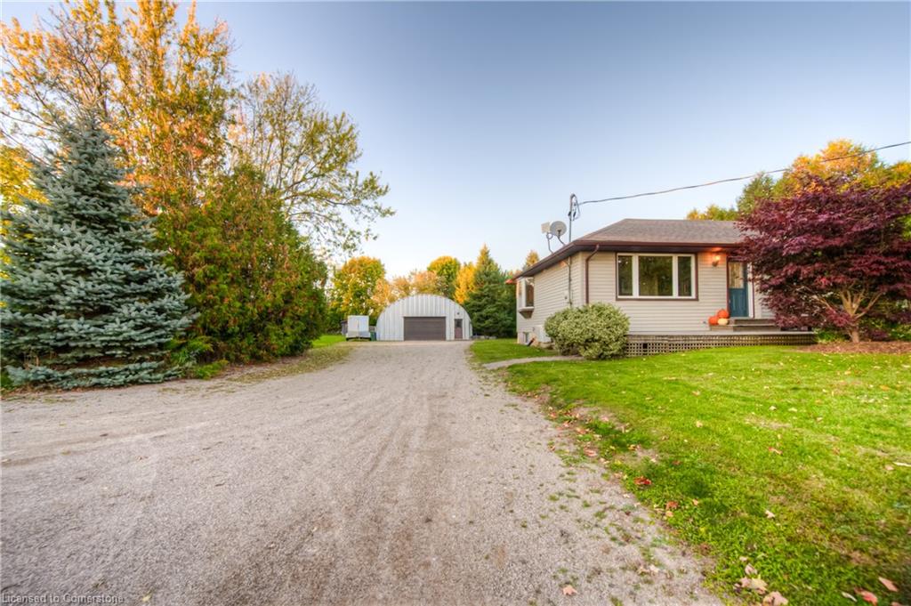 RURAL LIVING MEETS CONVENIENCE! If you’ve been dreaming of a peaceful, country lifestyle, look no further than 1855 Concession 8. Nestled on a picturesque .468-acre mature lot in the highly sought-after community of Flamborough, this property offers the perfect blend of tranquility and convenience. With its central location between Brantford, Hamilton, Burlington & Cambridge, and easy access to both Highway 8 and the 403, you’ll enjoy the best of rural living while remaining close to all essential amenities. A short stroll brings you to the charming hamlet of Kirkwall, adding a touch of small-town charm to your everyday life. This bungalow, featuring 1431 sqft of living space, invites you to step into a bright, open atmosphere including the partially finished basement with room to expand your living space or storage. The cozy yet spacious main floor living room flows seamlessly into the dining nook and a stylishly renovated kitchen, featuring ample cabinetry, a breakfast bar peninsula, and included appliances. The west wing of the home houses 2 bedrooms and a versatile multi-purpose room currently used as a walk-in closet– perhaps perfect for a future home office. The updated 4pc bathroom completed this level. A true standout of this property is the impressive 30’x36′ heated and insulated Quonset “Dream” shop/garage, equipped with a propane tube heater, concrete floors, electricity, an insulated roll-up door, a storage mezzanine with an electric boom crane– perfect for the handyman or entrepreneur. Notable extras include a propane furnace and a mini-split AC system (added in 2024), vinyl windows throughout, a reliable well with UV water purification, a septic system, and an oversized driveway that ensures ample parking for you and your guests. Homes like this – where rural charm meets modern functionality – are rare in this desirable location.