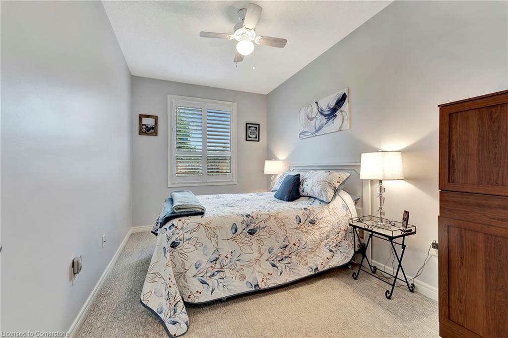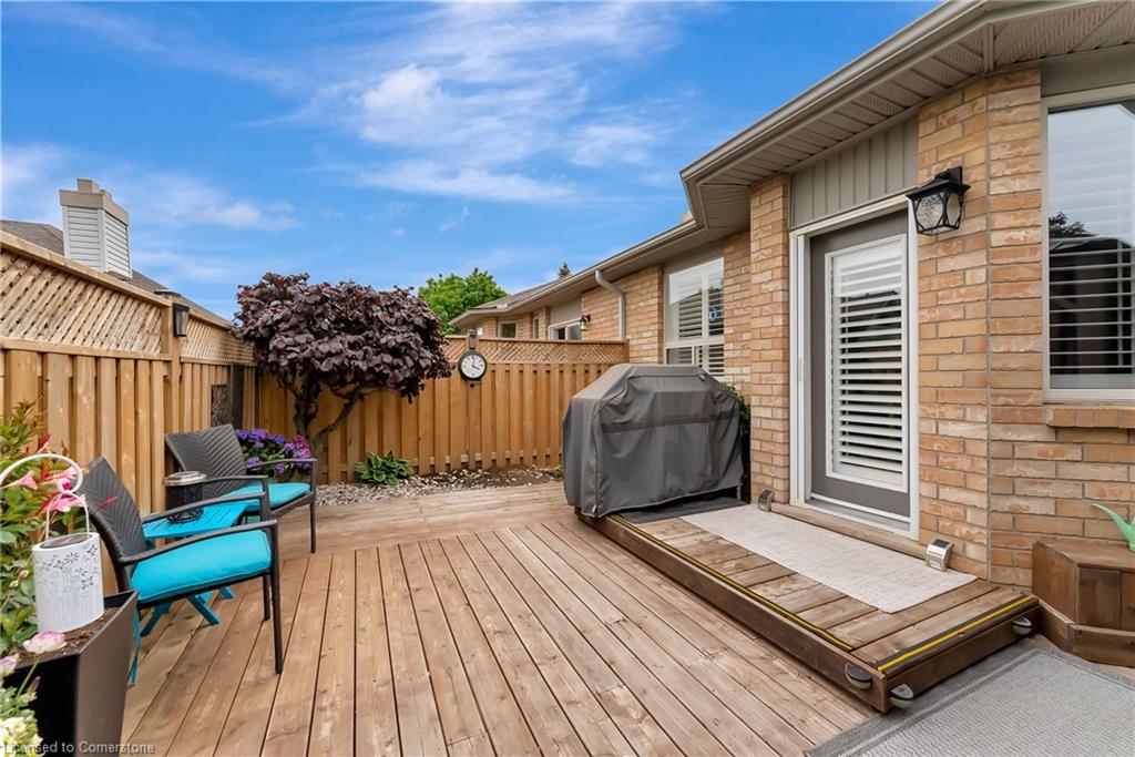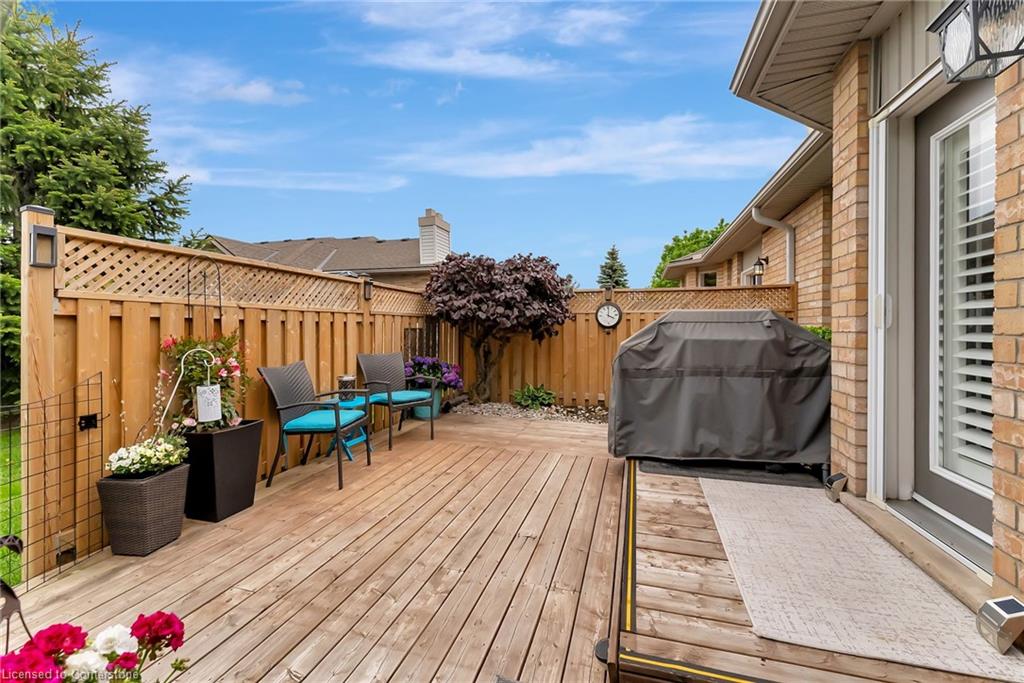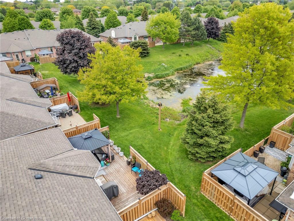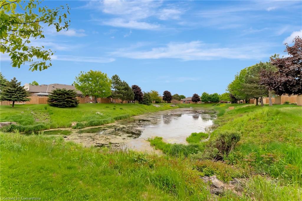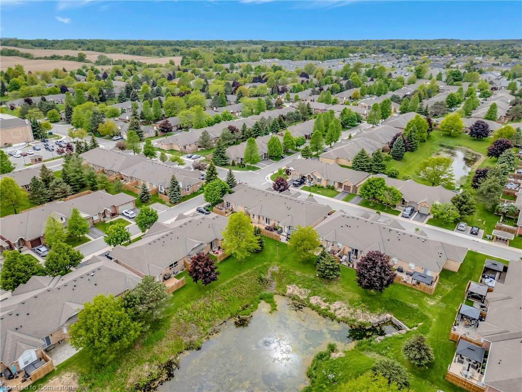 Discover refined living in this exceptional 2 bedroom, 3 bath end unit townhome nestled in the prestigious Twenty Place Adult Community. With over 2,500 sq/ft of meticulously finished living space, this residence occupies a coveted position overlooking a peaceful pond. The heart of this home showcases an open concept design with a coffered ceiling family room flowing into a formal dining area. The kitchen impresses with stainless steel appliances, including a gas stove, tumbled marble backsplash and a sunny breakfast nook. Enjoy main floor convenience with a generous primary suite featuring dual closets and a 3 pc ensuite with a large walk in shower, plus a laundry room with direct garage access. The bright main level features 9 ft ceilings, California shutters and hardwood floors. Downstairs, the fully finished lower level offers a recreation room with built in bar, a bathroom and versatile games/hobby space, perfect for entertaining or pursuing passions. Relax on your private deck where a charming gazebo offers the ideal vantage point to appreciate the tranquil pond views. Enjoy resort style living with access to community amenities such as a clubhouse featuring an indoor pool, sauna, tennis courts, a party room, exercise facilities and more. This home truly exemplifies the finest in adult community living.