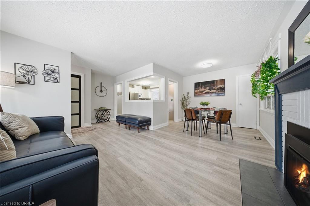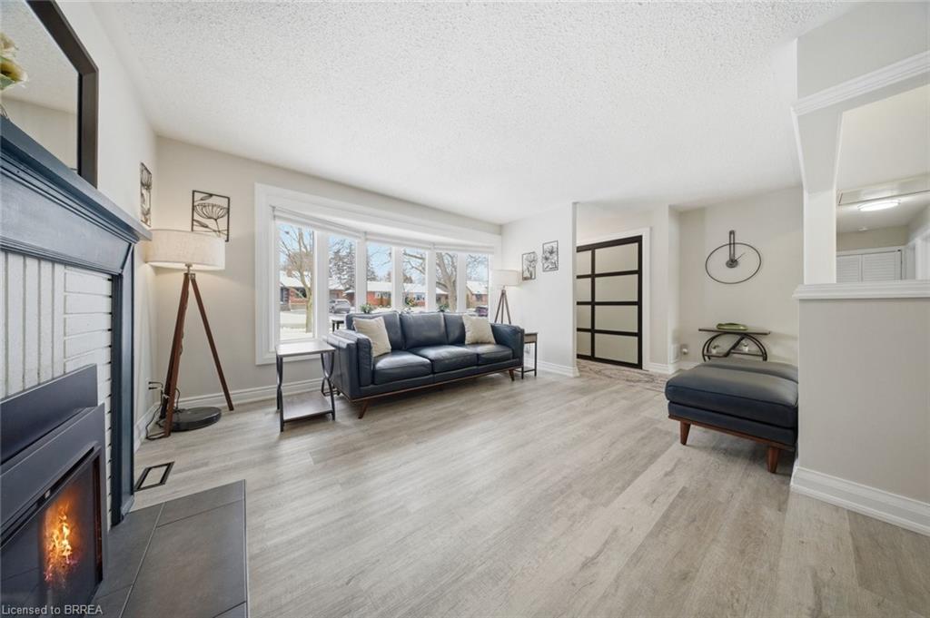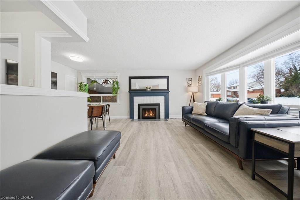 Step inside through the generous foyer, complete with a large coat closet offering plenty of storage. The open concept main floor is warm and inviting, featuring a spacious living room and dining room with a new bow window that fills the space with natural light, along with a Valor gas fireplace — perfect for cozy winter days, while the kitchen is both stylish and functional with white cabinetry, stainless steel appliances, a breakfast bar, and a large window overlooking the yard.