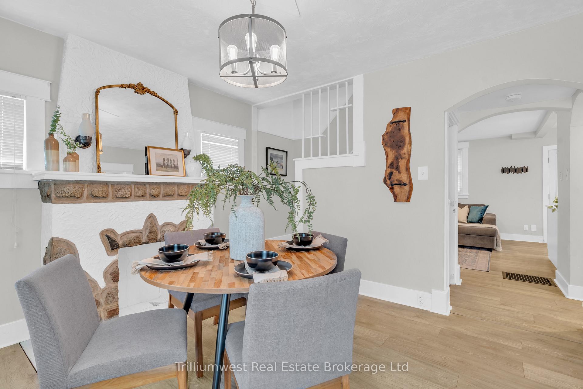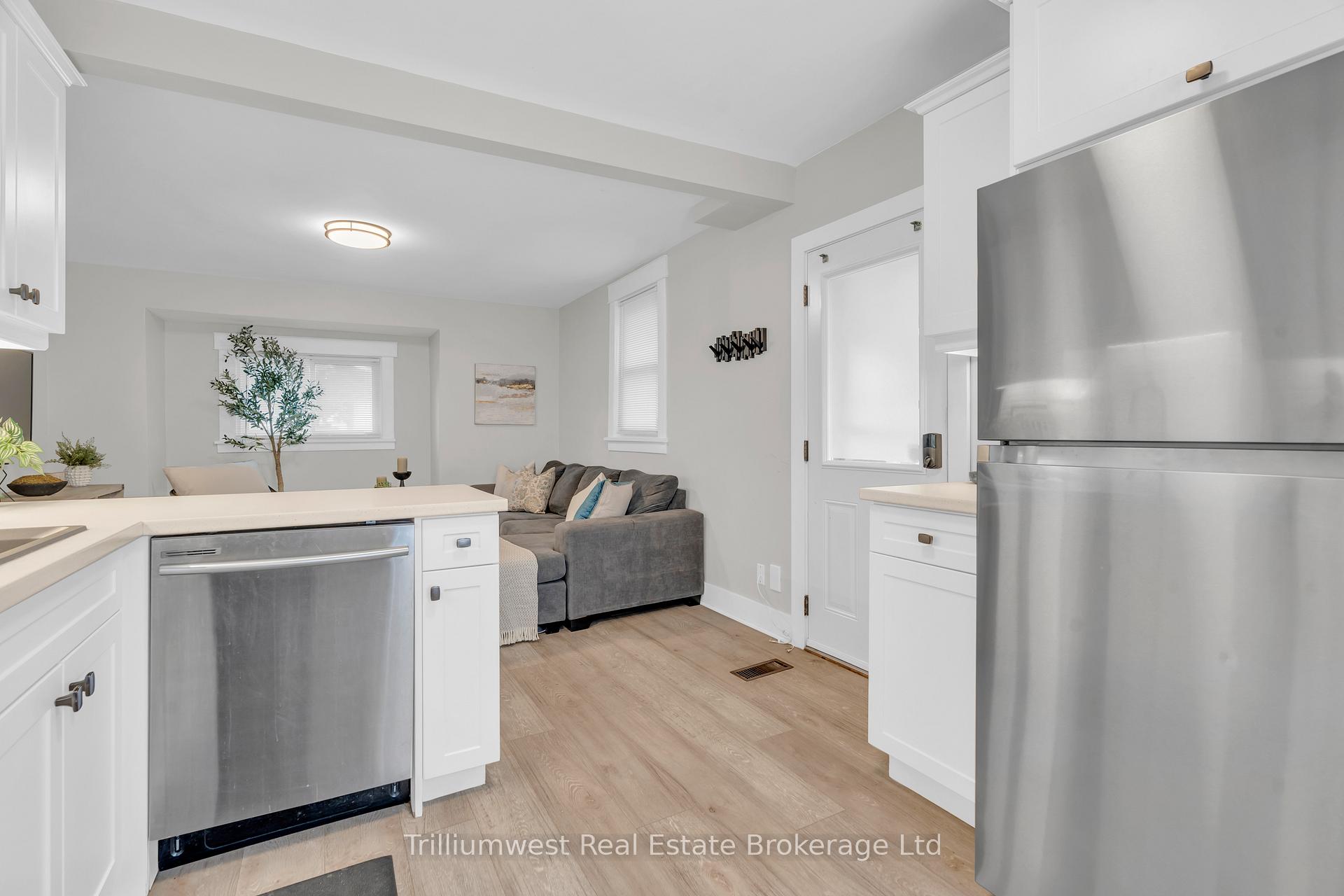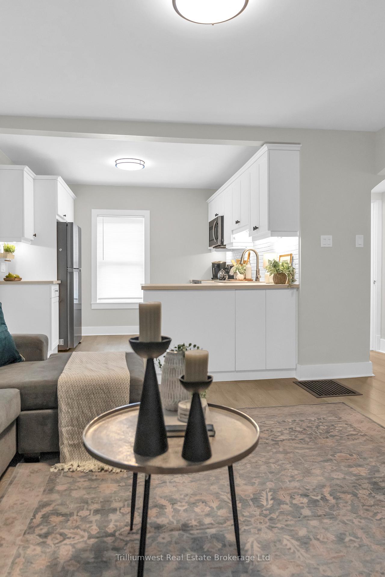 This beautifully updated cottage-style home in desirable East Galt seamlessly blends timeless character with contemporary finishes. The inviting exterior showcases modern stucco paired with expertly crafted stonework, setting the tone for what awaits inside. Step onto the spacious covered front porch and enter a home where every detail has been thoughtfully updated. The stunning fireplace in the front room echoes the homes exterior, featuring a unique stucco and stone façade with a vintage electric log insertadding both warmth and charm. This versatile space can serve as a formal dining area or a cozy sitting room. Elegant arched doorways and new laminate flooring lead to an open-concept living room and an updated kitchen complete with white cabinetry, stainless appliances, ample storage, under-cabinet lighting, a built-in fridge, beveled subway tile backsplash, and a Silgranit sink. Just off the kitchen, a new rear deck provides ideal space for outdoor dining and entertaining. The main floor also includes a spacious bedroom with a large window and a stunning modern farmhouse bathroom featuring a wood-accented ceiling, subway tile tub surround with dark grout, and a sleek vanity with an integrated sink. Upstairs, you’ll find two additional well-appointed bedrooms with stylish accent walls and ample storage. The basementwith a separate entranceoffers potential for an in-law suite, income property, or extended living space. Situated on a generous 132-foot deep lot, the property offers parking for 8+ vehicles, plus an oversized two-car garage/workshop with electricalperfect for hobbyists or trades. The new fully fenced backyard includes a custom rolling gate, a new deck with privacy screens, and plenty of room for entertaining or play. Additional upgrades include newer windows, furnace, electrical, and plumbing making this home truly move-in ready. Ideally located near parks, trails, schools, and major amenities, this is East Galt living at its finest