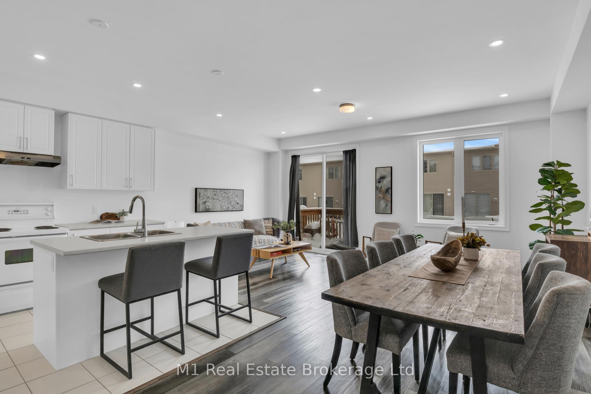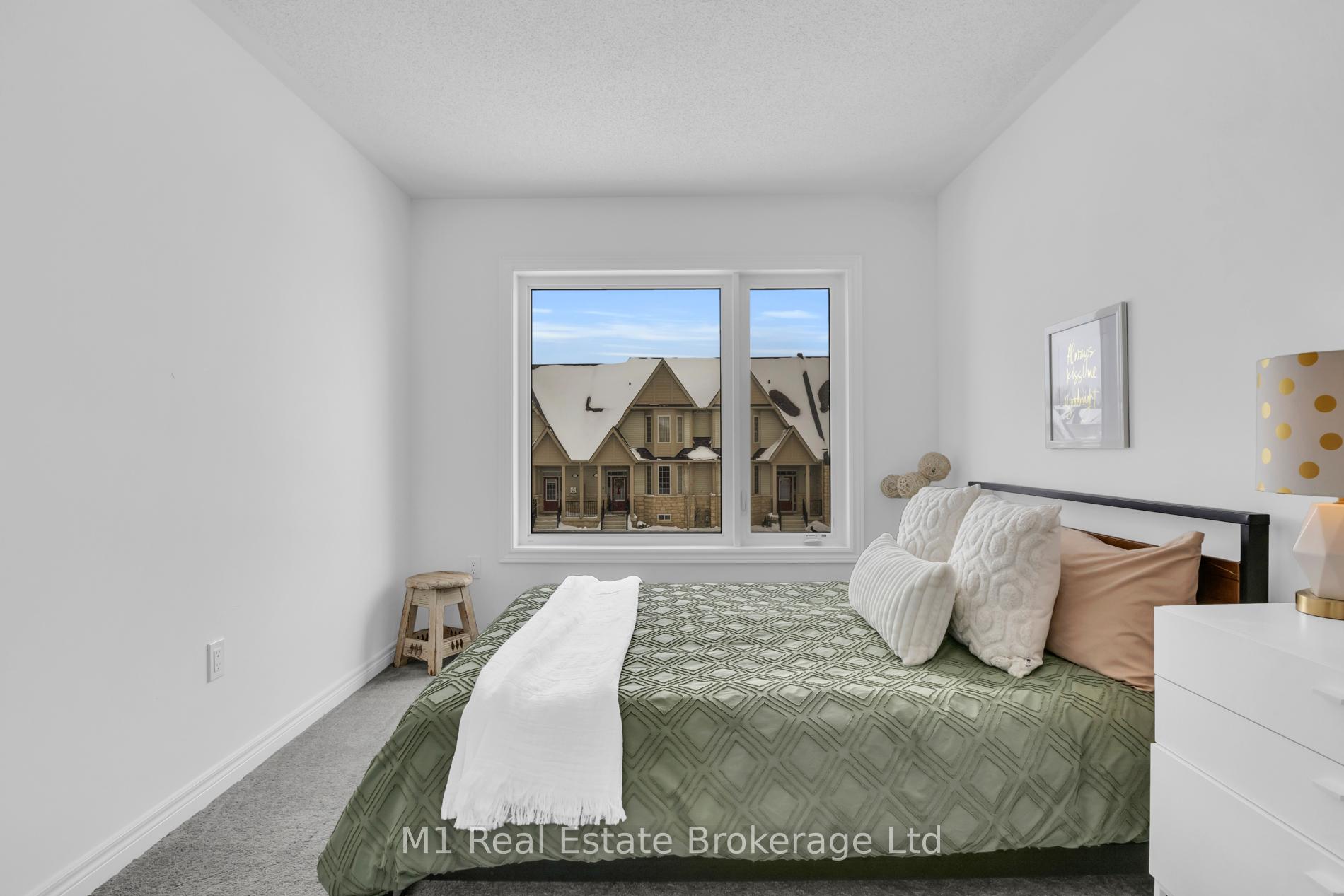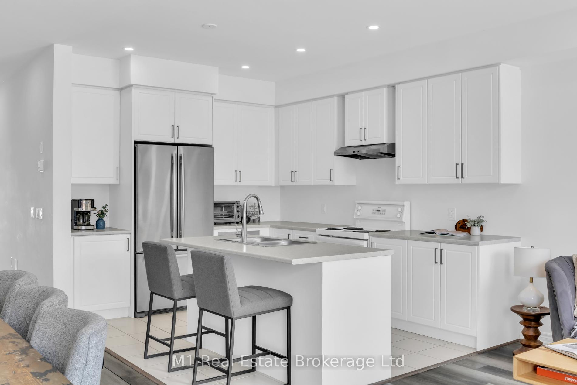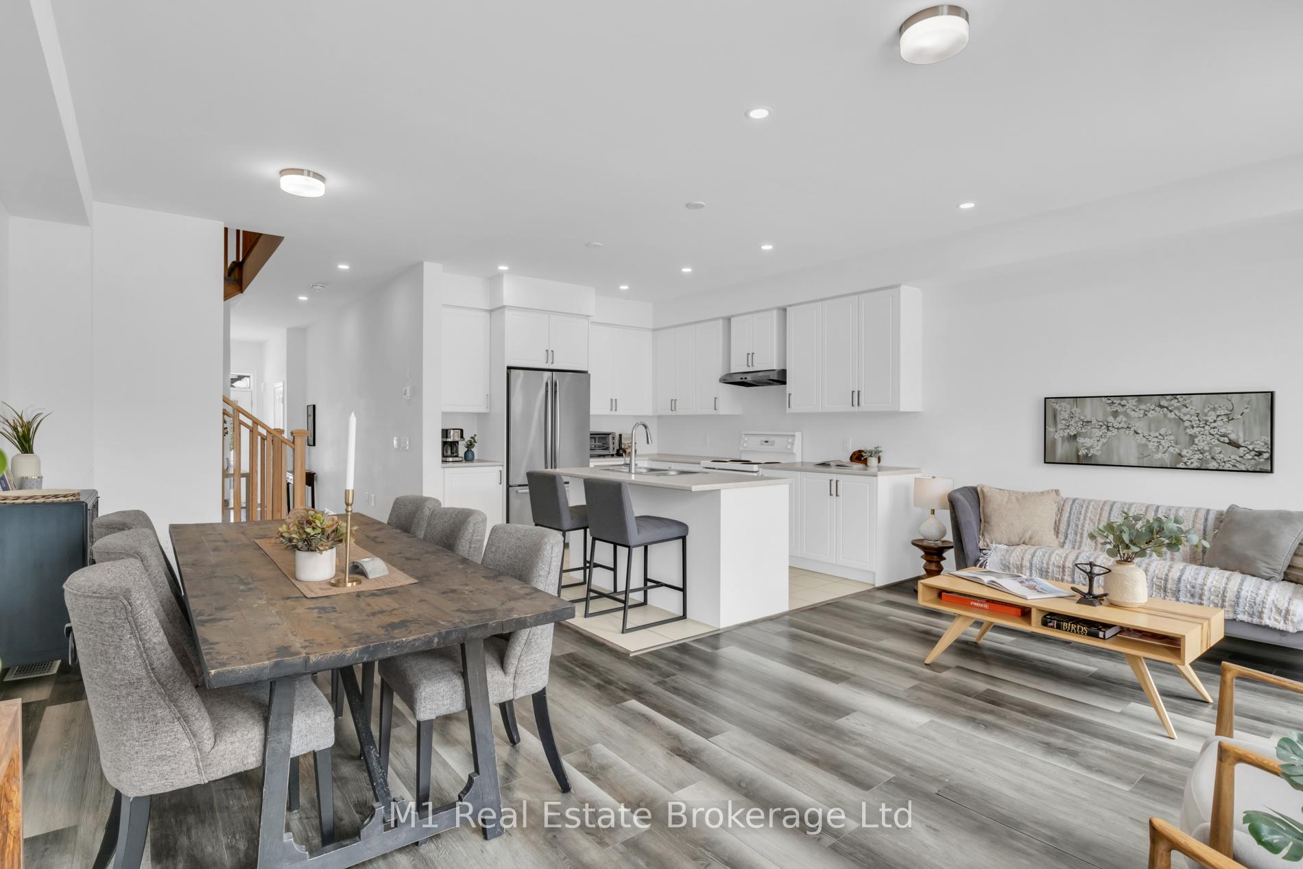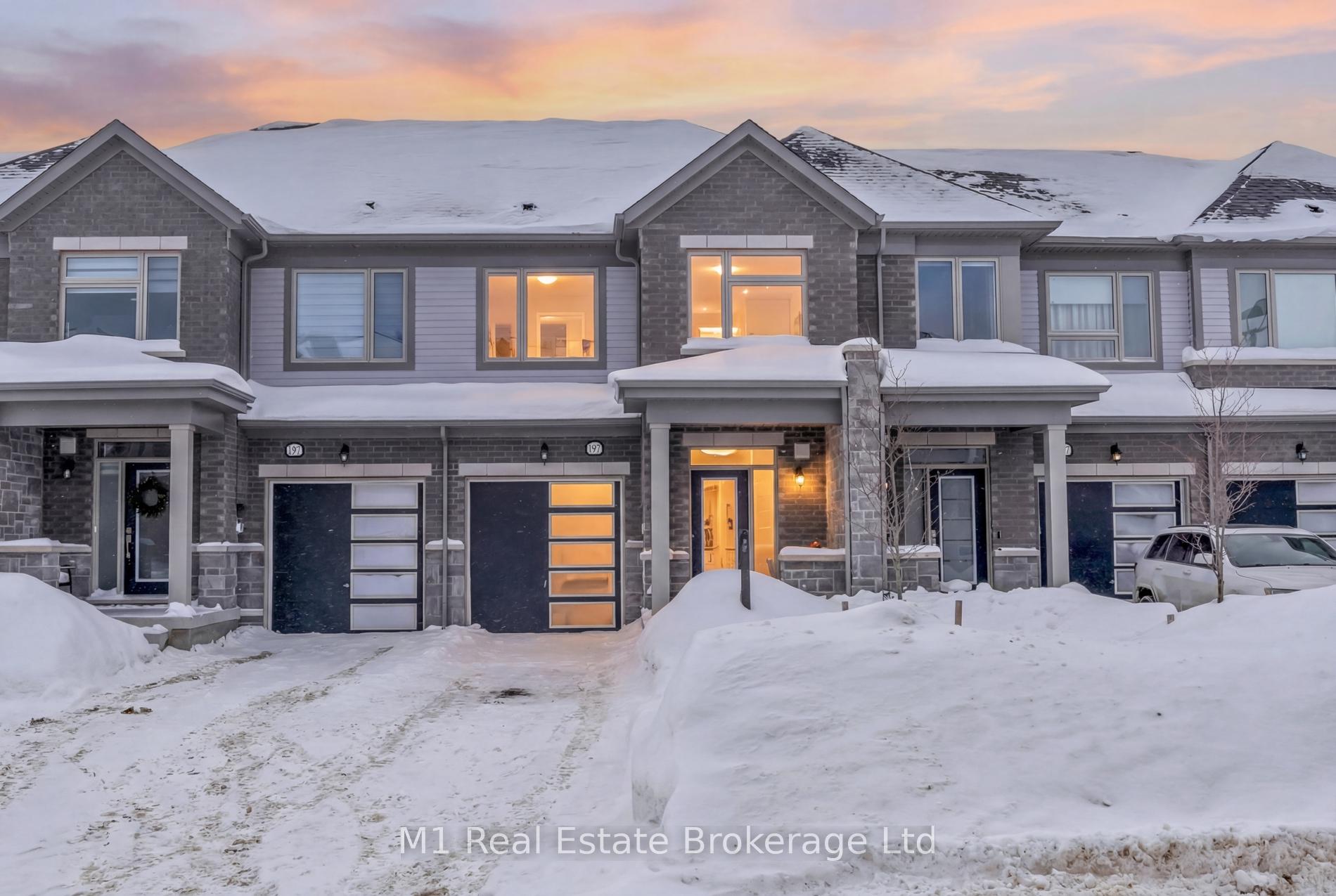 Welcome to 197 Farley Road, a well-designed freehold townhome located in the desirable Storybrook community of Fergus. This modern two-storey home offers approximately 1,742 sq. ft. of finished living space with three bedrooms and three bathrooms, providing a practical layout suited to everyday living. The main floor features a bright, open-concept design anchored by a contemporary kitchen with ample cabinetry, a large centre island, and quality finishes throughout, flowing seamlessly into the main living area. Upstairs, the primary bedroom includes a walk-in closet and a private four-piece ensuite, while two additional bedrooms share a full main bath. Upper-level laundry adds everyday convenience, and the unfinished basement offers excellent potential for future living space with existing rough-ins already in place. Exterior highlights include attractive brick and stone finishes, a covered front porch, and an attached garage with interior access. Ideally located close to schools, parks, trails, recreation facilities, and Groves Memorial Community Hospital, this home offers a low-maintenance lifestyle in one of Fergus’s established newer neighbourhoods.