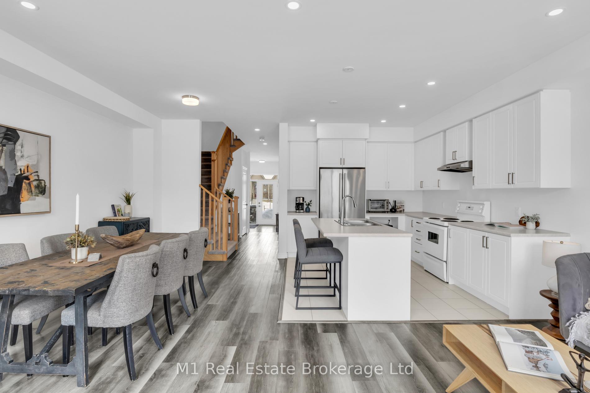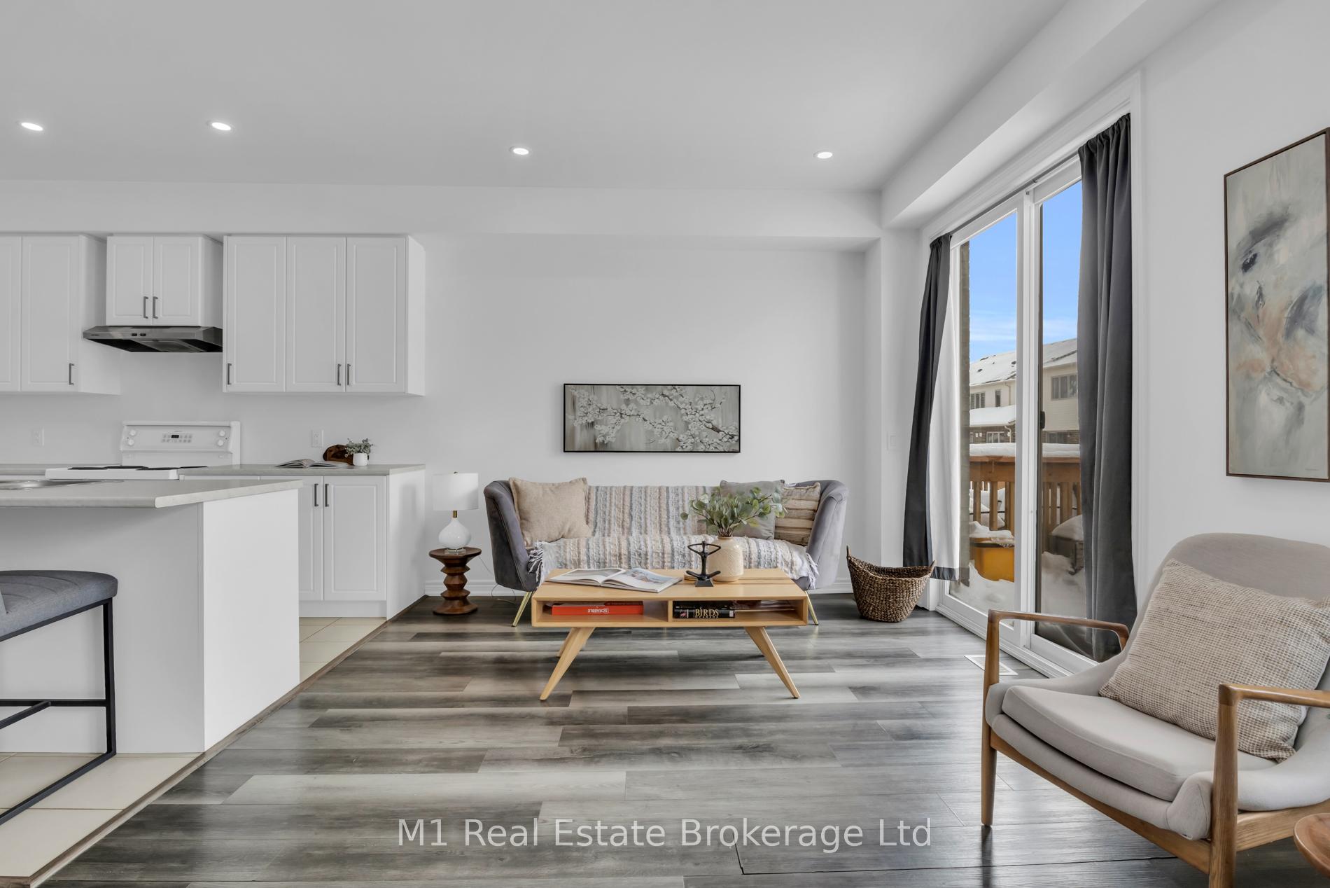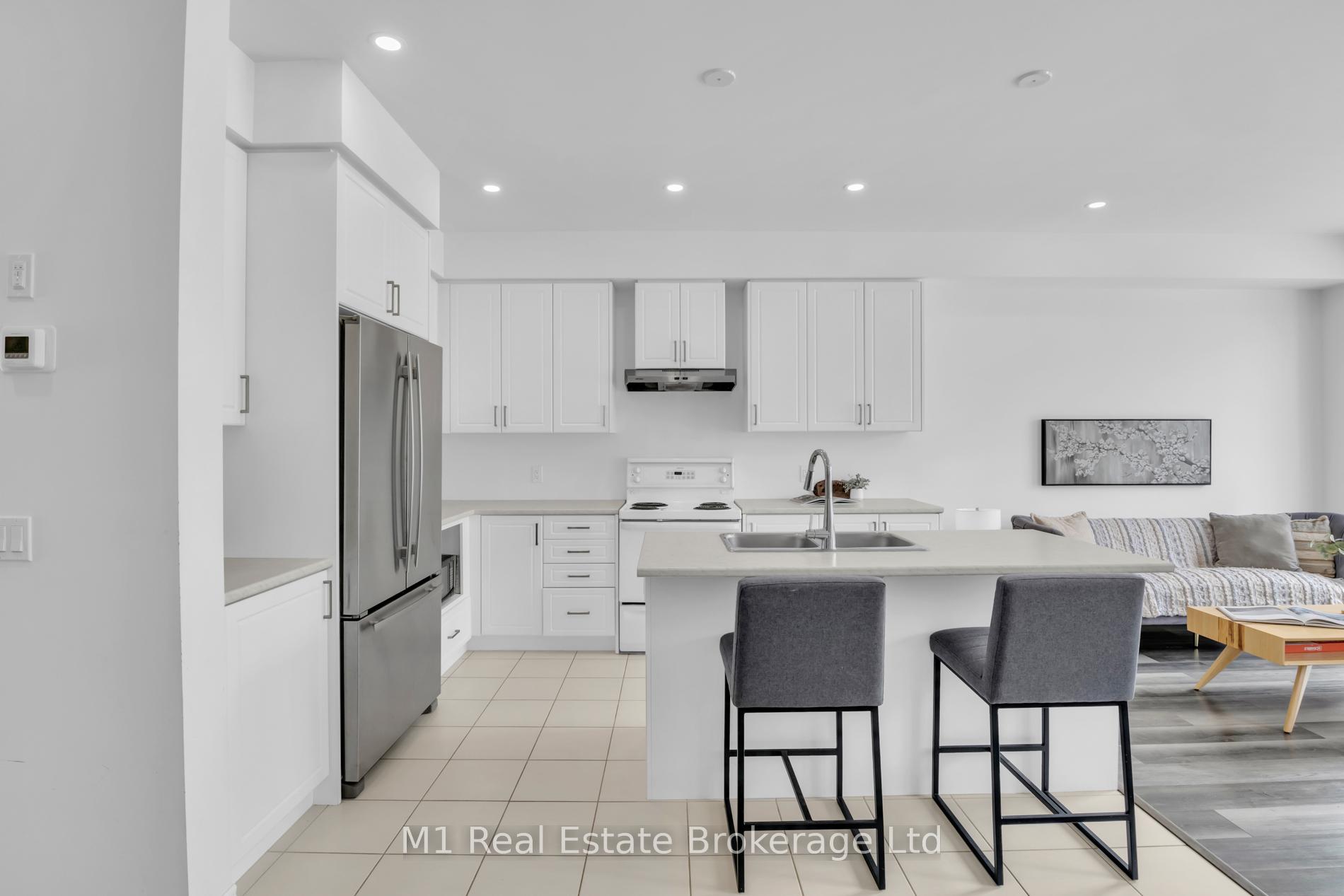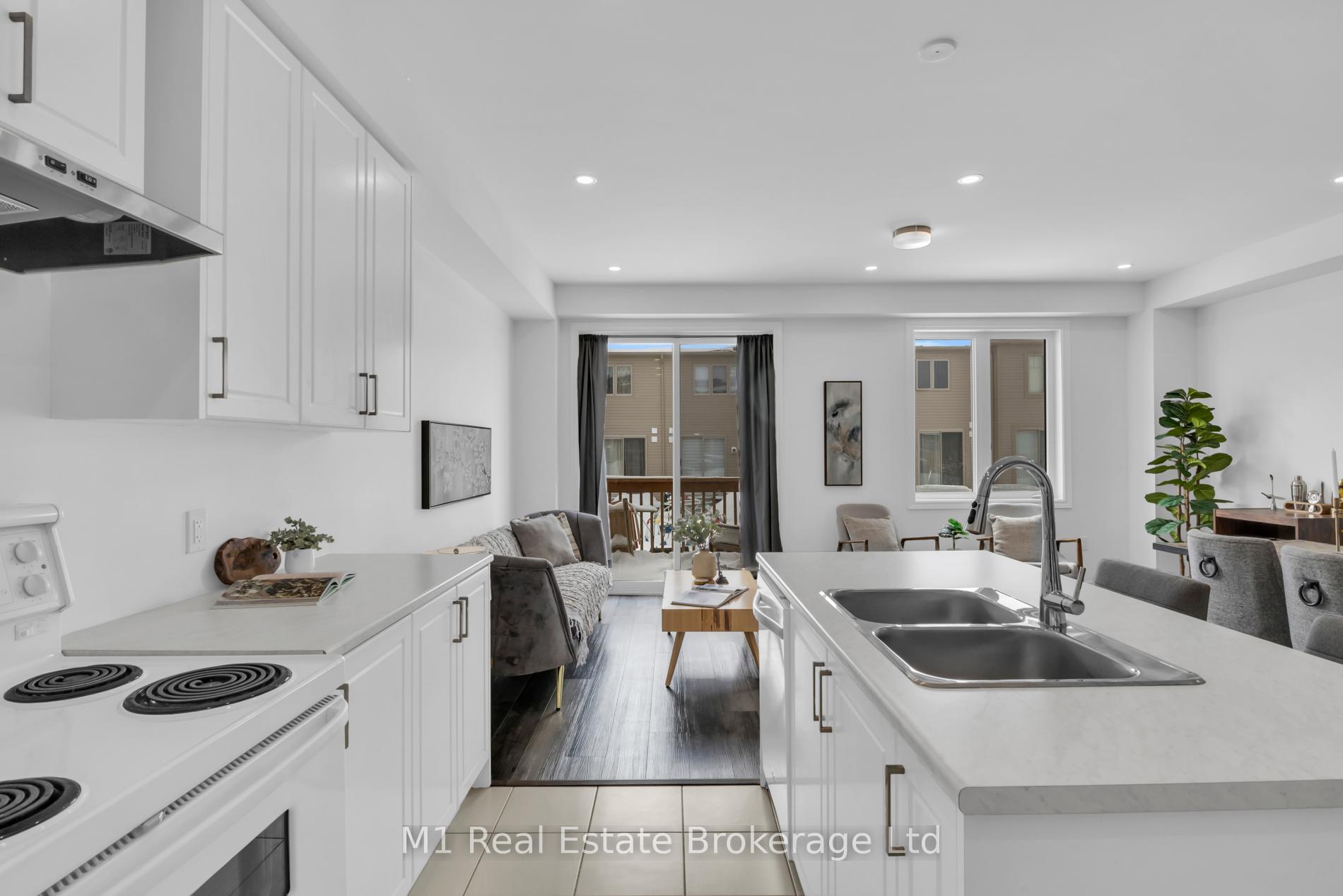 Welcome to 197 Farley Road, a well-designed freehold townhome located in the desirable Storybrook community of Fergus. This modern two-storey home offers approximately 1,742 sq. ft. of finished living space with three bedrooms and three bathrooms, providing a practical layout suited to everyday living. The main floor features a bright, open-concept design anchored by a contemporary kitchen with ample cabinetry, a large centre island, and quality finishes throughout, flowing seamlessly into the main living area. Upstairs, the primary bedroom includes a walk-in closet and a private four-piece ensuite, while two additional bedrooms share a full main bath. Upper-level laundry adds everyday convenience, and the unfinished basement offers excellent potential for future living space with existing rough-ins already in place. Exterior highlights include attractive brick and stone finishes, a covered front porch, and an attached garage with interior access. Ideally located close to schools, parks, trails, recreation facilities, and Groves Memorial Community Hospital, this home offers a low-maintenance lifestyle in one of Fergus’s established newer neighbourhoods.
