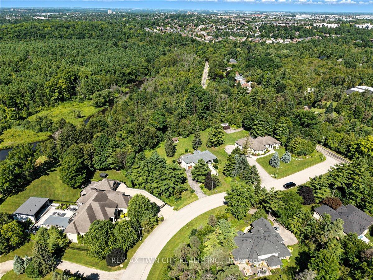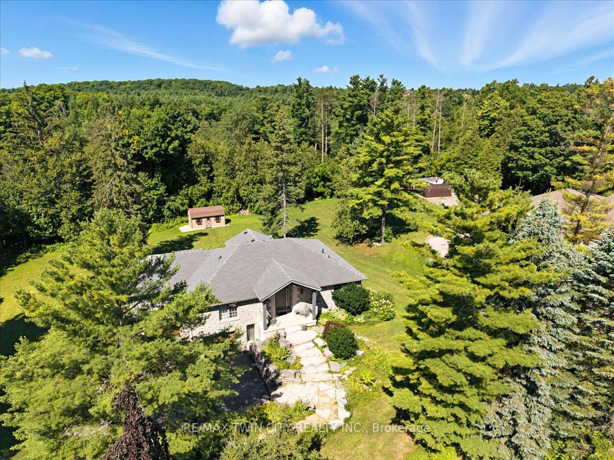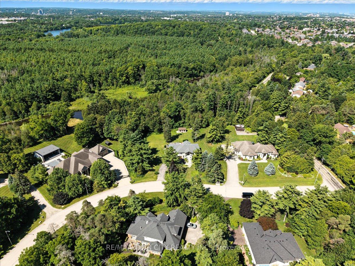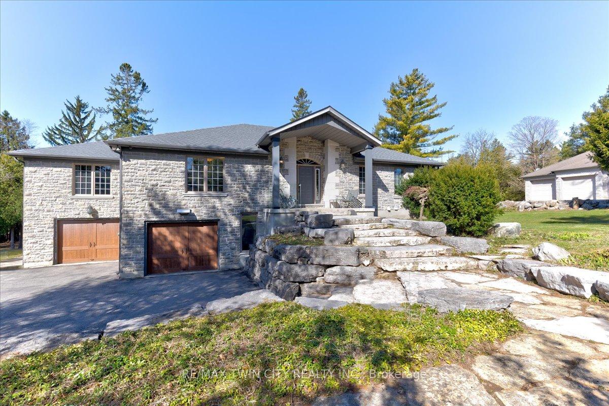 RARE OPPORTUNITY! Custom built raised bungalow on a 1.04-acre lot, offering court location surrounded by protected greenspace. This exclusive, 10 estate court rarely has homes come up for sale and 20 Grandy lane is one that takes full advantage of the natural features, completely backing onto mature forest with direct access to Millcreek conservation land. The home features a stunning all stone exterior with a beautiful retaining wall and carefully set natural stone steps, leading to the front door. The main level layout is wide open with large windows, designed to overlook the backyard from anywhere within the open space and providing access to the elevated multi-level deck completed with composite decking and glass rails. A rich, maple raised panel kitchen sits central with an oversized quartz countertop and raised bar sitting area; elegant crown molding finishes the cabinets to the ceiling with built-in stainless-steel appliances, gas cooktop. Equal in elegance is the built-in family room wall unit featuring gas fireplace insert. A three-sided fireplace separates the dining room from a sunken sitting area providing for an elevated view of the backyard; coffered ceiling accents and hardwood flooring span the space. Completing the space is a large bedroom, laundry, 2-piece bathroom, and the primary suite, complete with walk in closet and recently renovated(2023) 5-piece spa like ensuite. A hardwood staircase leads to the lower level which is still completely above grade; the home was strategically placed to take full advantage of the walkout. Lower level gives access to the oversized, staggered double car garage. Perfectly suited as a multi-generational home, offering three bedrooms, a recently renovated (2023) 4-piece bathroom, recreation room with gas fireplace, and kitchenette along with wet bar. Roof(2024), Additional oversized garden shed for equipment storage. Minutes from the 401, amenities, and schools. Dont miss this truly beautiful property!