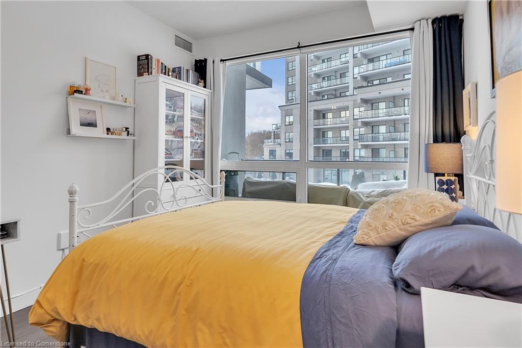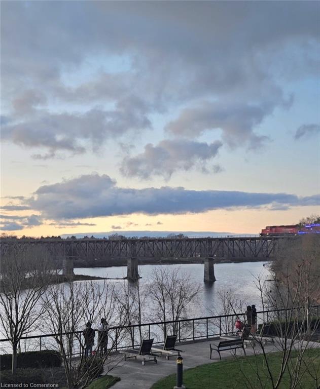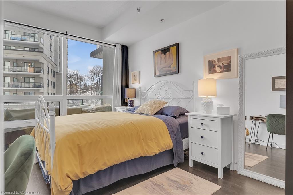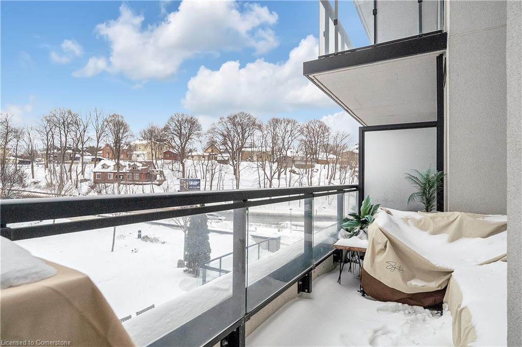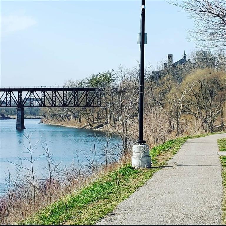 Inside, the bedroom is bright and inviting, with large windows that bring in plenty of natural light. The modern washroom is well-appointed with sleek fixtures and a contemporary design. The open-concept living and dining area seamlessly connect to the balcony, creating a bright and airy atmosphere, a view of Grand river and picturesque Downtown Galt . Granite countertop throughout in the kitchen and washroom; and convenience of in-suite laundry with stackable washer & dryer. Also included along side the suite are Underground parking, storage locker, gym, guest suite, outdoor terrace and party room. Walking distance to the Cambridge Mill. The second phase of the Light Rail Transit is coming, connecting Galt to KW.