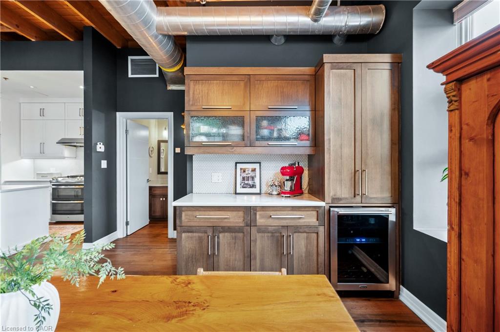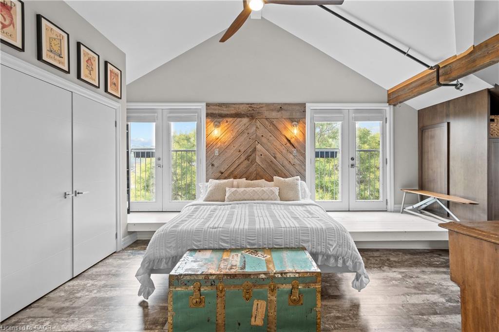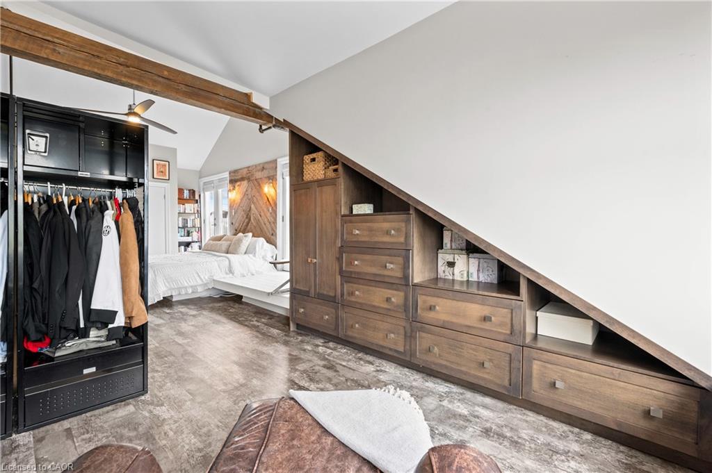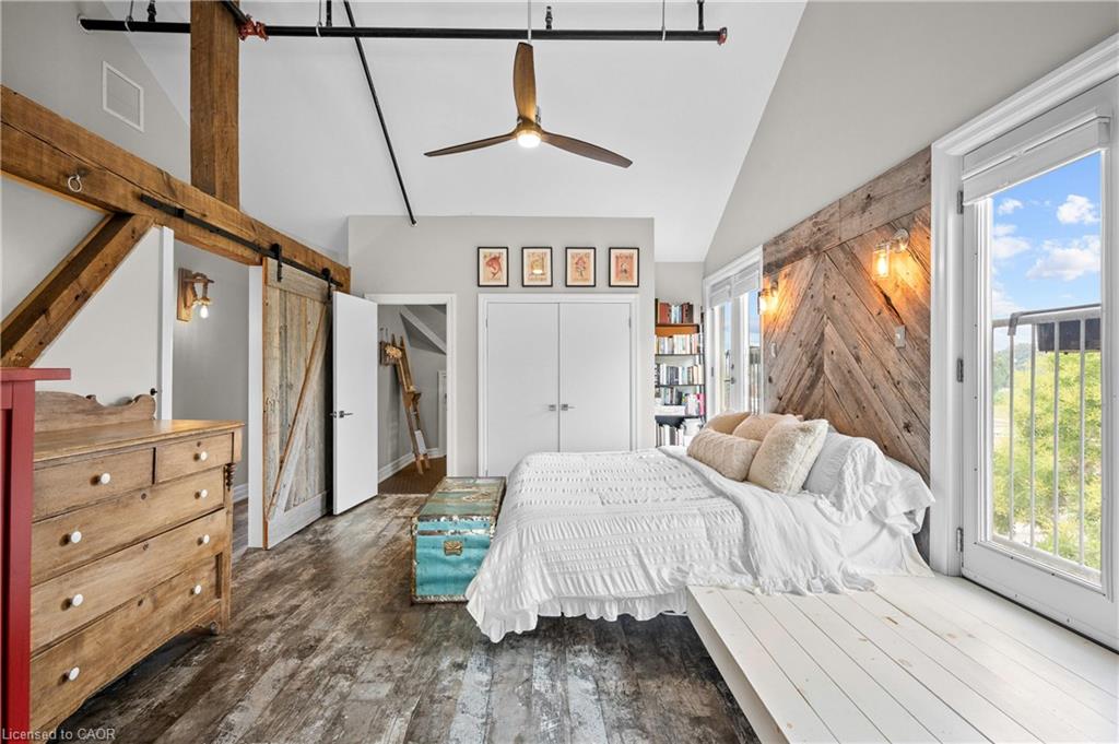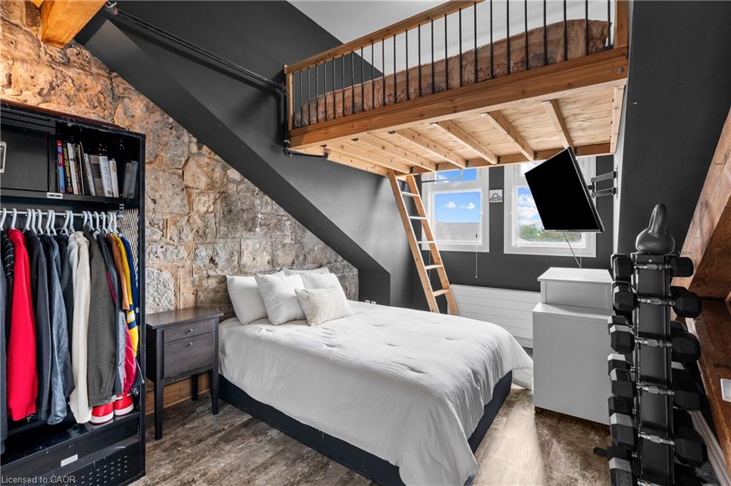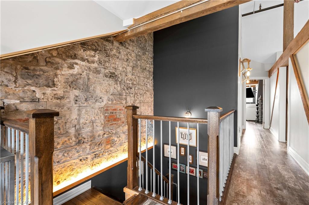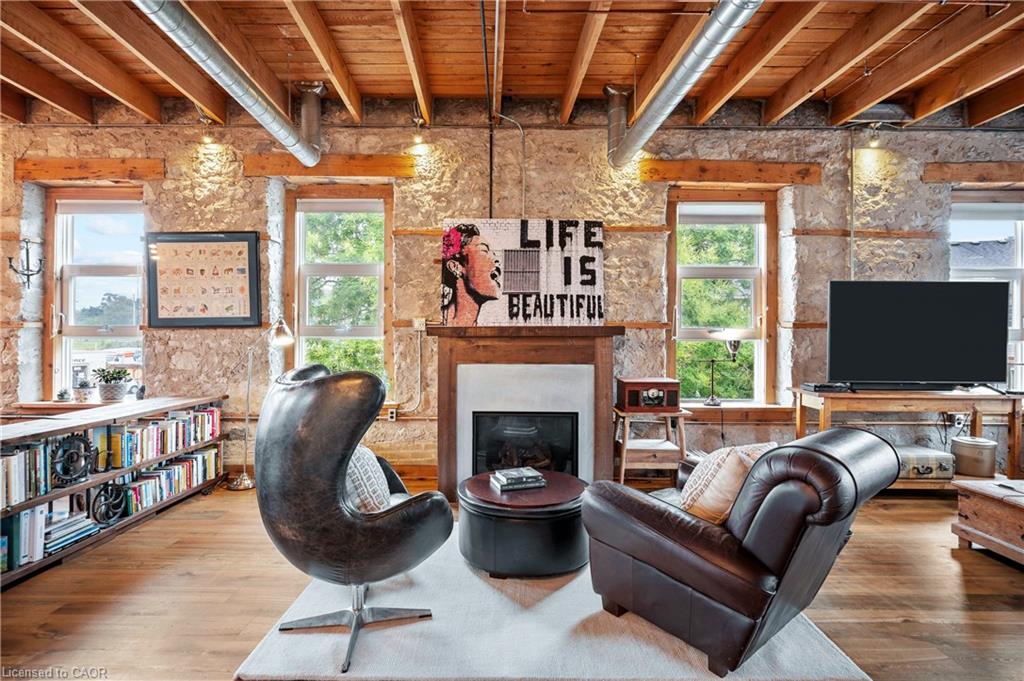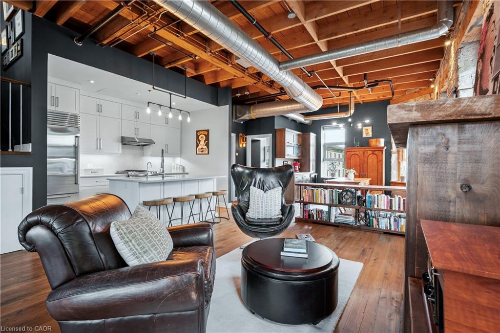Experience elevated urban living in one of the largest two-storey lofts in the Waterloo Region. This exceptional corner penthouse on the Grand River features soaring 12-foot ceilings and oversized windows that flood the home with natural light. Rich architectural details – including original wood beams and striking stone walls – create a sophisticated New York-style loft ambiance. The main level features warm wood flooring with in-floor heating and a beautifully upgraded kitchen showcasing quartz countertops, stainless steel appliances, a Sub-Zero fridge, tile backsplash with under-valance lighting and a generous breakfast bar with seating for four The dining area is designed for both style and function, featuring custom cabinetry, a pantry with quartz countertop, and a built-in wine fridge – perfect for entertaining. The inviting living room offers a cozy gas fireplace and dramatic open-concept views. Upstairs, the expansive two-room primary suite provides a private retreat with a sitting area, vaulted ceiling, and custom closet. The elegant 3-piece ensuite includes quartz counters and a large glass shower, while both upper-level bathrooms feature luxurious heated towel racks. A spacious second bedroom and versatile den – ideal for a home office – complete the upper level. Located just steps from the vibrant Gaslight District you’ll enjoy easy access to artisanal cafés, boutique shopping, exceptional dining, and live music events. Surrounded by scenic walking trails and breathtaking views of the Grand River this extraordinary penthouse offers the perfect blend of luxury, lifestyle, and location.