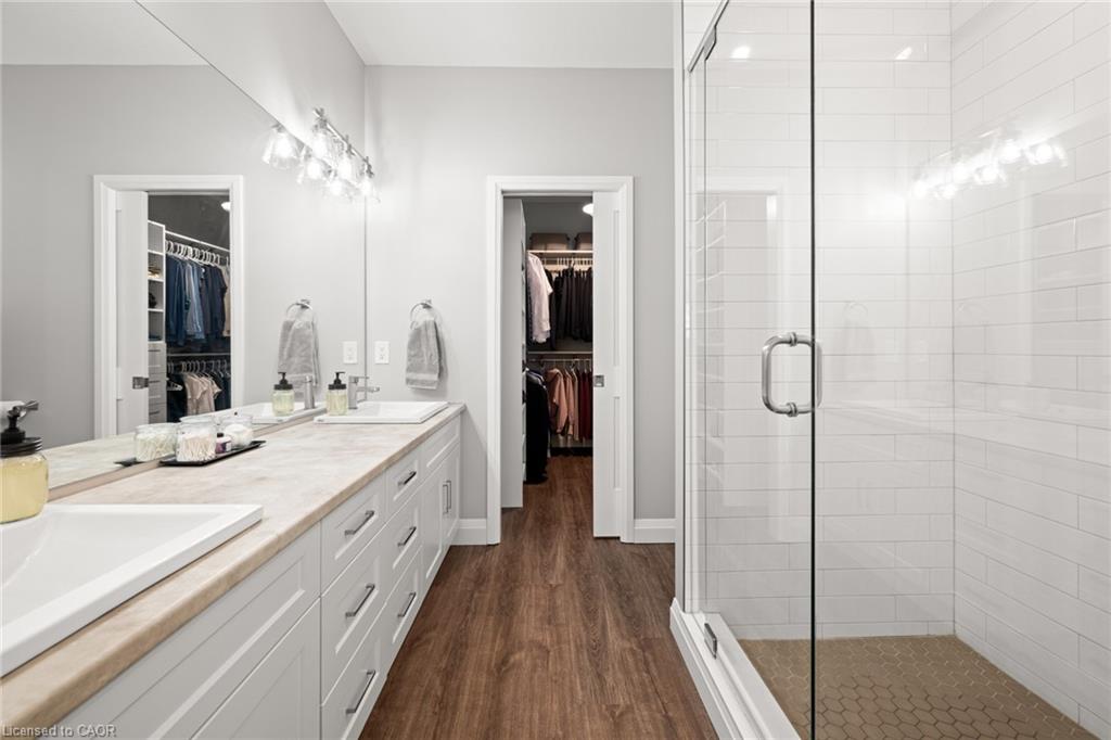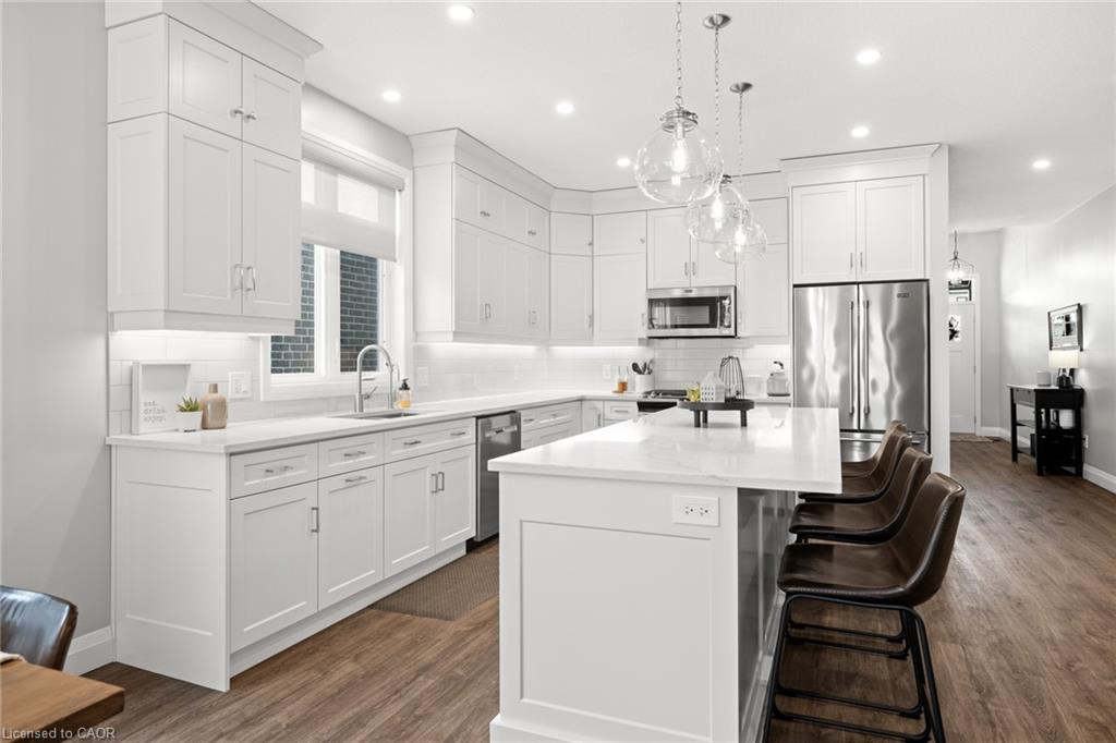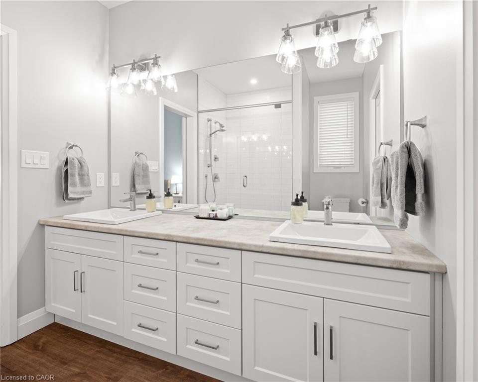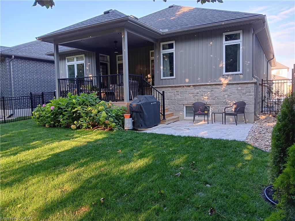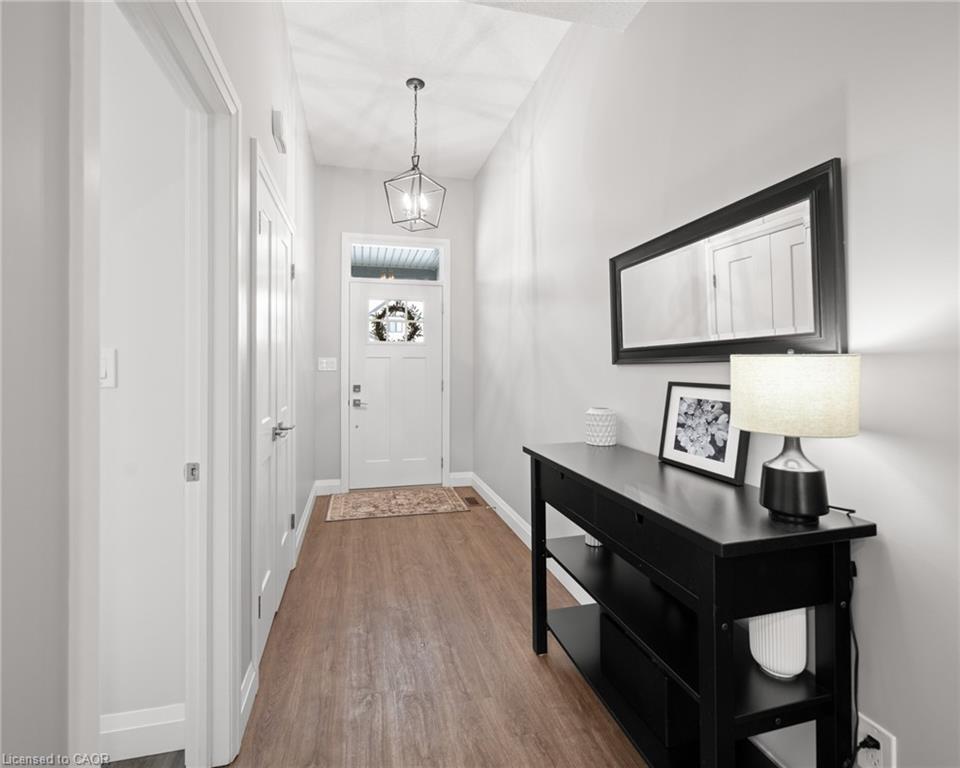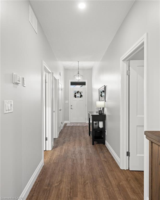 Welcome to this beautiful bungalow in Elmira’s sought-after Southwood Park community. From the moment you step into the spacious foyer, this 5-year-old home impresses with its quality finishes and thoughtful design. The open-concept main floor is perfect for both everyday living and entertaining. The kitchen is a standout, featuring a gas stove, generous prep space, and an oversized island that will delight any home chef. The living area offers a cozy gas fireplace and walkout to a covered deck—ideal for summer gatherings. The primary suite is a private retreat with a large walk-in closet with custom organizers, double vanity sinks, and a luxurious glass shower. The main floor also includes a second bedroom, full bathroom, and convenient laundry room with direct access to the attached double garage. The finished basement expands the living space with a large family room featuring an electric fireplace, a spacious third bedroom, a full bathroom, and plenty of room for a home gym, recreation area, or pool table. Additional storage space is located just off the family room.