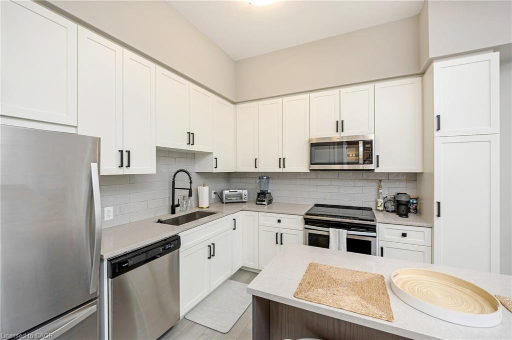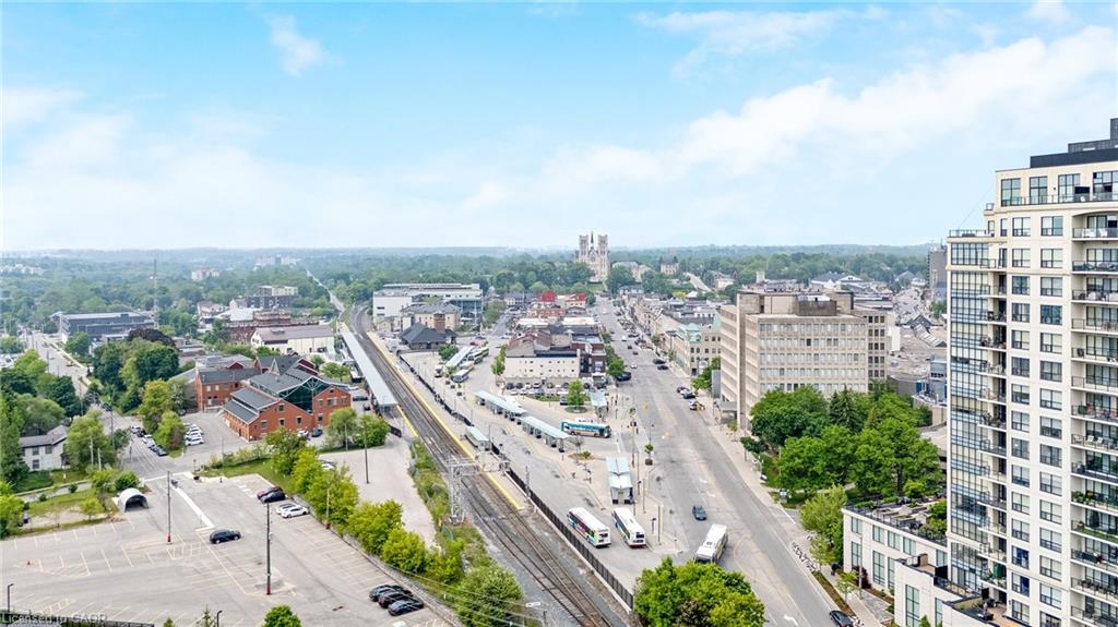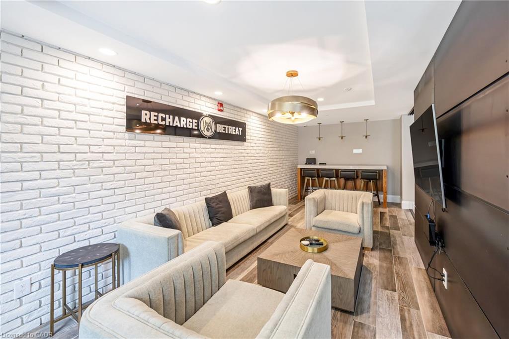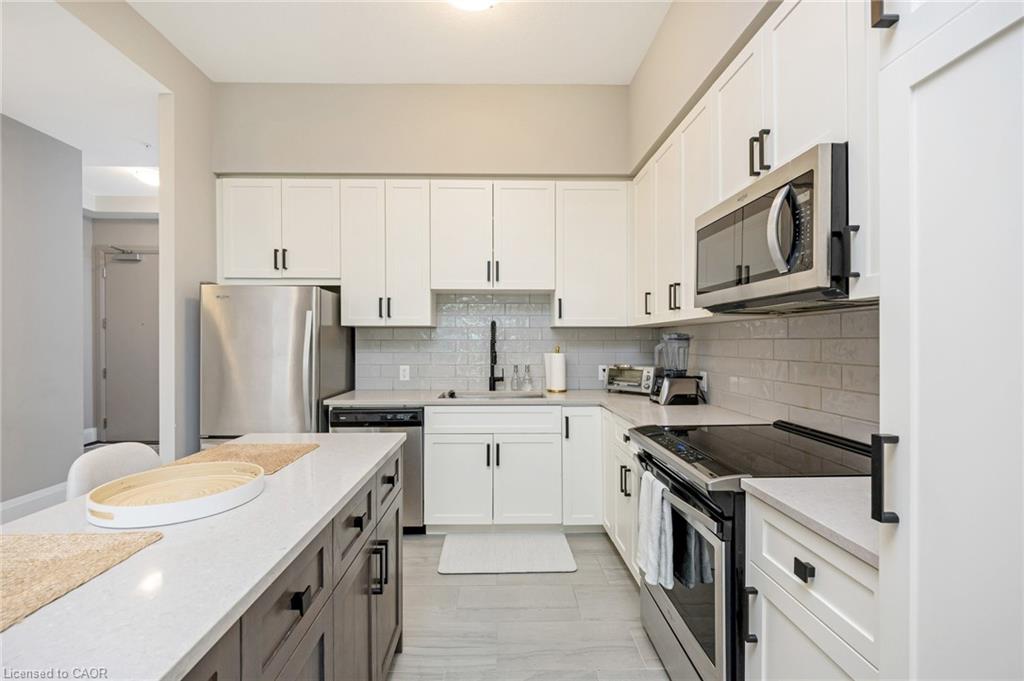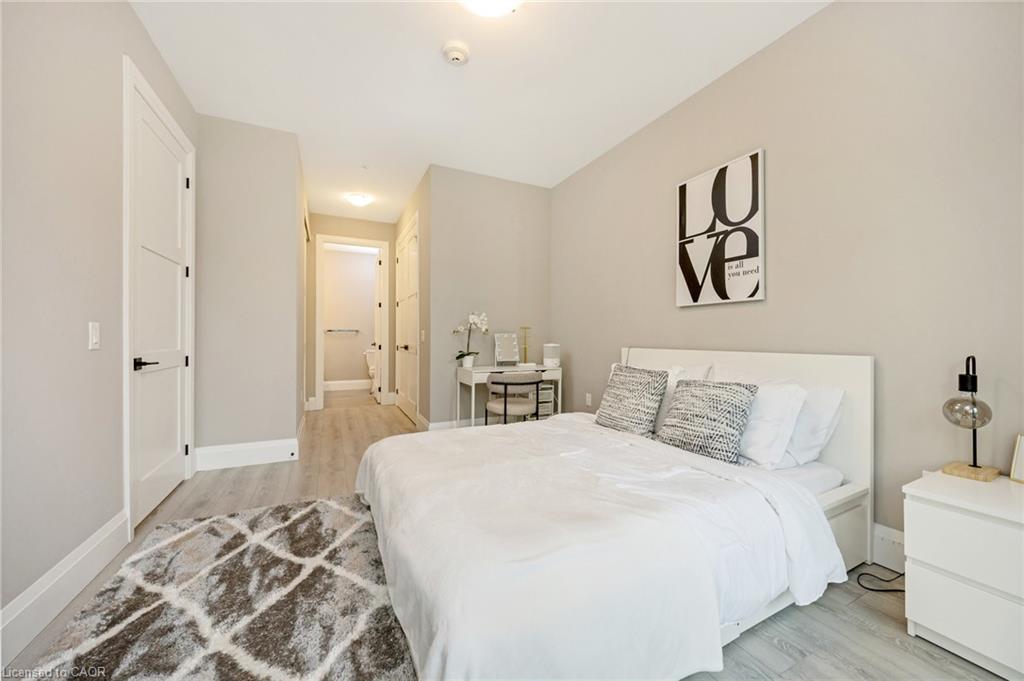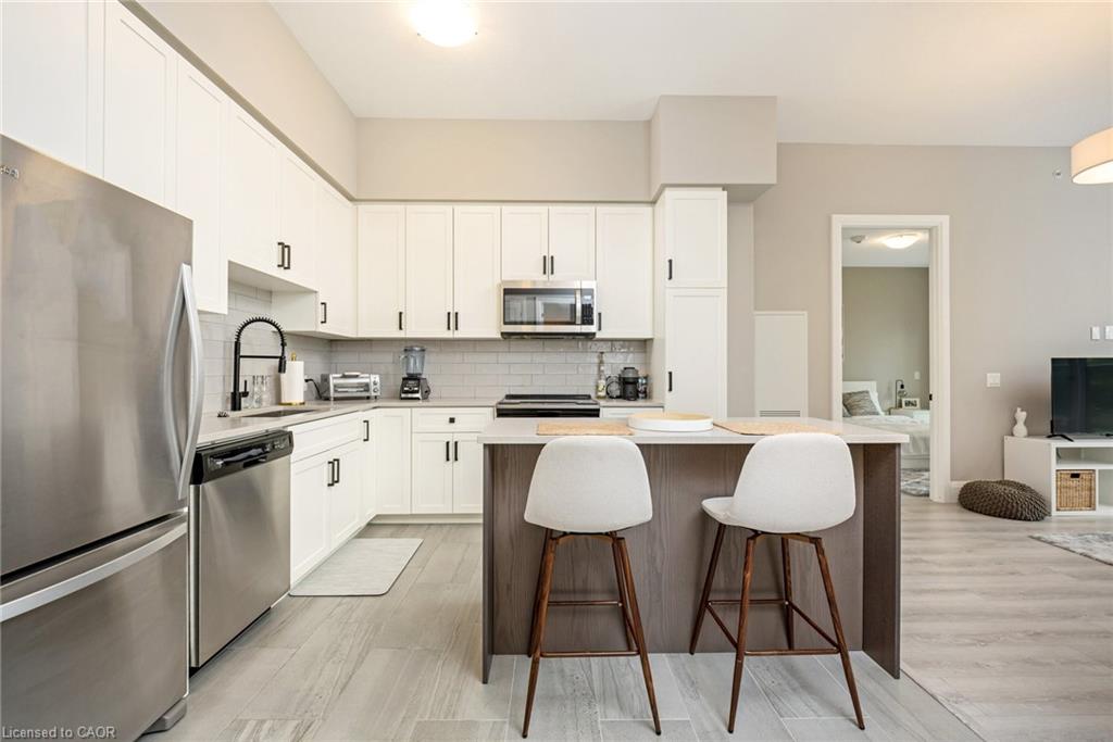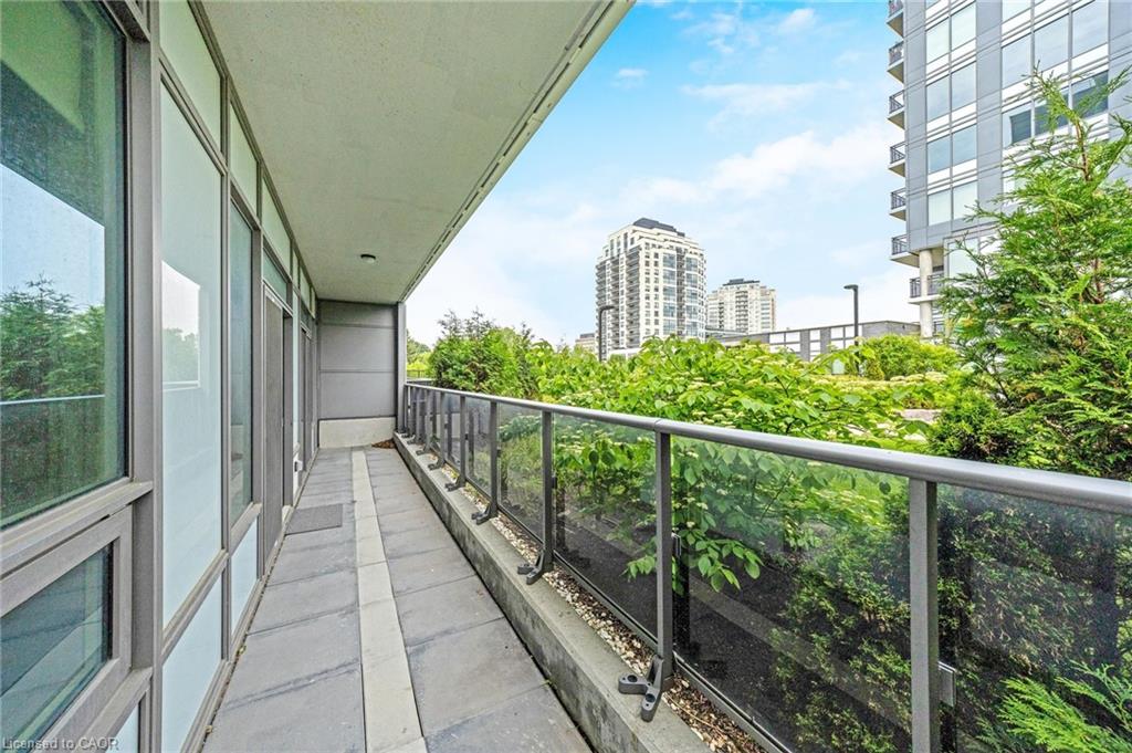 Stunning 2 bdrm & 2 bth, 1040sf condo w a massive balcony adding 195sf of outdoor pleasure. Located on the Mezzanine level (2nd floor) this unit has expansive views of the thoughtfully designed Metalworks-Copper Club ext common space. BBQ stations, outdoor lounge & dining areas, artificial grass games area for Bocce or other games & an outdoor gas fire pit, complete w Adirondack chairs! The expansive foyer graciously welcomes you into this breathtaking unit! A rarely offered super functional layout with soaring 9.5-10.5 foot ceilings, oversized int doors, custom blinds, upgd cabinetry, upgd fixtures, upgd baseboard and trim work, quartz countertops, textured oversized subway tile bksplsh, 12″X24″flr tiles& luxury vinyl laminate floors. Int was professionally designed to elevate your living experience! The Primary bedroom has both a generous sized walk-in & dbl closet which leads to the spa-inspired 3 pc ensuite. A sliding door leads you from the Primary to the apprx 30′ long balcony where you can enjoy 3 season entertaining. The balcony is surrounded by shrubbery & plantings to provide you with ultimate privacy. The 2nd bdrm (orden) on the opposite side of the condo affords you or your guests privacy & is adjacent to the main 4 pc bath. This bdrm/den has an oversized window, custom blinds & dbl closet. The Copper Club has exec townhouse units that face the Speed River & this unit abuts these high-end, multileveled towns offering a view to the river, the downtown core and a more peaceful location within the complex! This unit has an owned parking space & an owned storage locker. There is bldg bike storage in the garage level. The amenities in the Metalworks Copper Club are second to none…Library, Games Area, the Speakeasy concealed beyond an unmarked door, WIFI Lounge, Fireside Lounge, Dog Wash, Guest Suite! All of this & only a short walk to parks, restaurants, downtown Guelph the Sleeman’s Centre & more. A standout residence not to be missed!