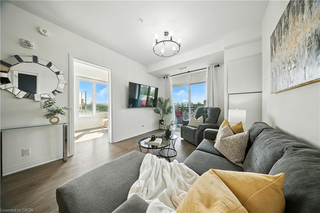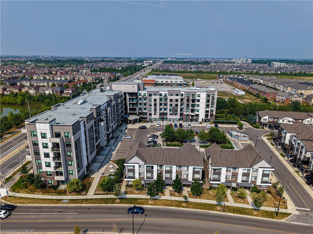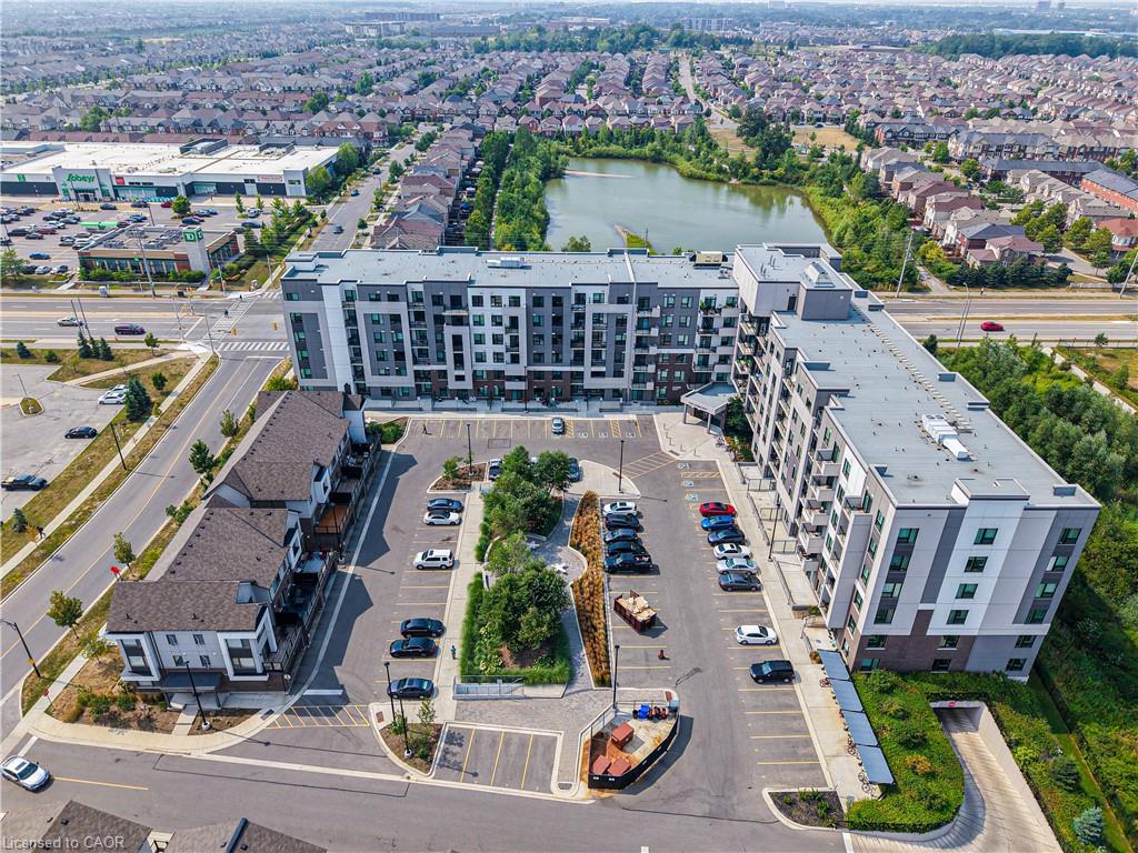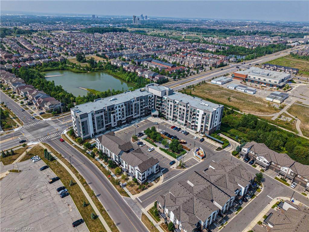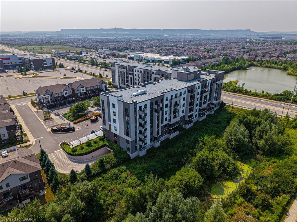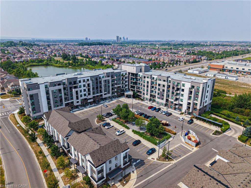Stylish & sun-filled 2 bed, 2 bath condo in the highly desirable Ford neighbourhood of Milton! This open-concept unit features high ceilings, large windows, and floor-to-ceiling patio doors that flood the space with natural light. Enjoy upgraded wide plank flooring, quartz countertops, stainless steel appliances, tile backsplash, and a breakfast bar. Primary suite includes a walk-in closet and upgraded ensuite with a super shower. Includes owned underground parking & locker on same level. Overlooks a peaceful pond with escarpment views. Steps to shops, schools, transit & highways. Turn-key living at its best!
