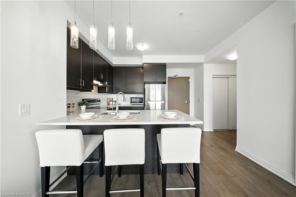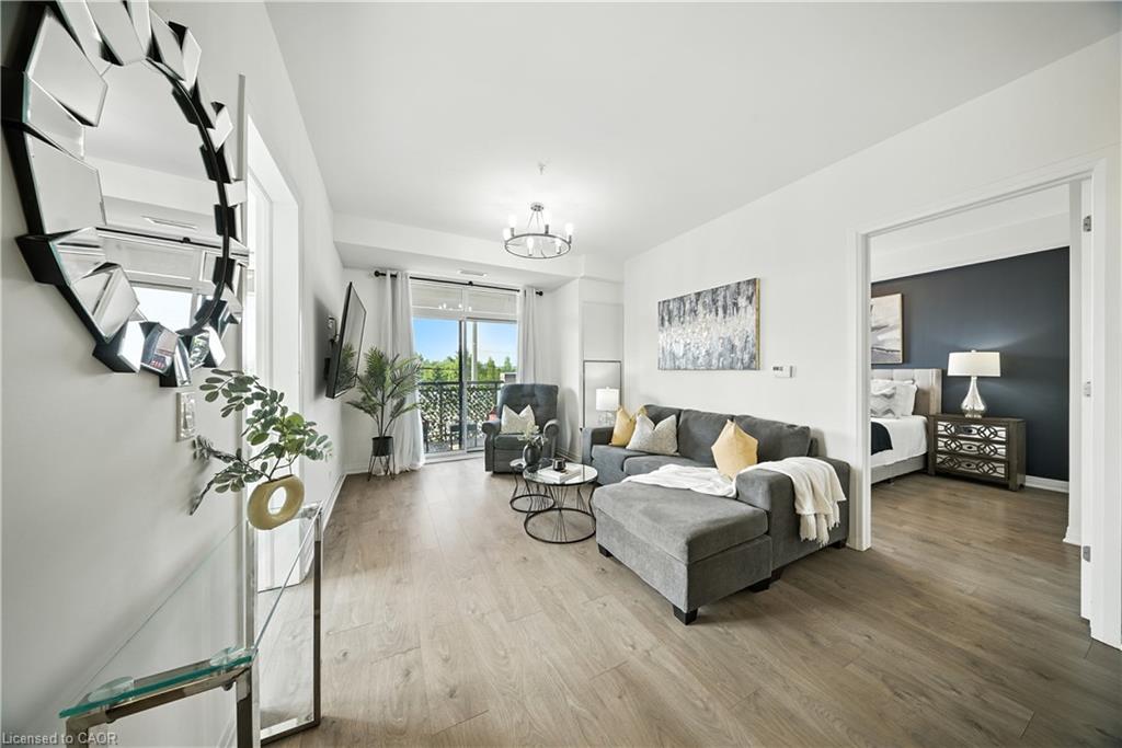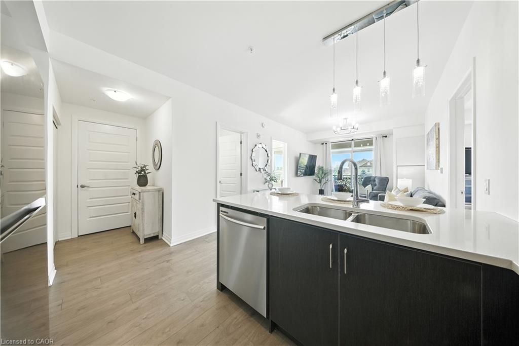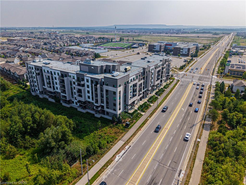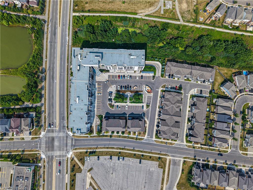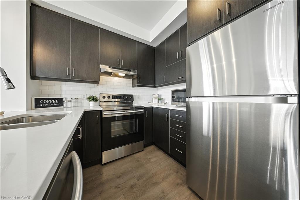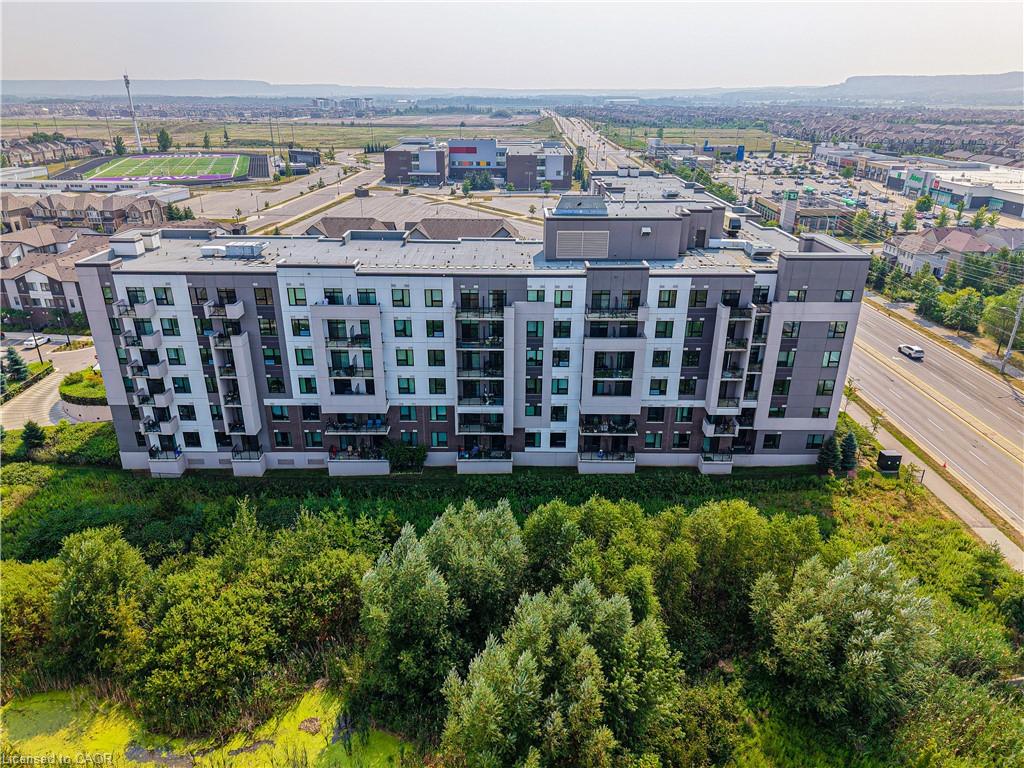 Stylish & sun-filled 2 bed, 2 bath condo in the highly desirable Ford neighbourhood of Milton! This open-concept unit features high ceilings, large windows, and floor-to-ceiling patio doors that flood the space with natural light. Enjoy upgraded wide plank flooring, quartz countertops, stainless steel appliances, tile backsplash, and a breakfast bar. Primary suite includes a walk-in closet and upgraded ensuite with a super shower. Includes owned underground parking & locker on same level. Overlooks a peaceful pond with escarpment views. Steps to shops, schools, transit & highways. Turn-key living at its best!