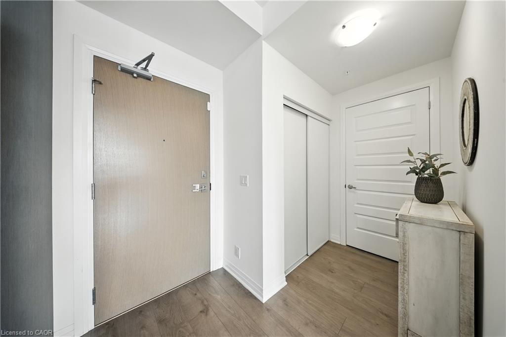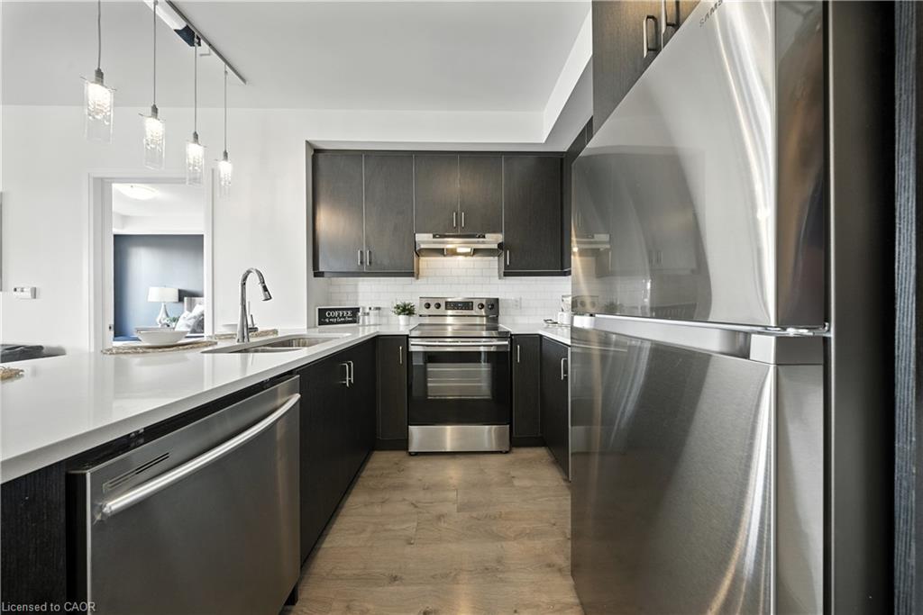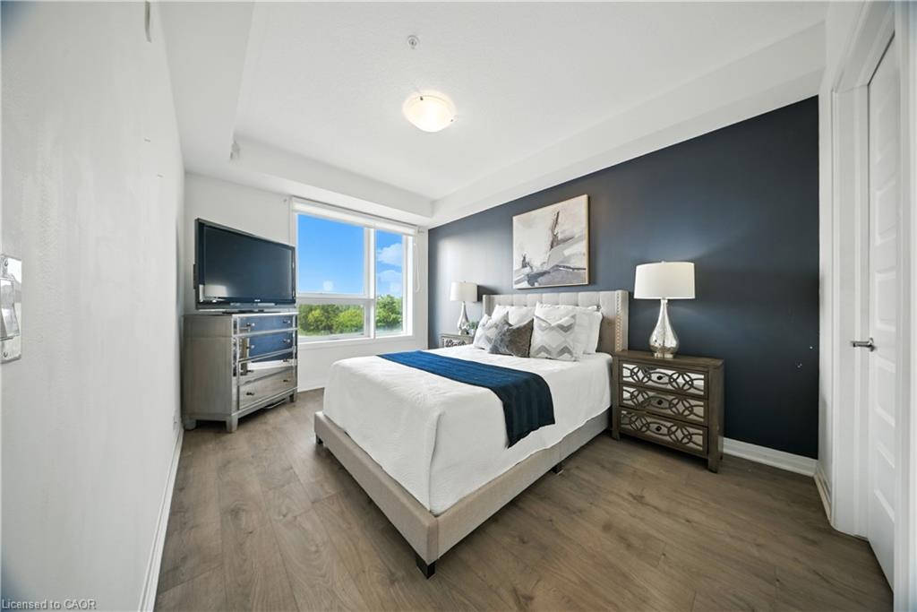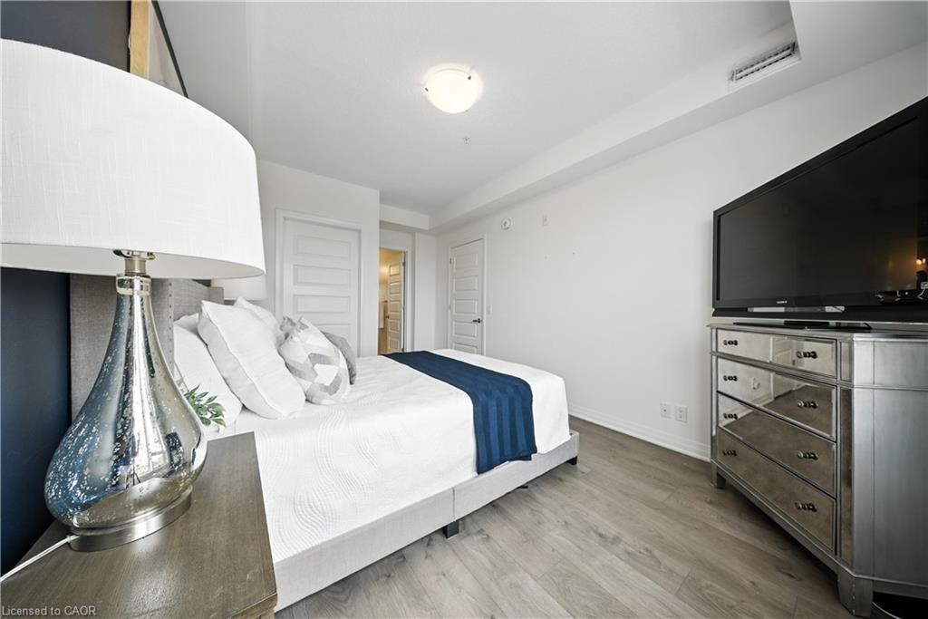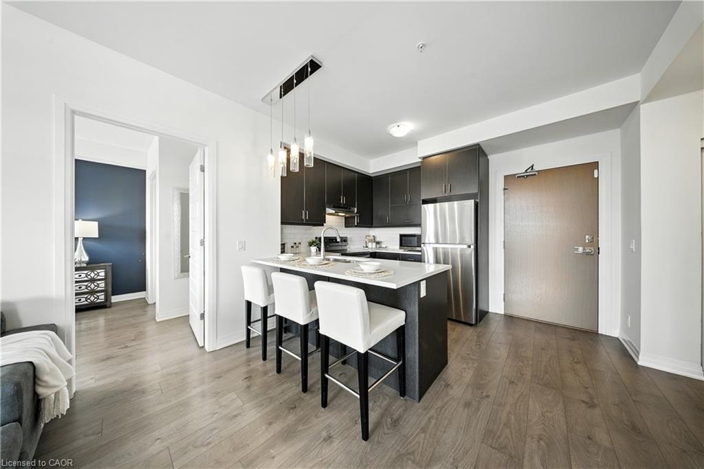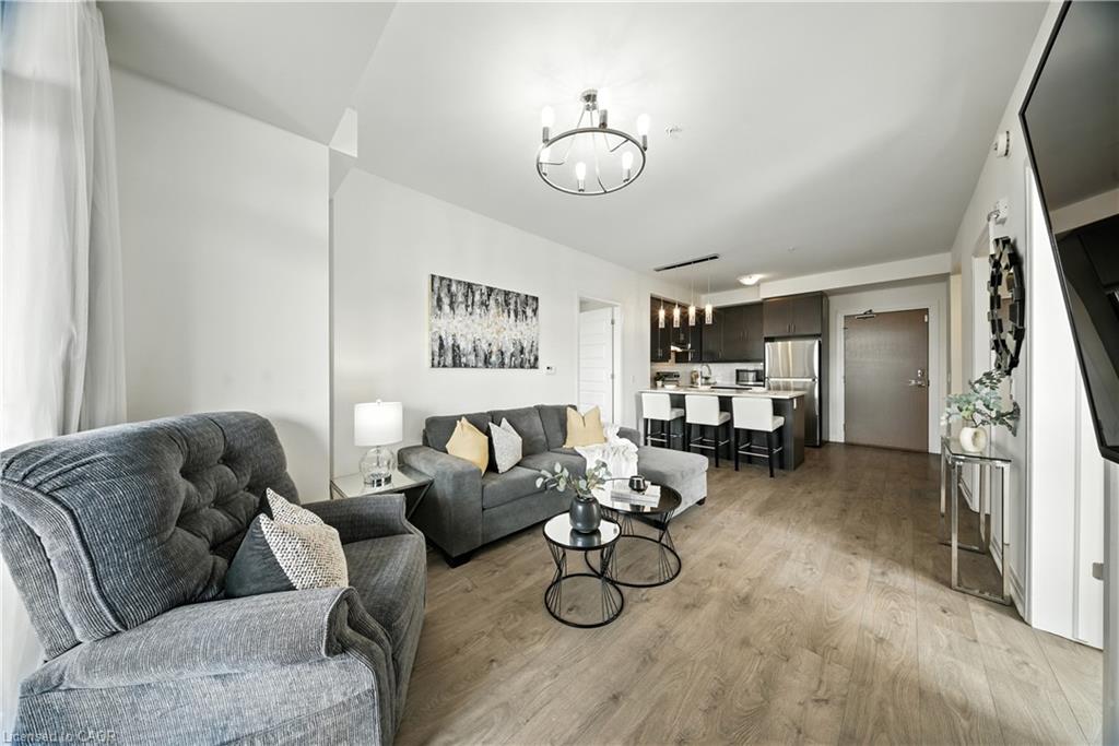 Stylish & sun-filled 2 bed, 2 bath condo in the highly desirable Ford neighbourhood of Milton! This open-concept unit features high ceilings, large windows, and floor-to-ceiling patio doors that flood the space with natural light. Enjoy upgraded wide plank flooring, quartz countertops, stainless steel appliances, tile backsplash, and a breakfast bar. Primary suite includes a walk-in closet and upgraded ensuite with a super shower. Includes owned underground parking & locker on same level. Overlooks a peaceful pond with escarpment views. Steps to shops, schools, transit & highways. Turn-key living at its best!